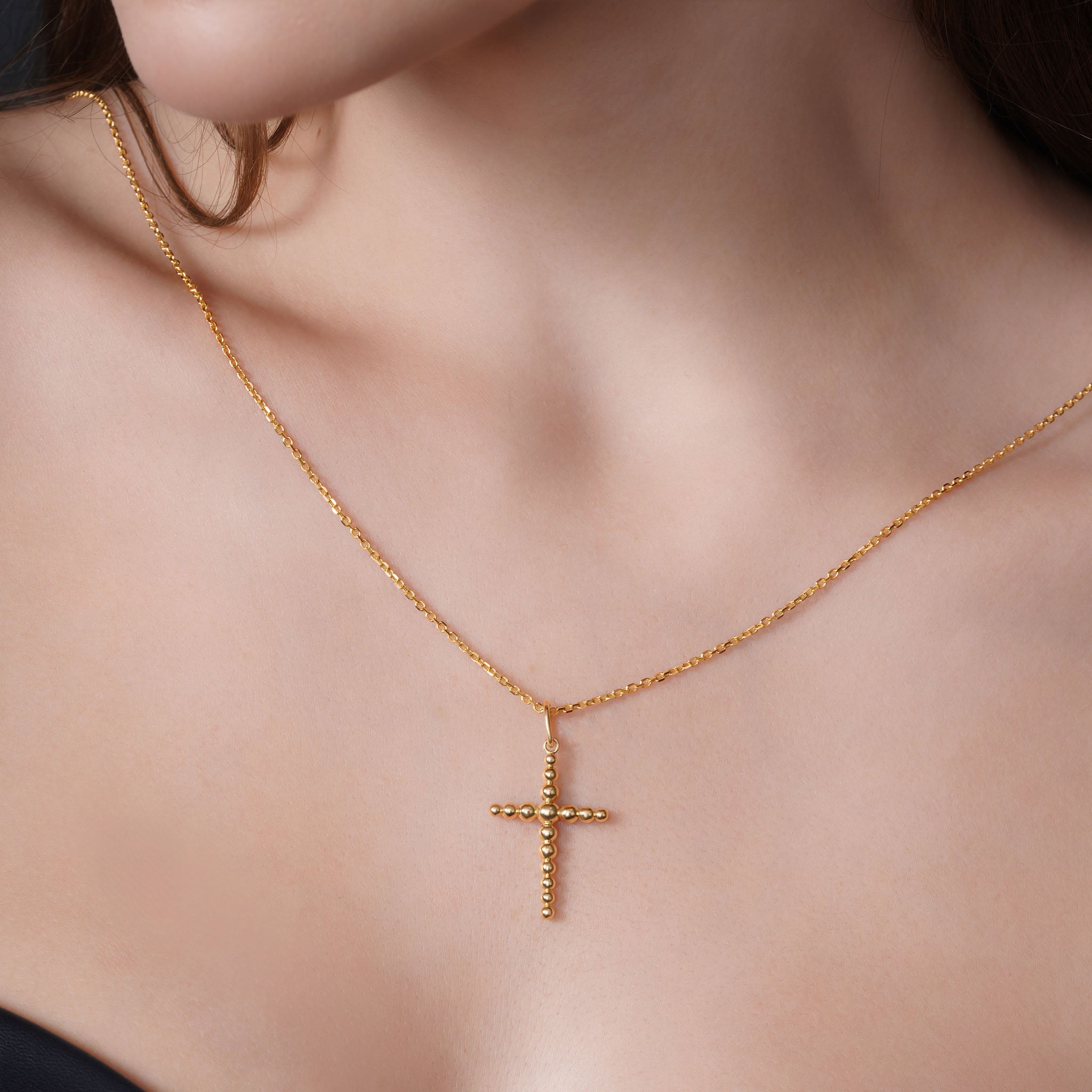 Our vermeil beaded cross necklace, features a cross formed entirely from polished bead-shaped links, creating a delicate texture that catches the light beautifully. This necklace is crafted from silver and plated with high quality 18k gold vermeil for a long lasting shine.