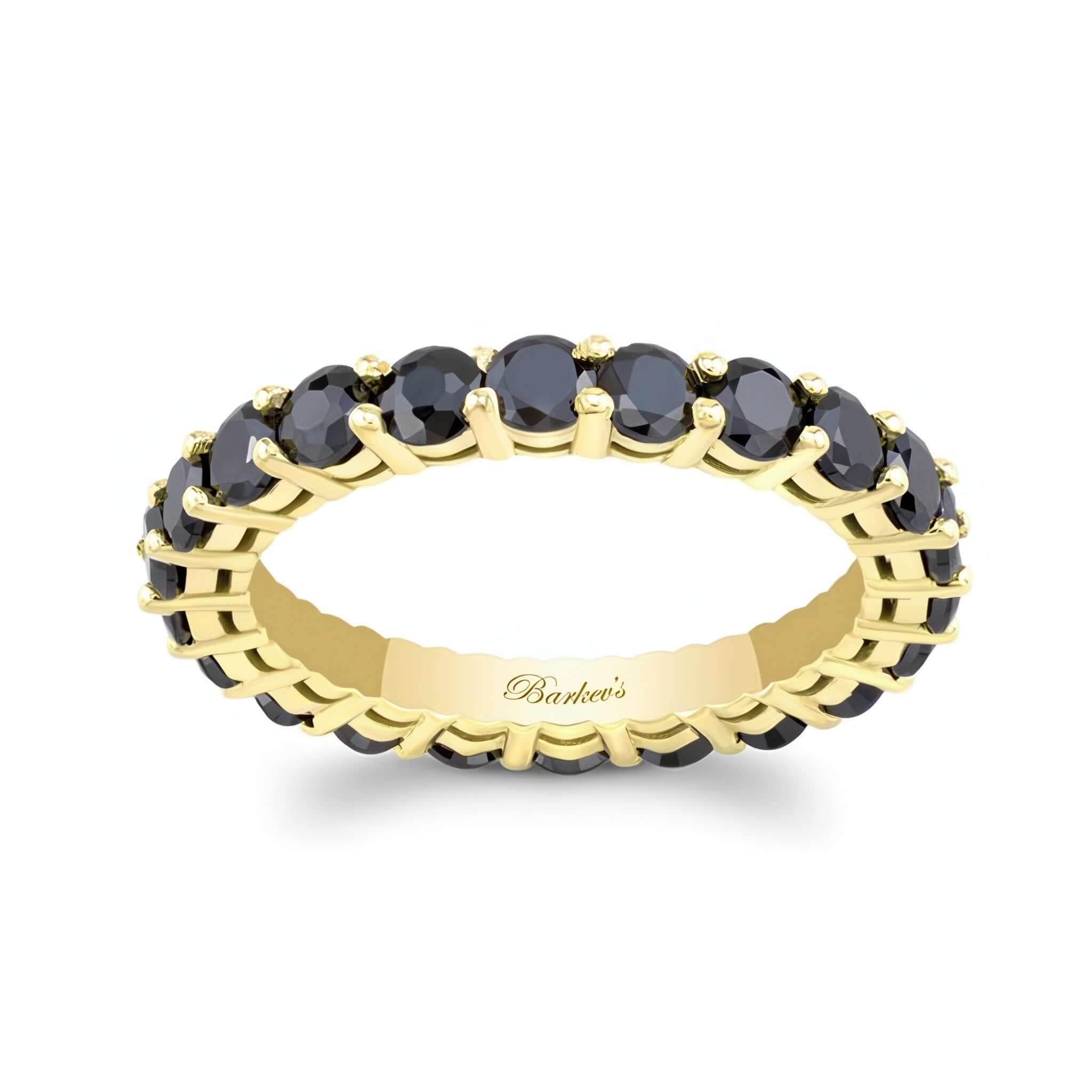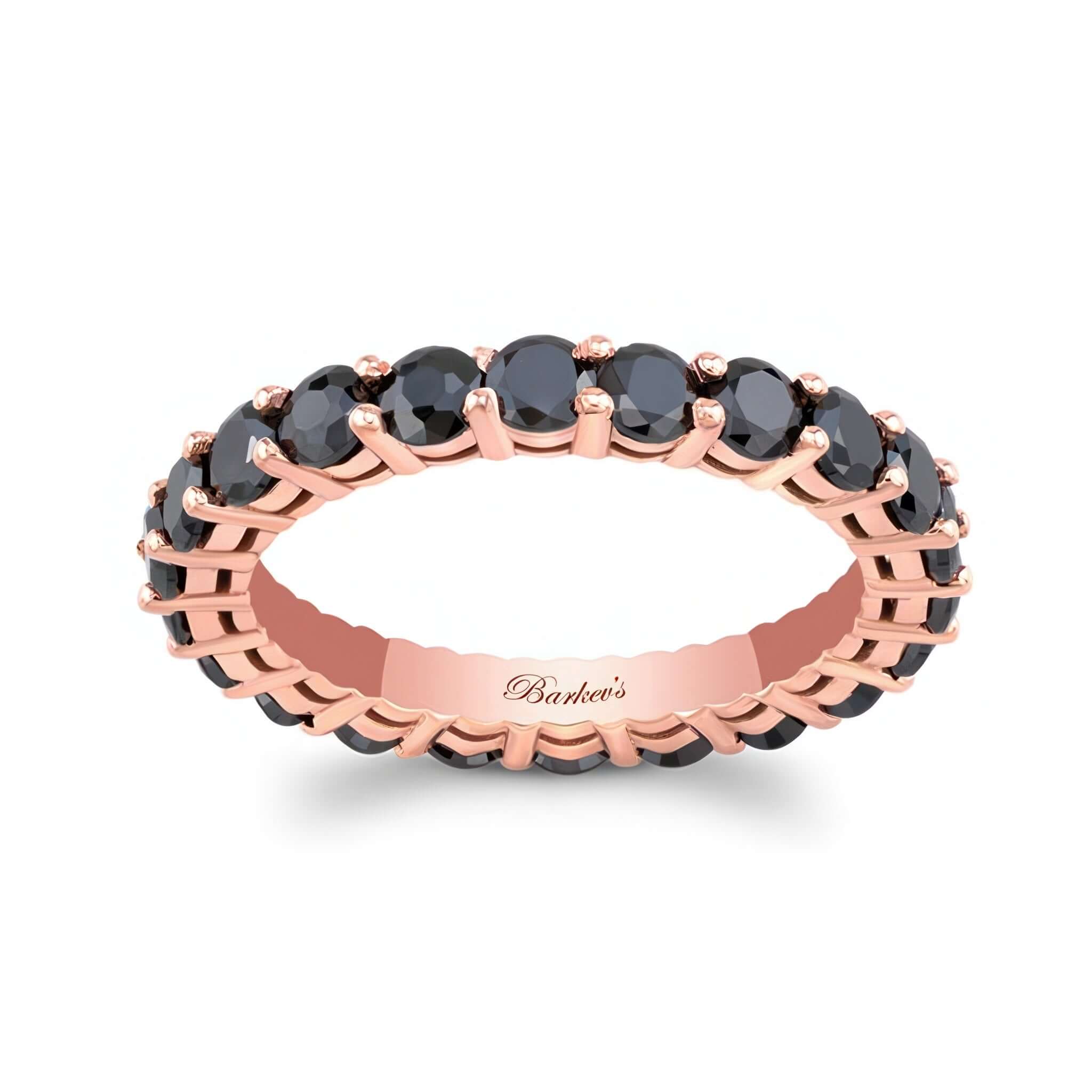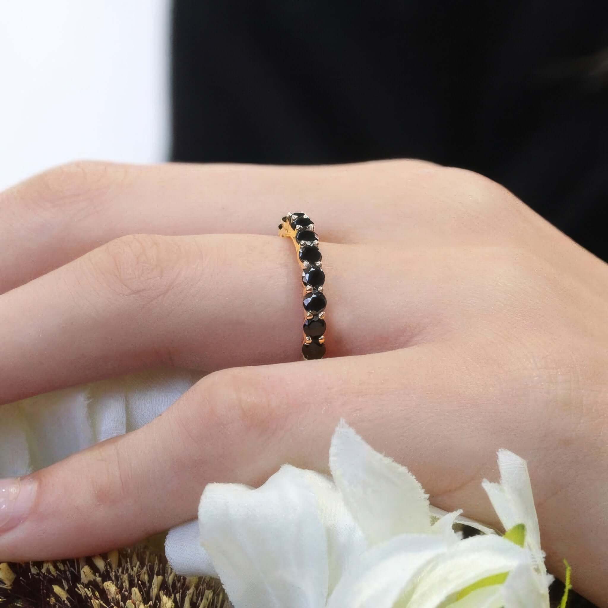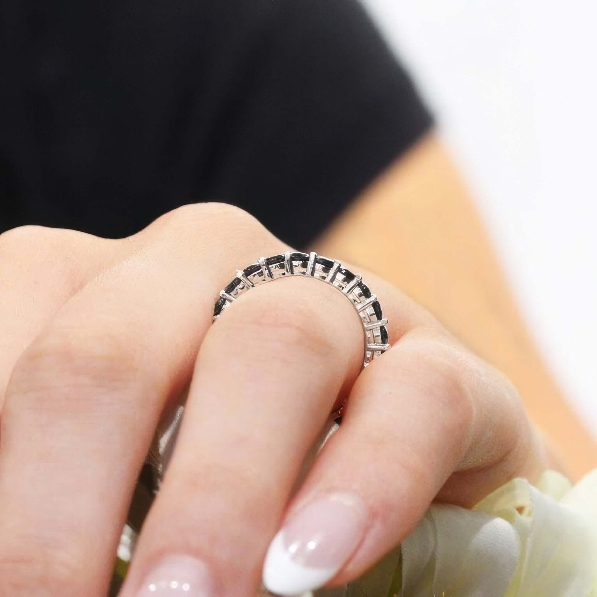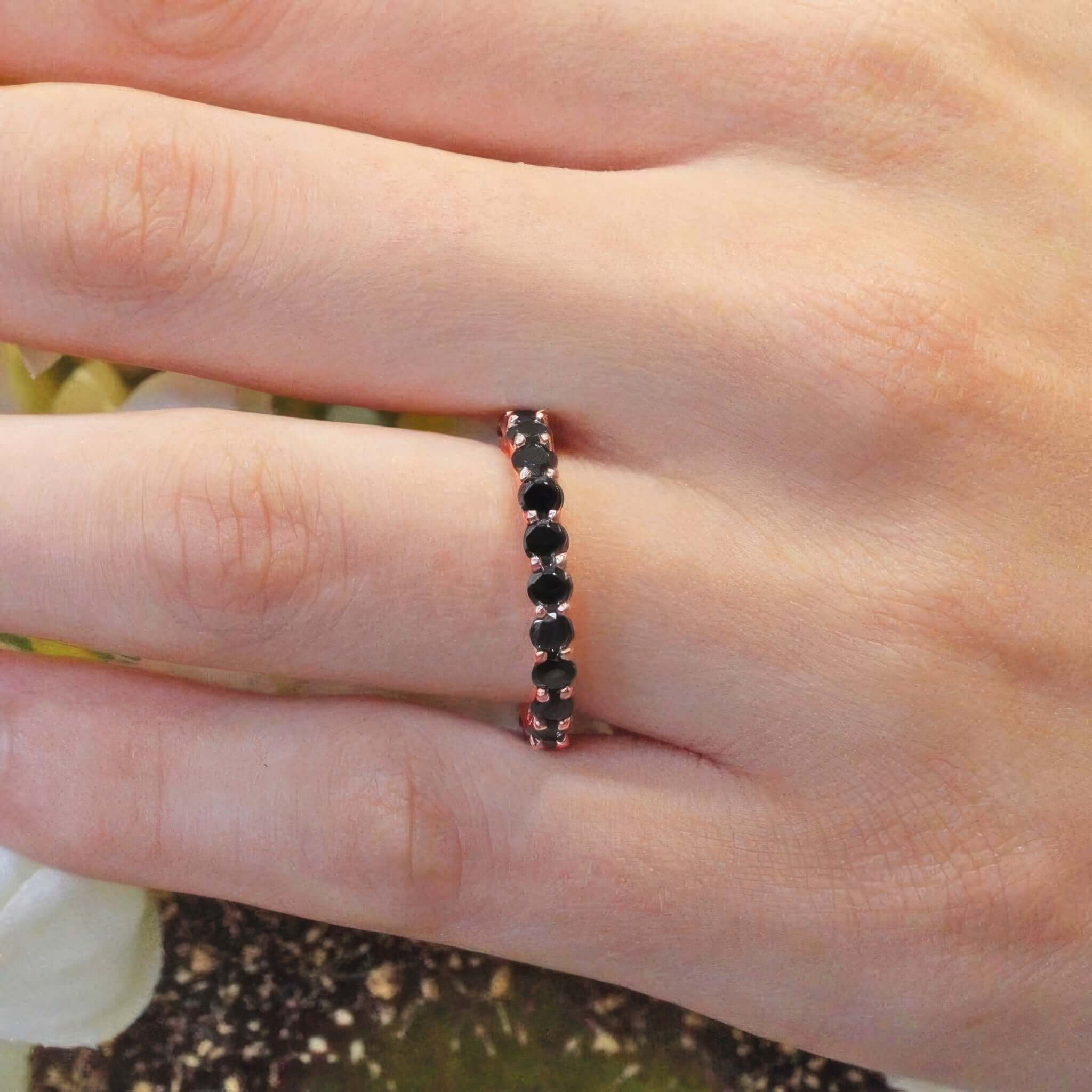 A 2 carat black diamond eternity band featuring shared prong set black diamonds