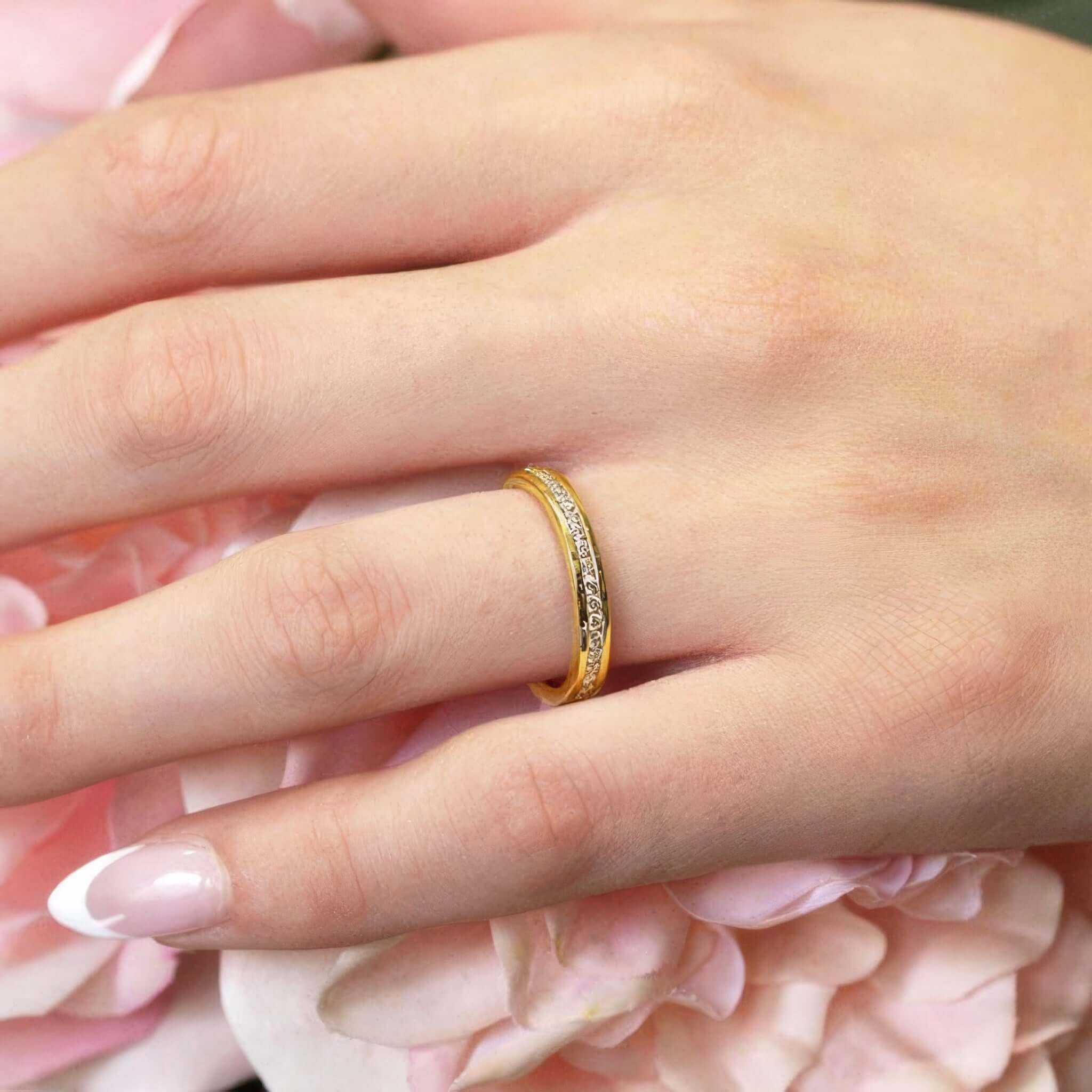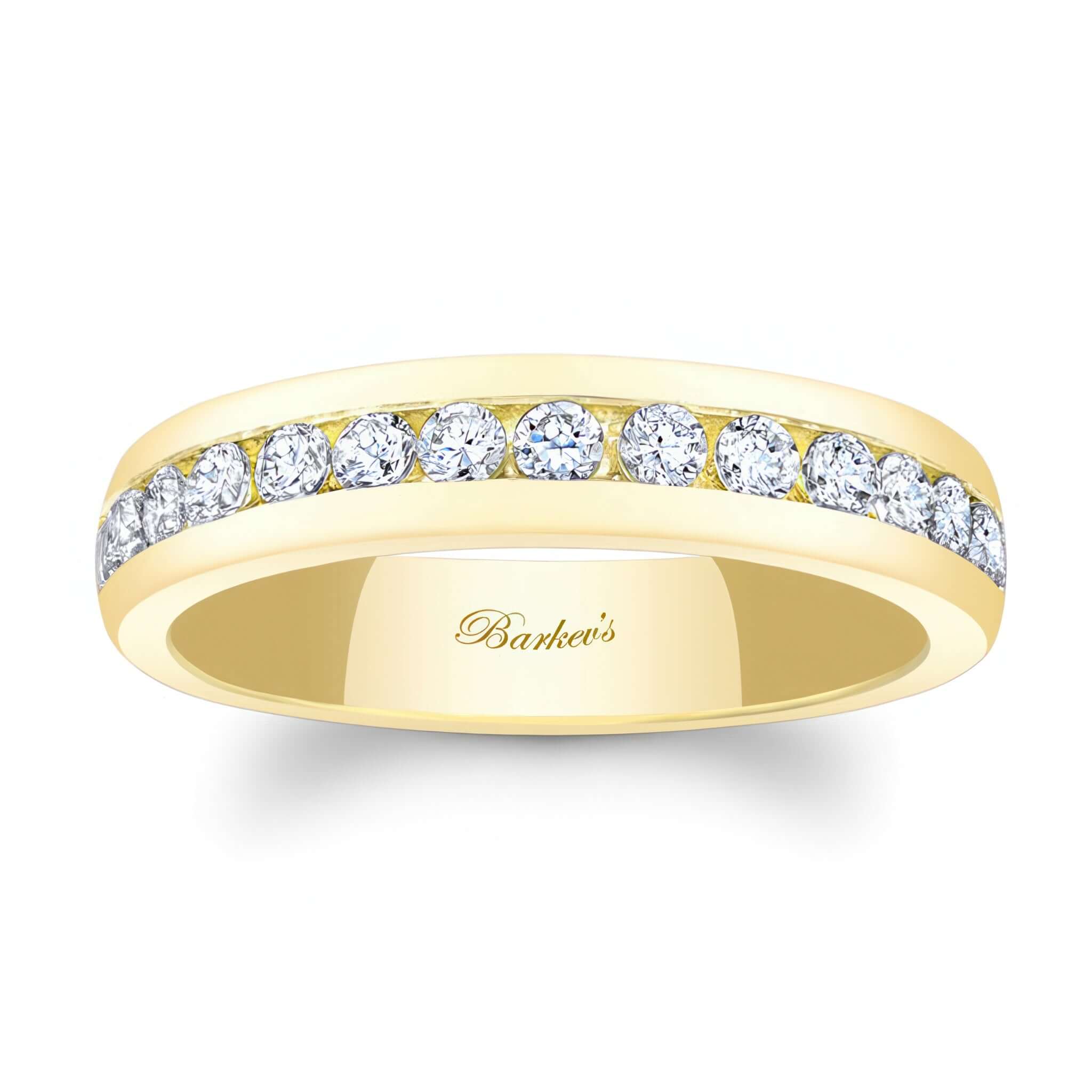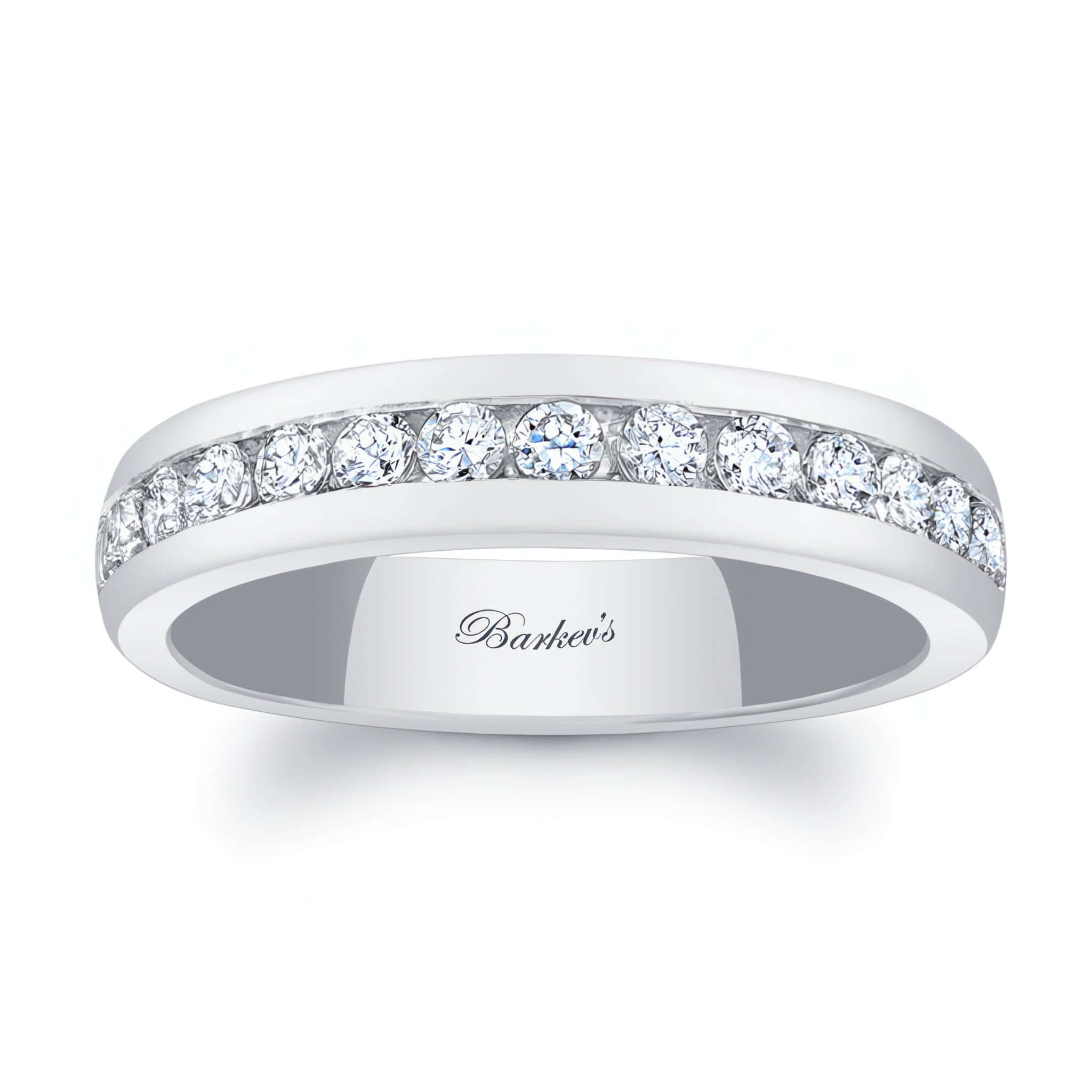 This channel set diamond wedding band features a 4mm wide band with a center trim channel set with diamonds for extra sparkle.