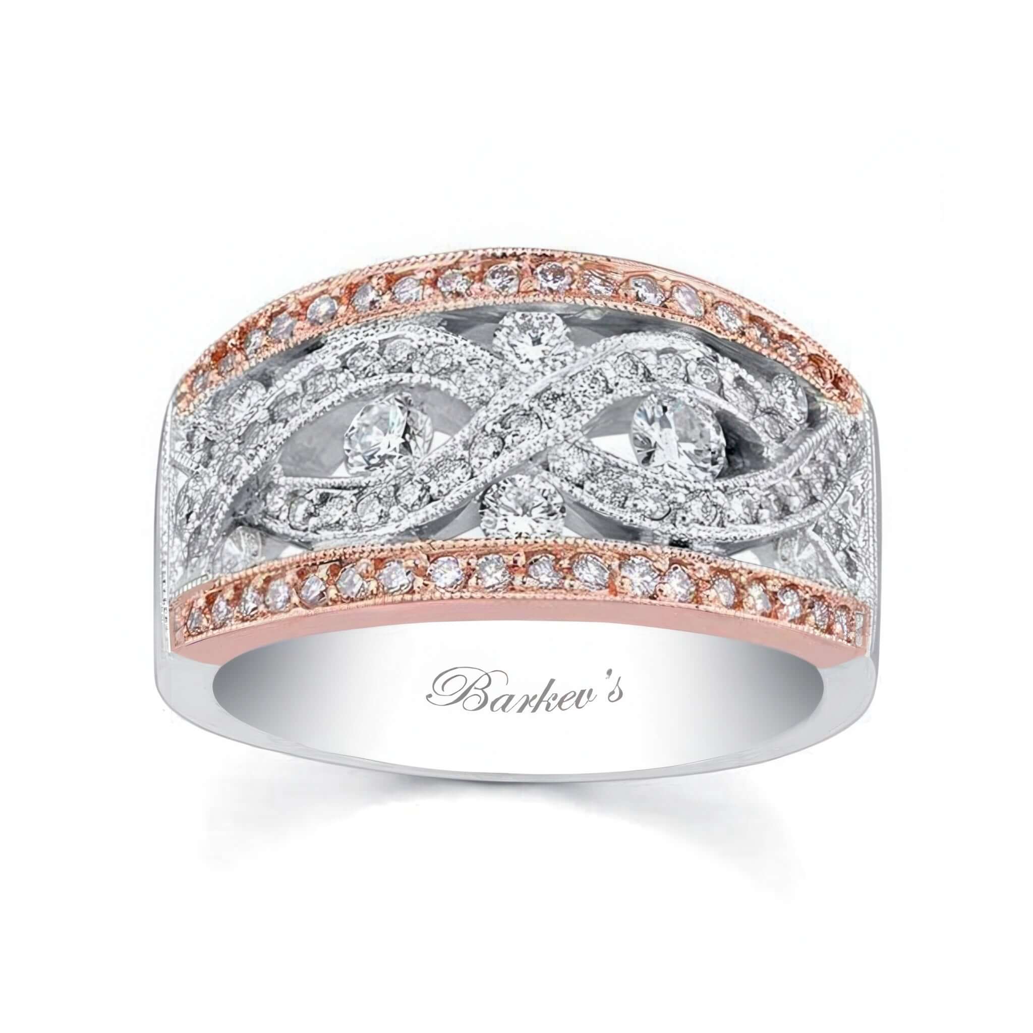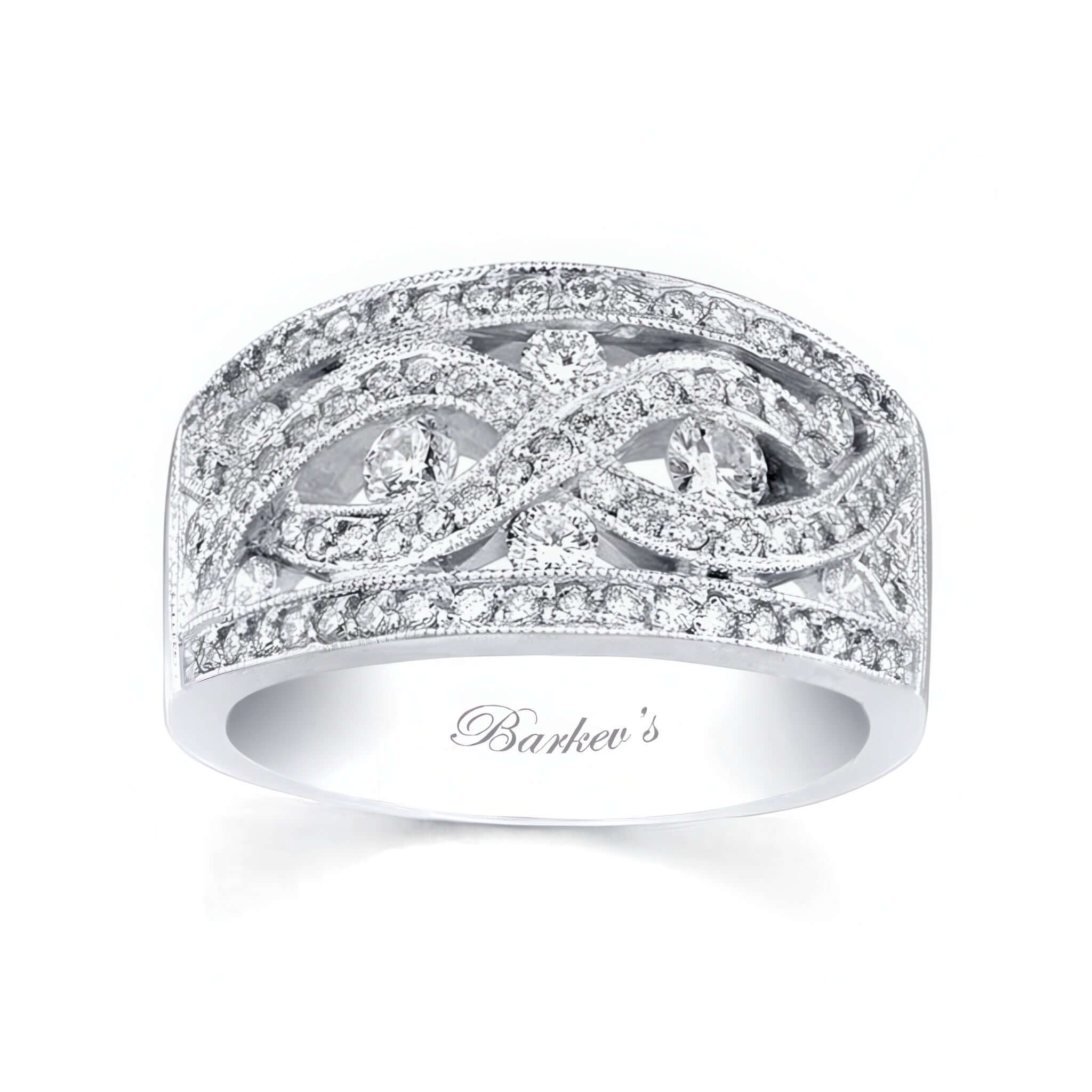 This antique wedding band features a center section adorned with pave and channel set diamonds while pave set diamonds rest on the outer ridges of the shank with a milgrain finish.