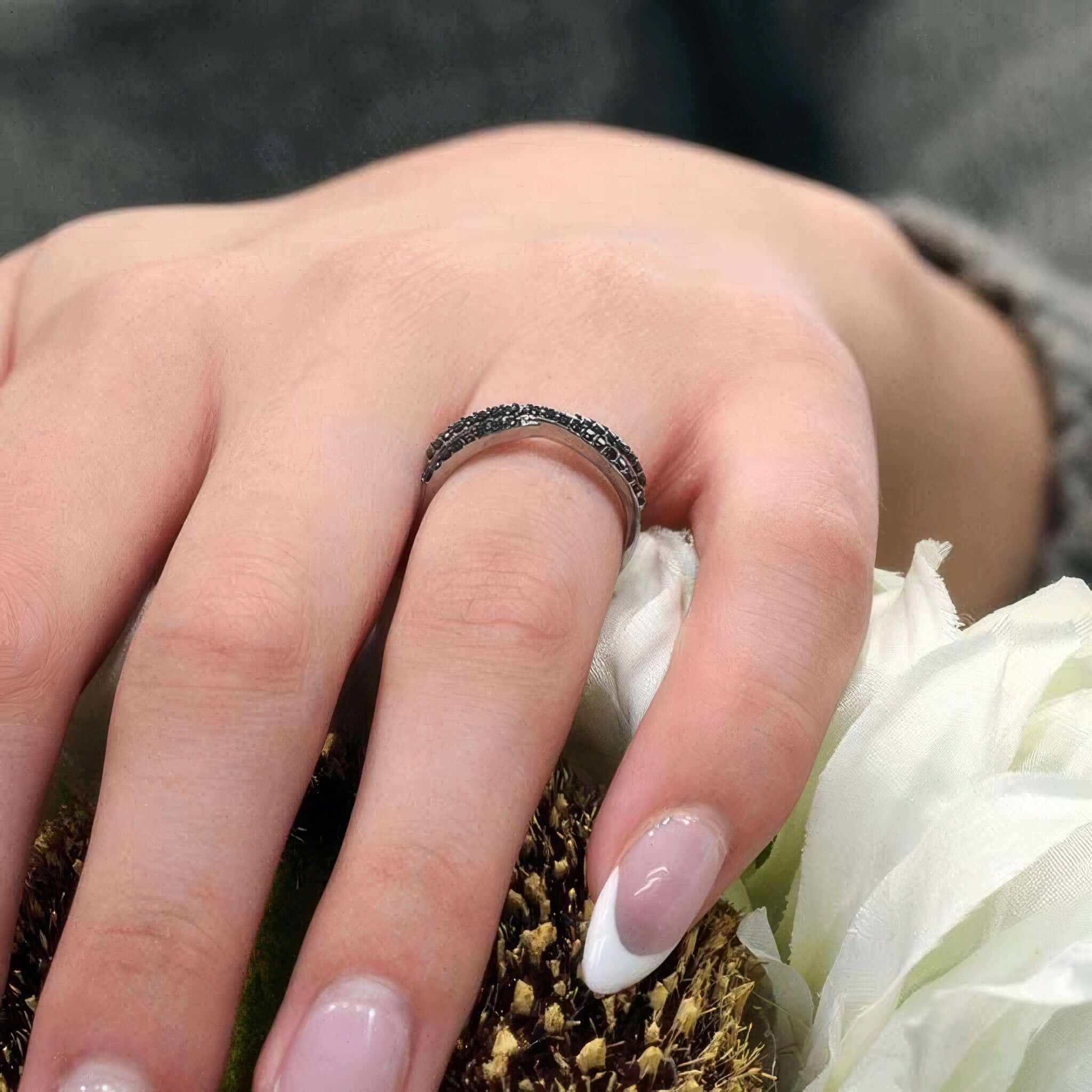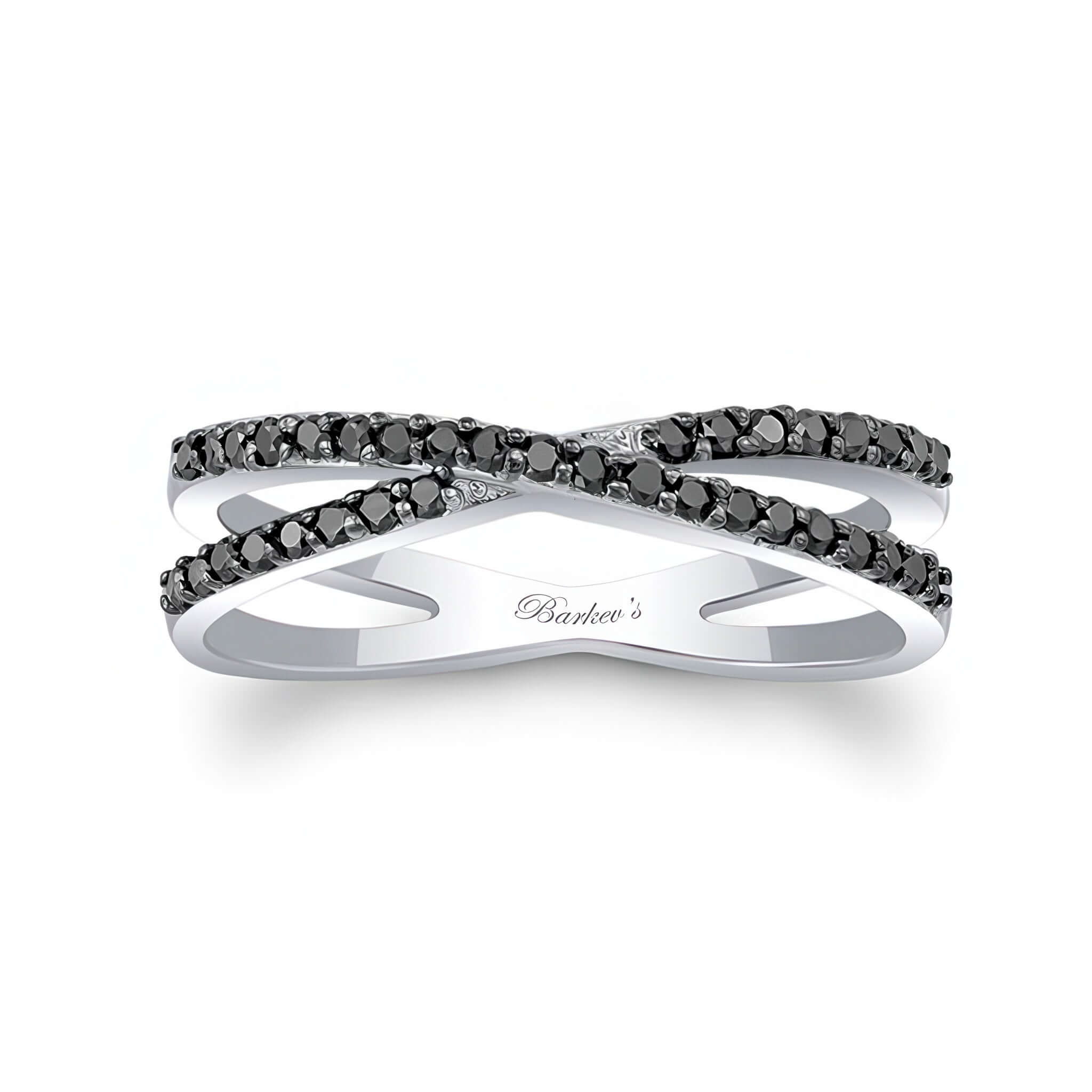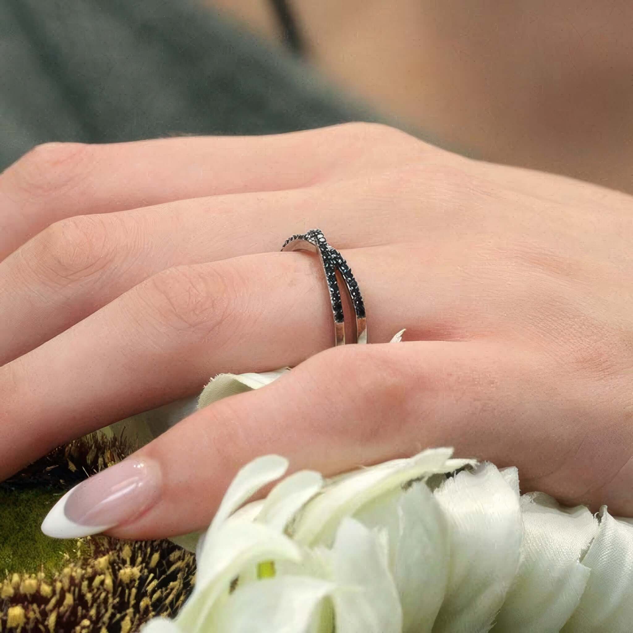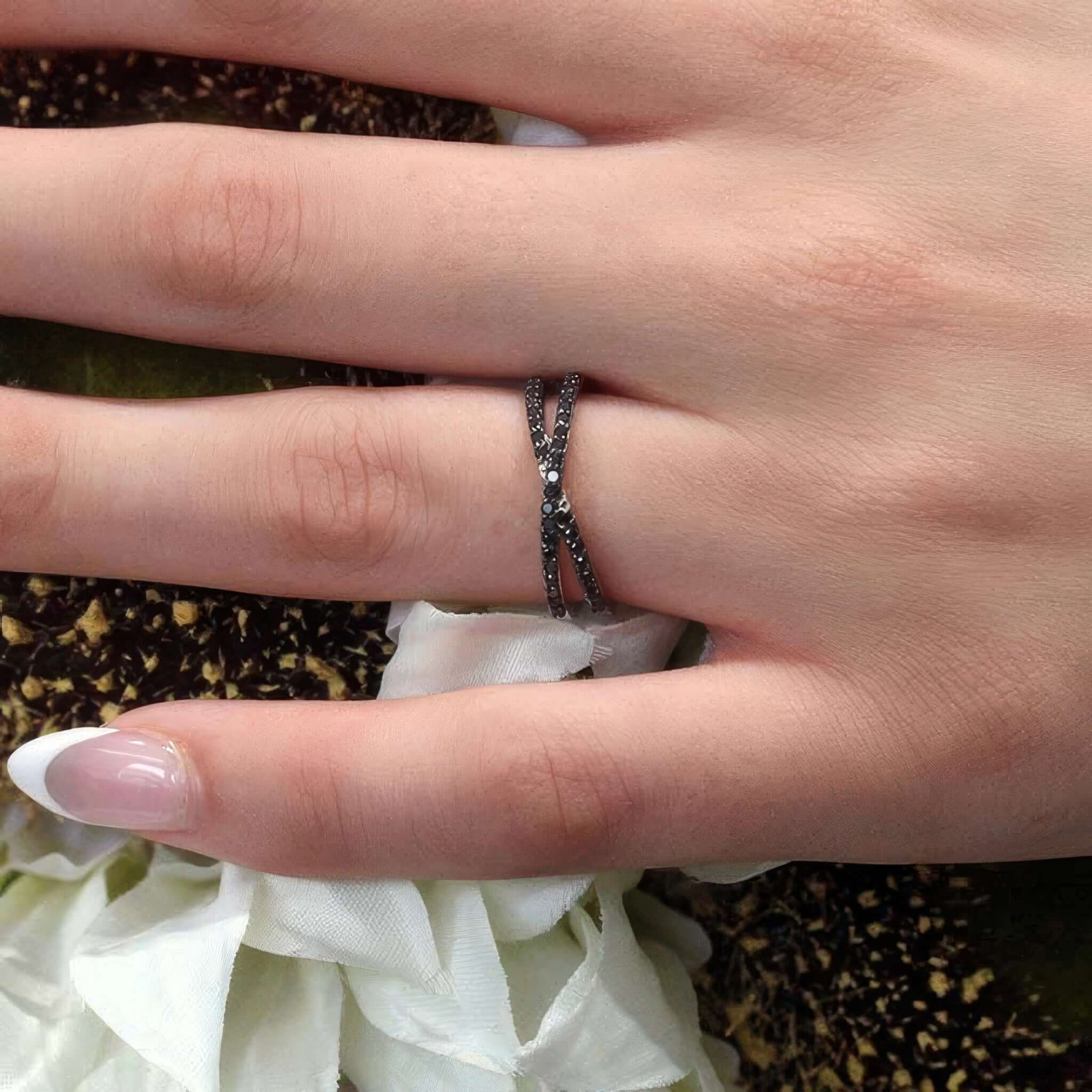 A beautiful criss cross black diamond promise ring featuring shared prong set black diamonds sitting on a gold band