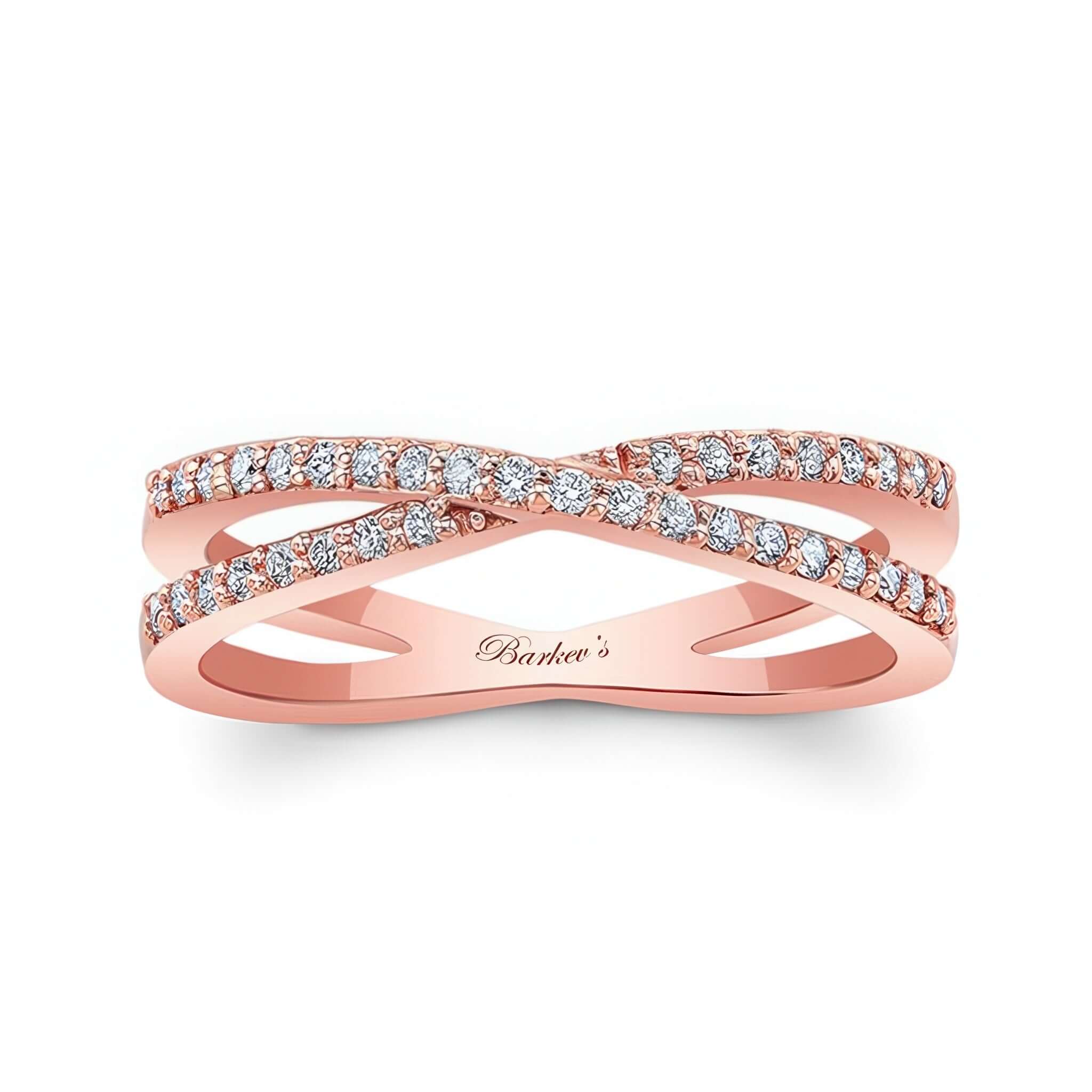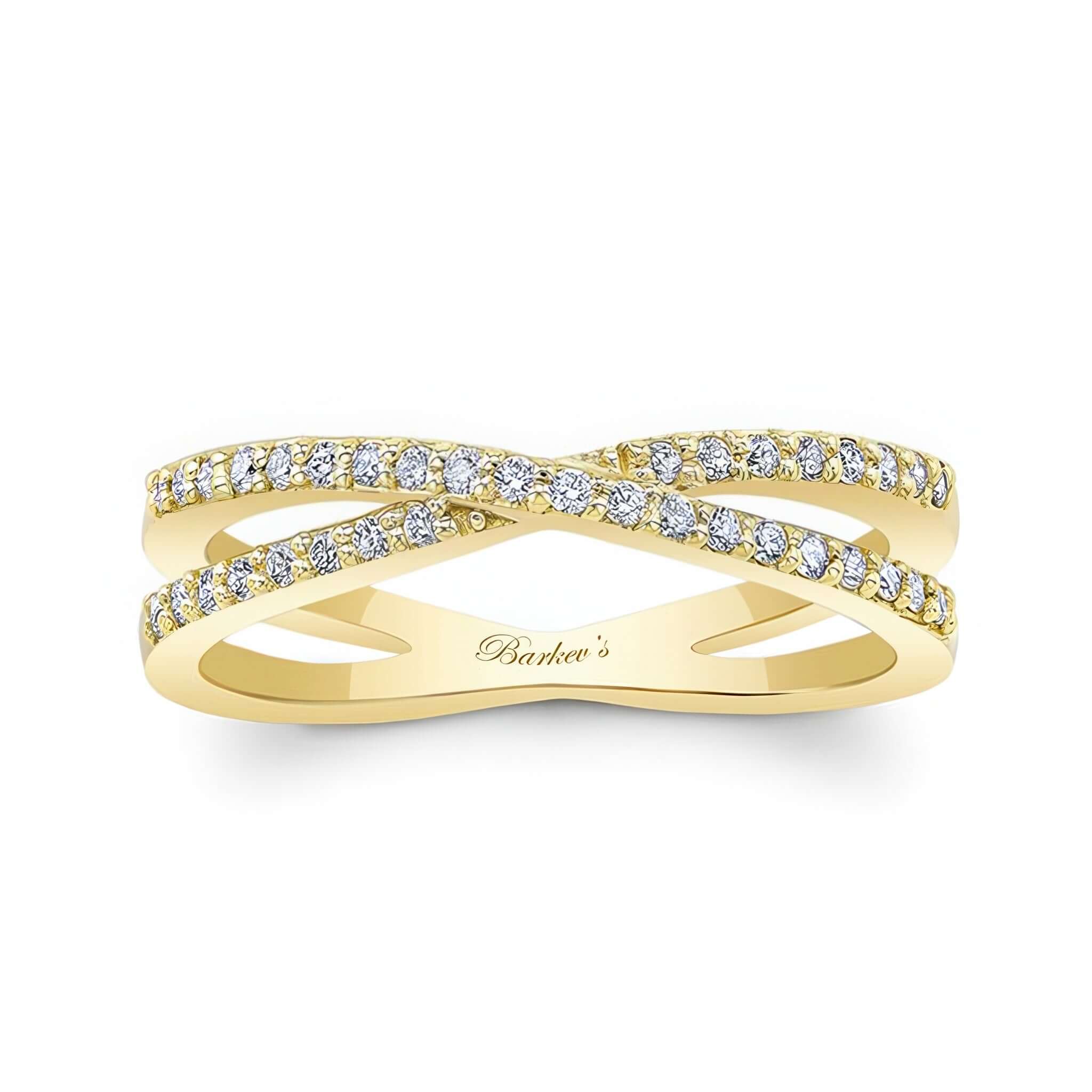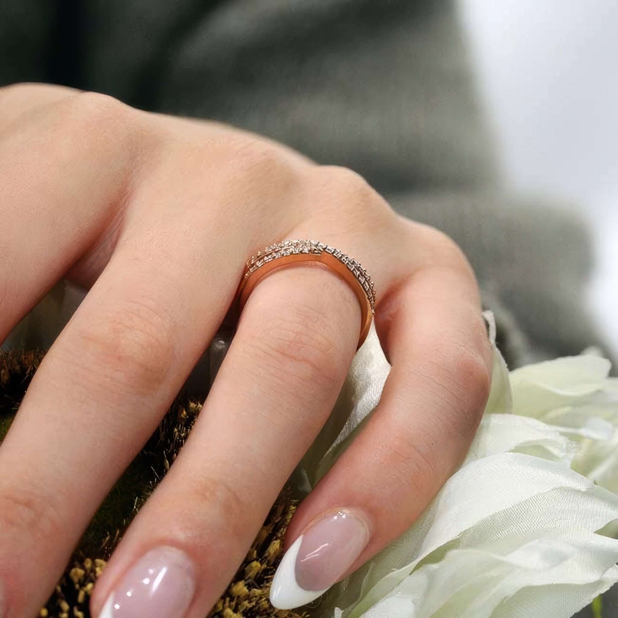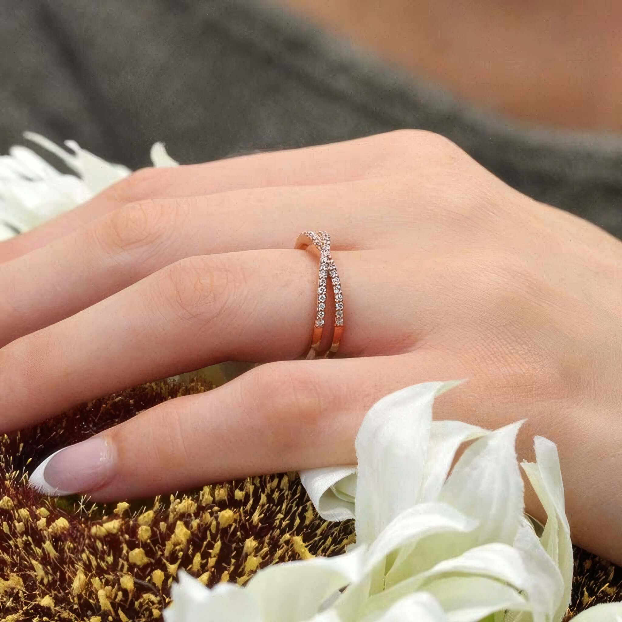 A beautiful criss cross diamond promise ring featuring shared prong set diamonds sitting on a gold band