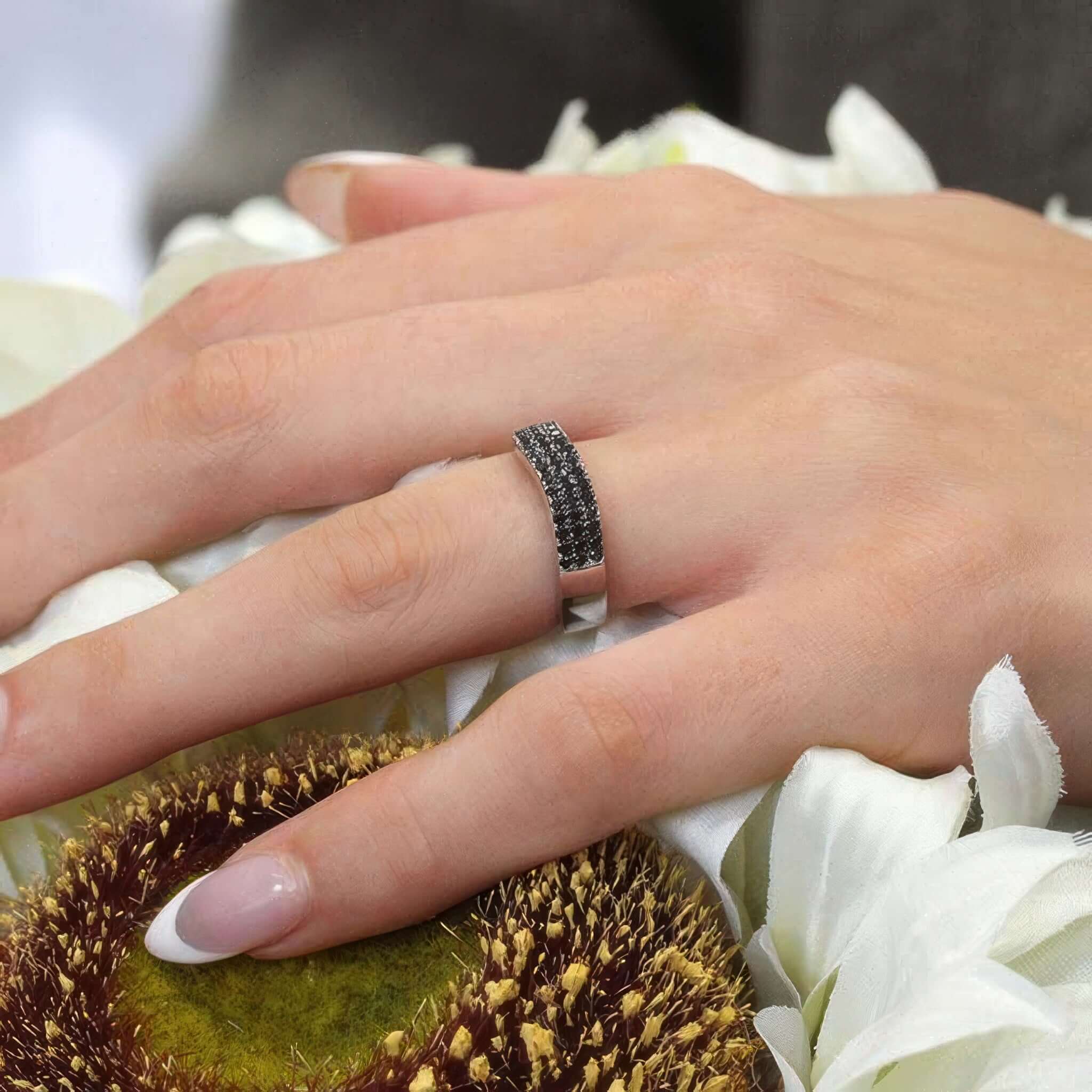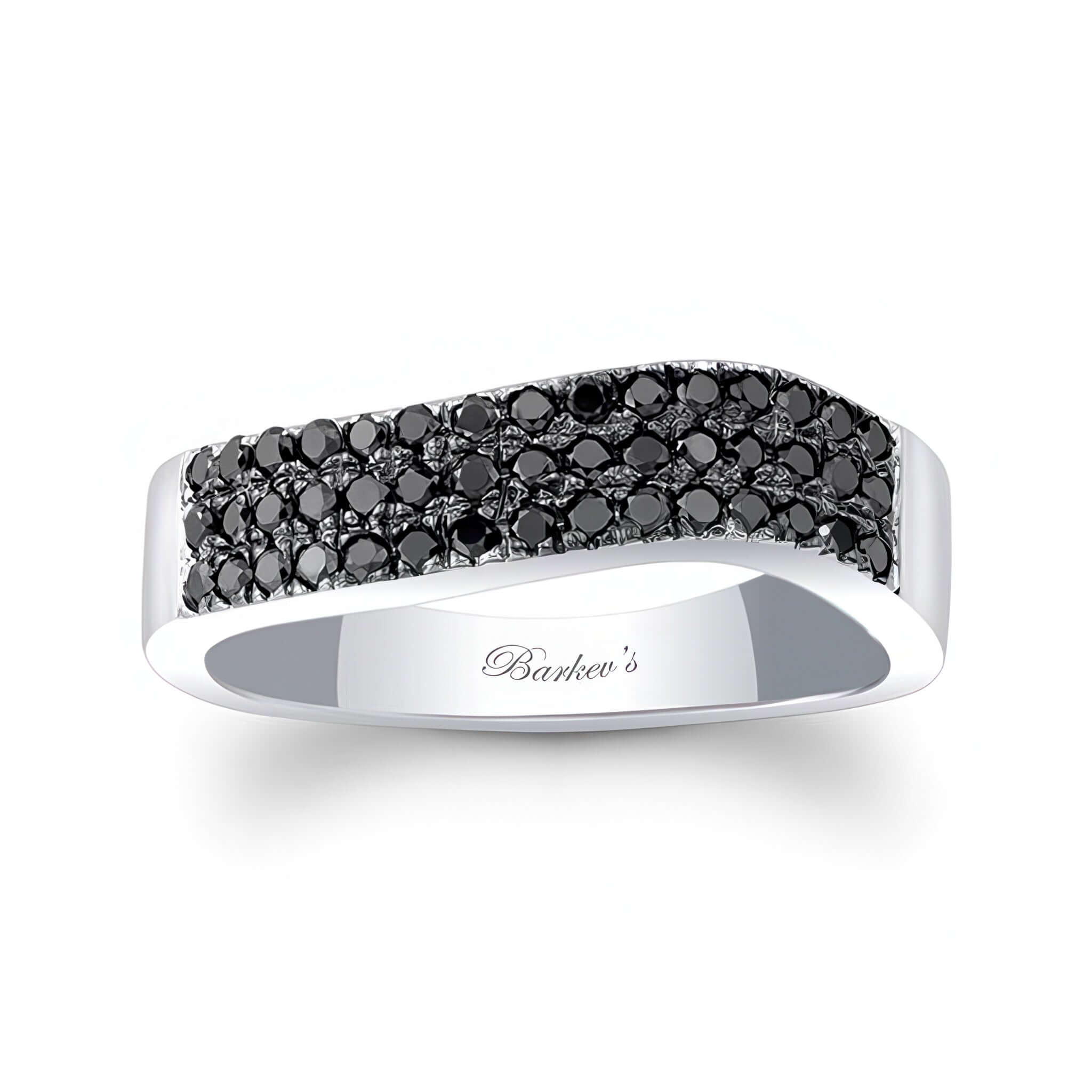 A beautiful curved black diamond wedding band featuring 3 rows of shared prong set black diamond melees.