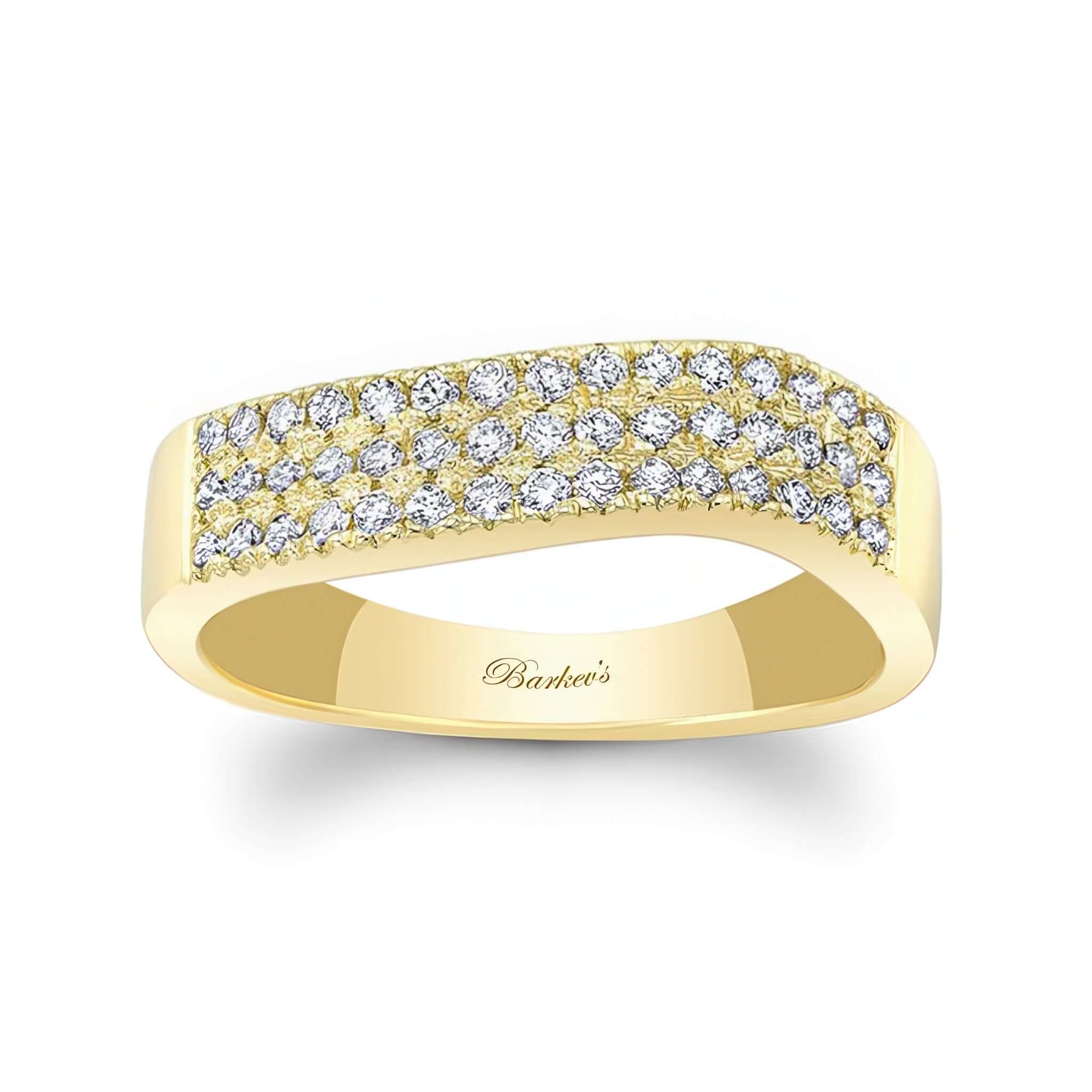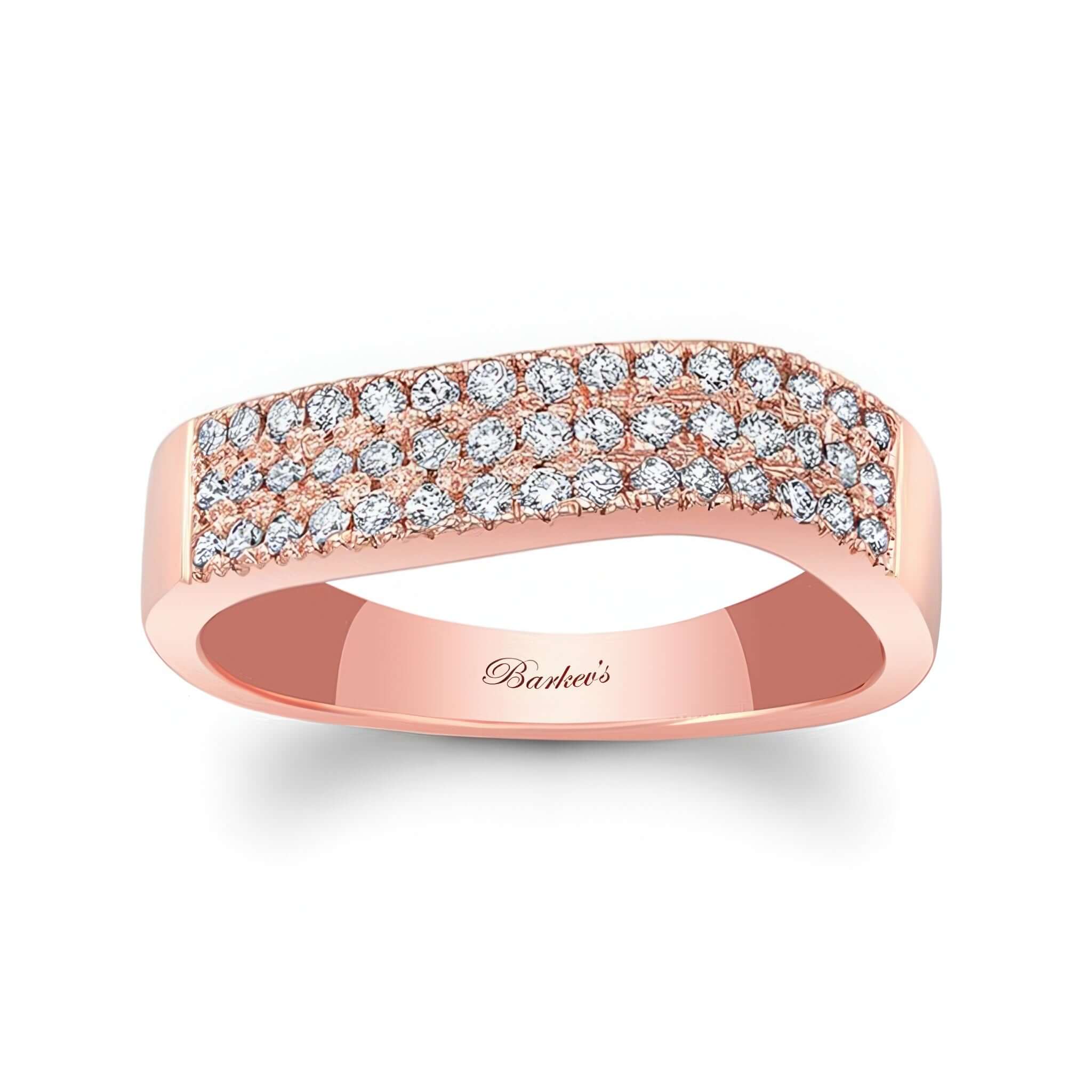 A beautiful curved diamond wedding band featuring 3 rows of shared prong set diamond melees.