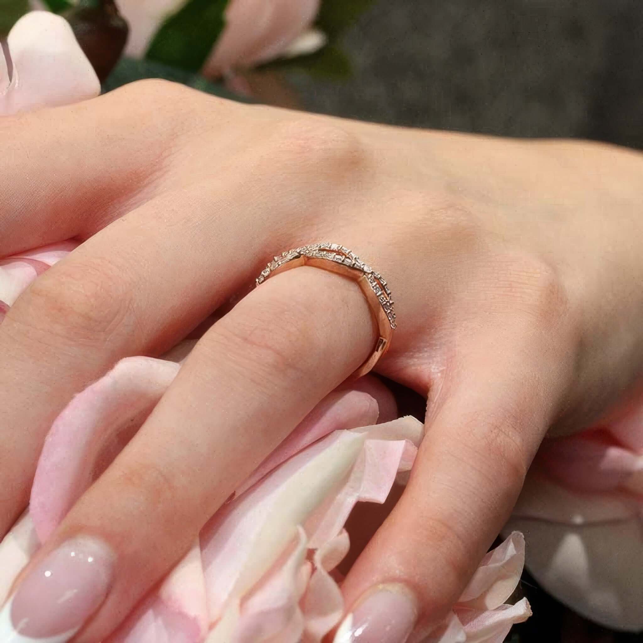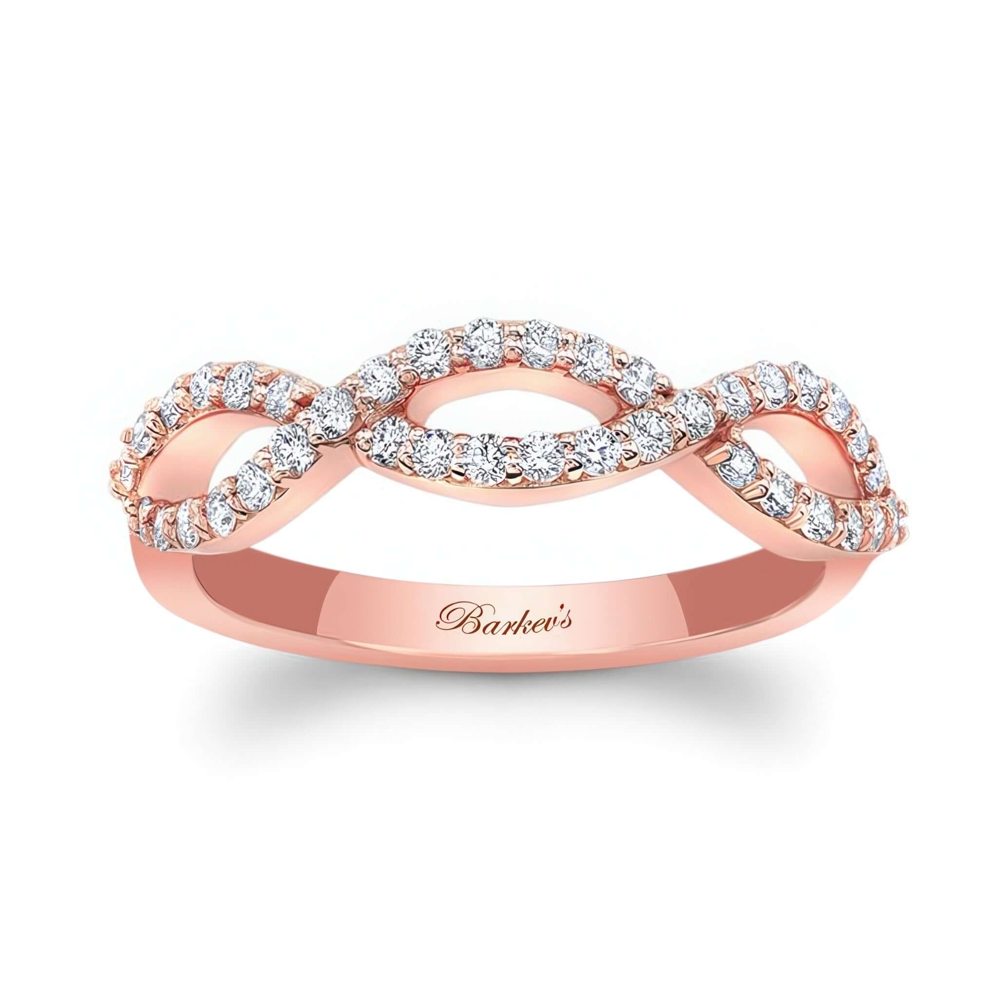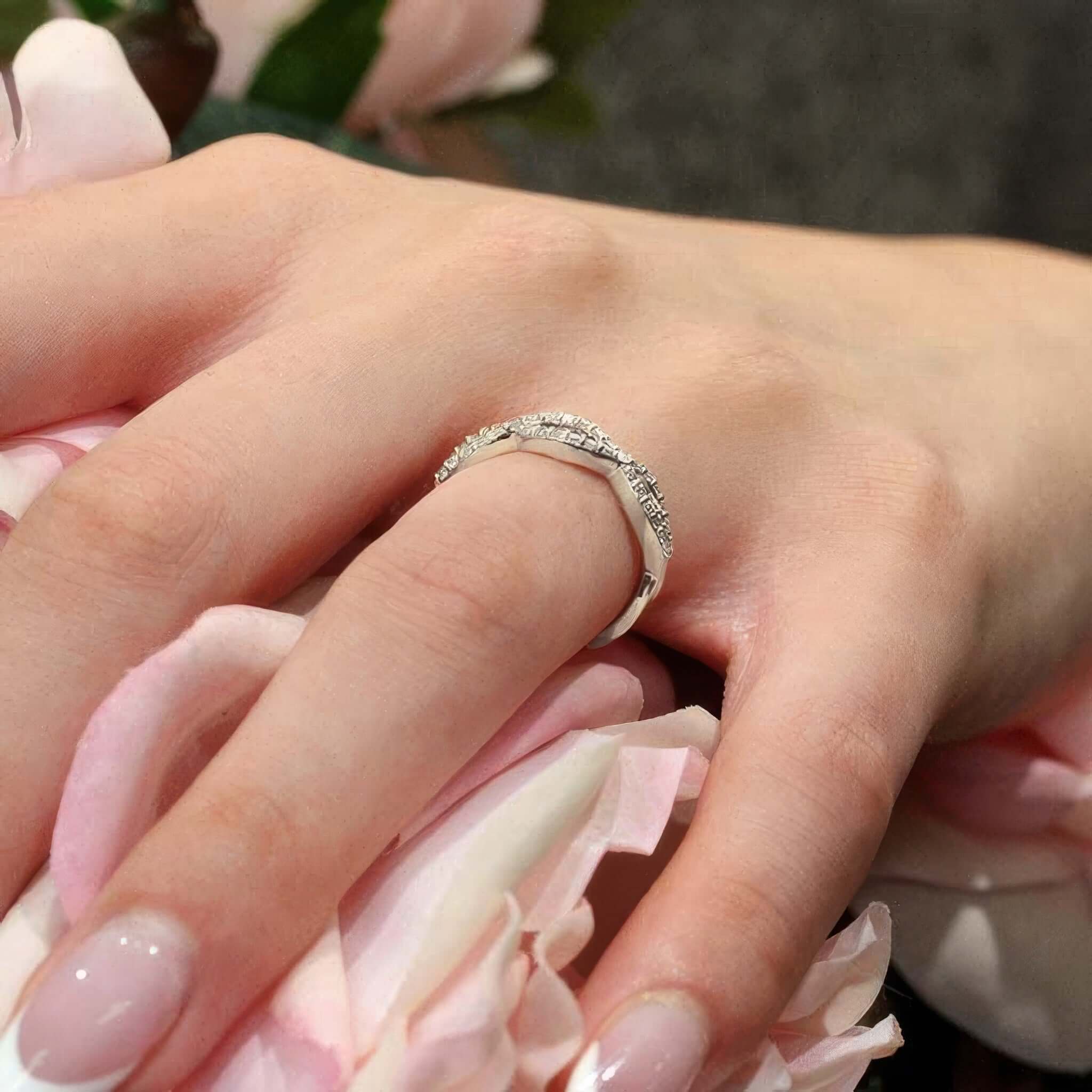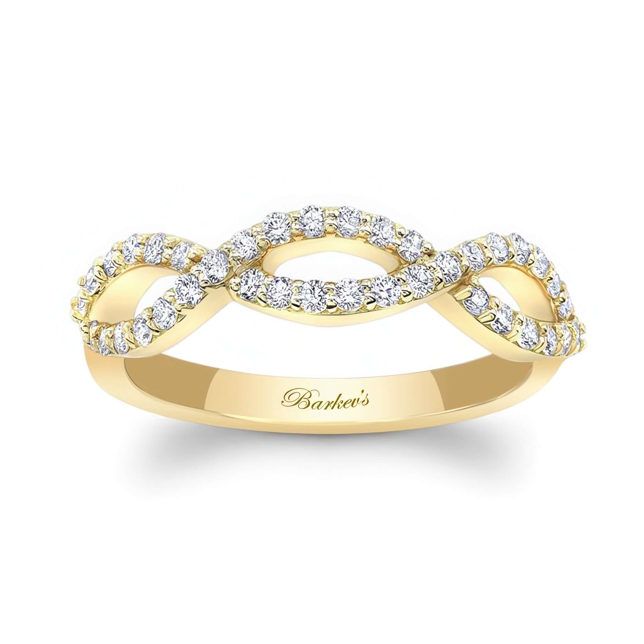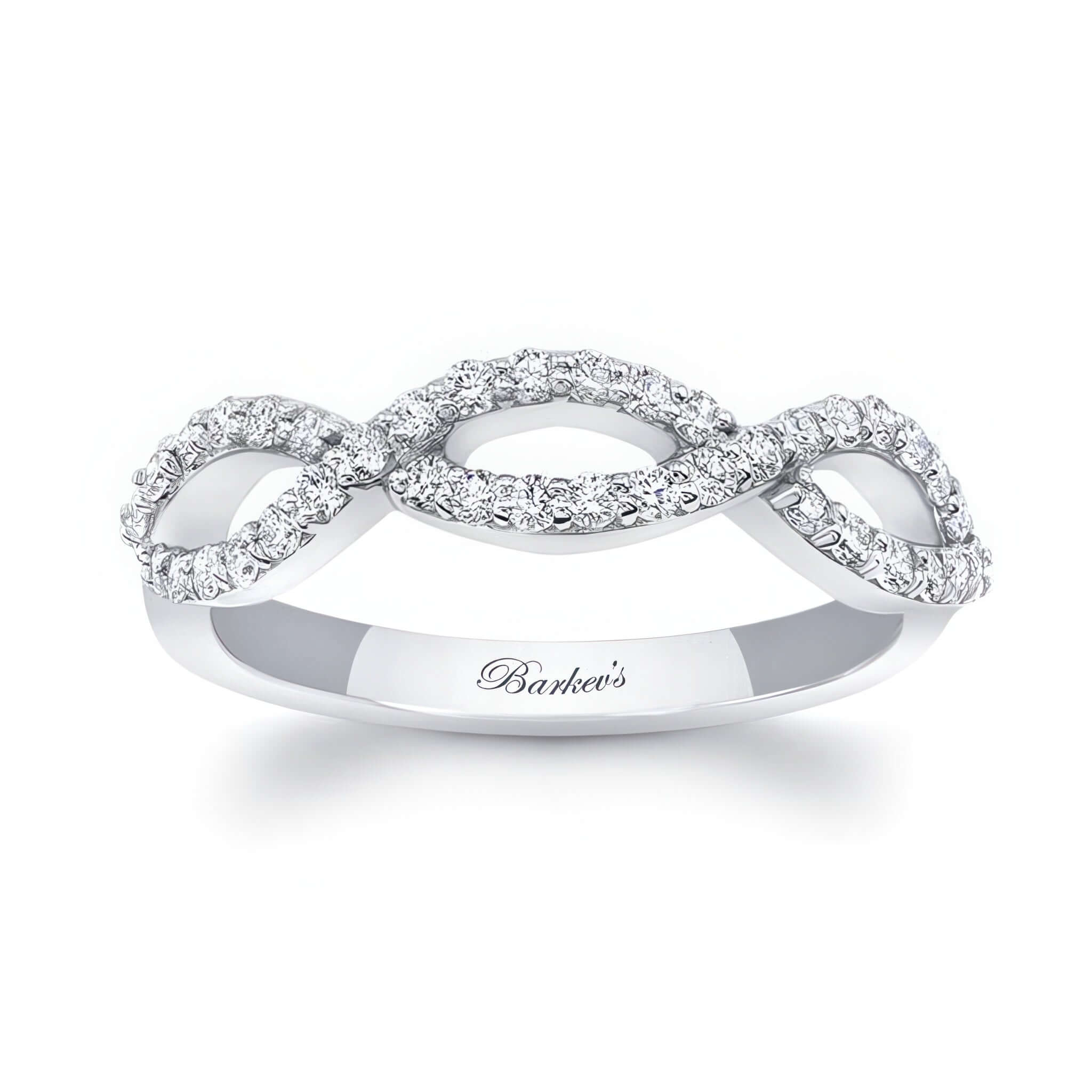 An elegant infinity wedding band featuring shared prong set diamonds weaving across the finger for a sophisticated flare.