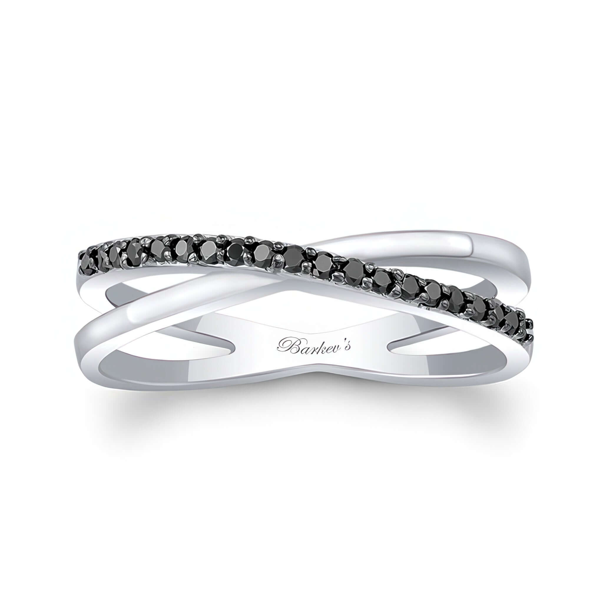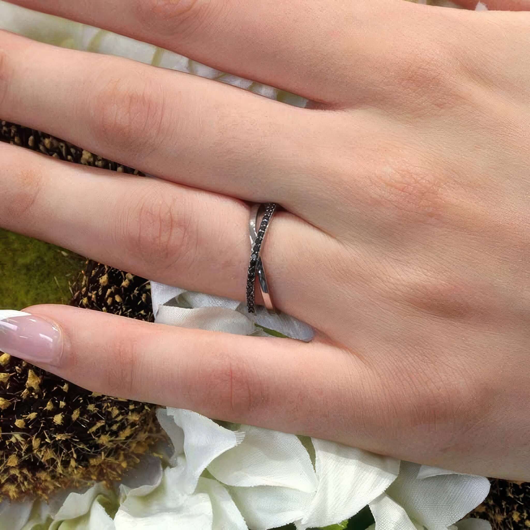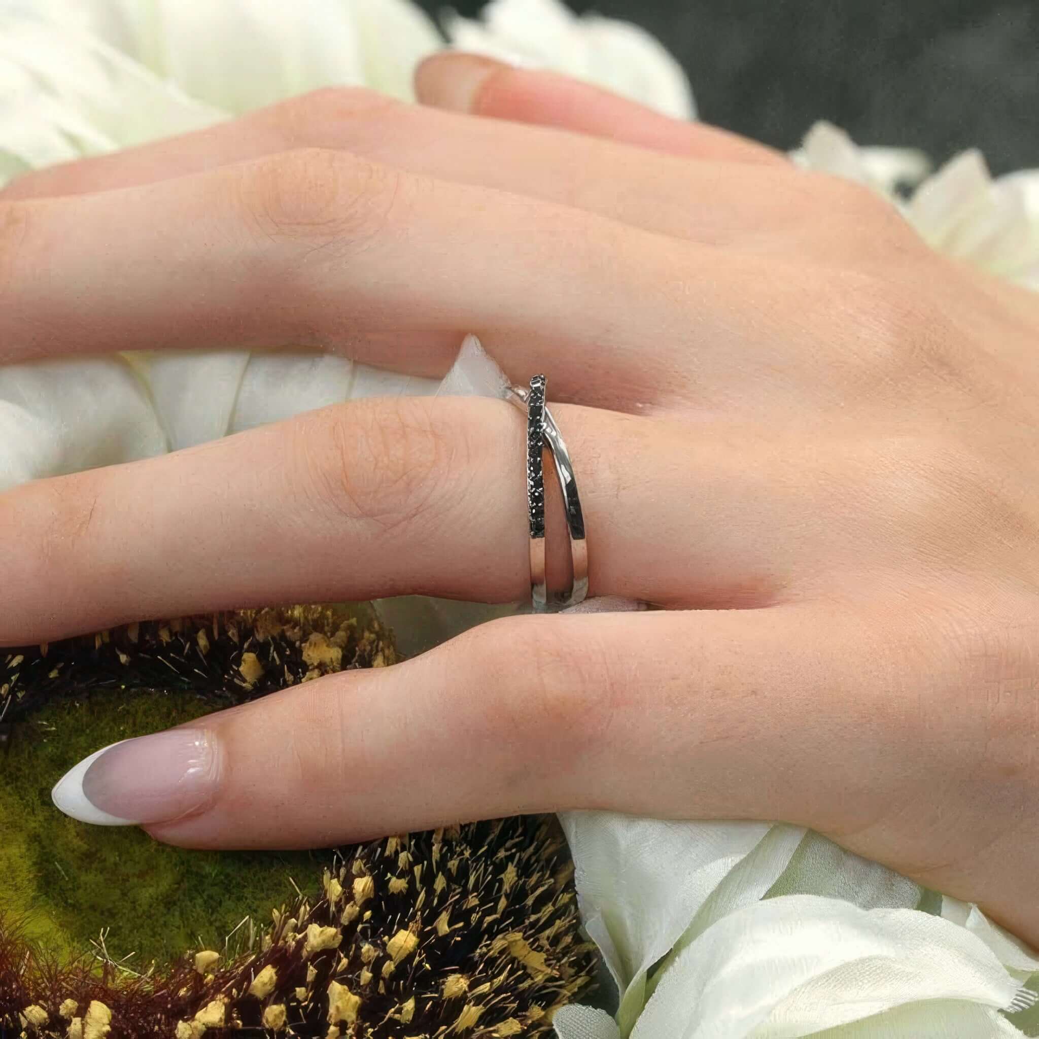 A beautiful overlap black diamond promise ring featuring shared prong set black diamonds sitting on an overlapping gold band.