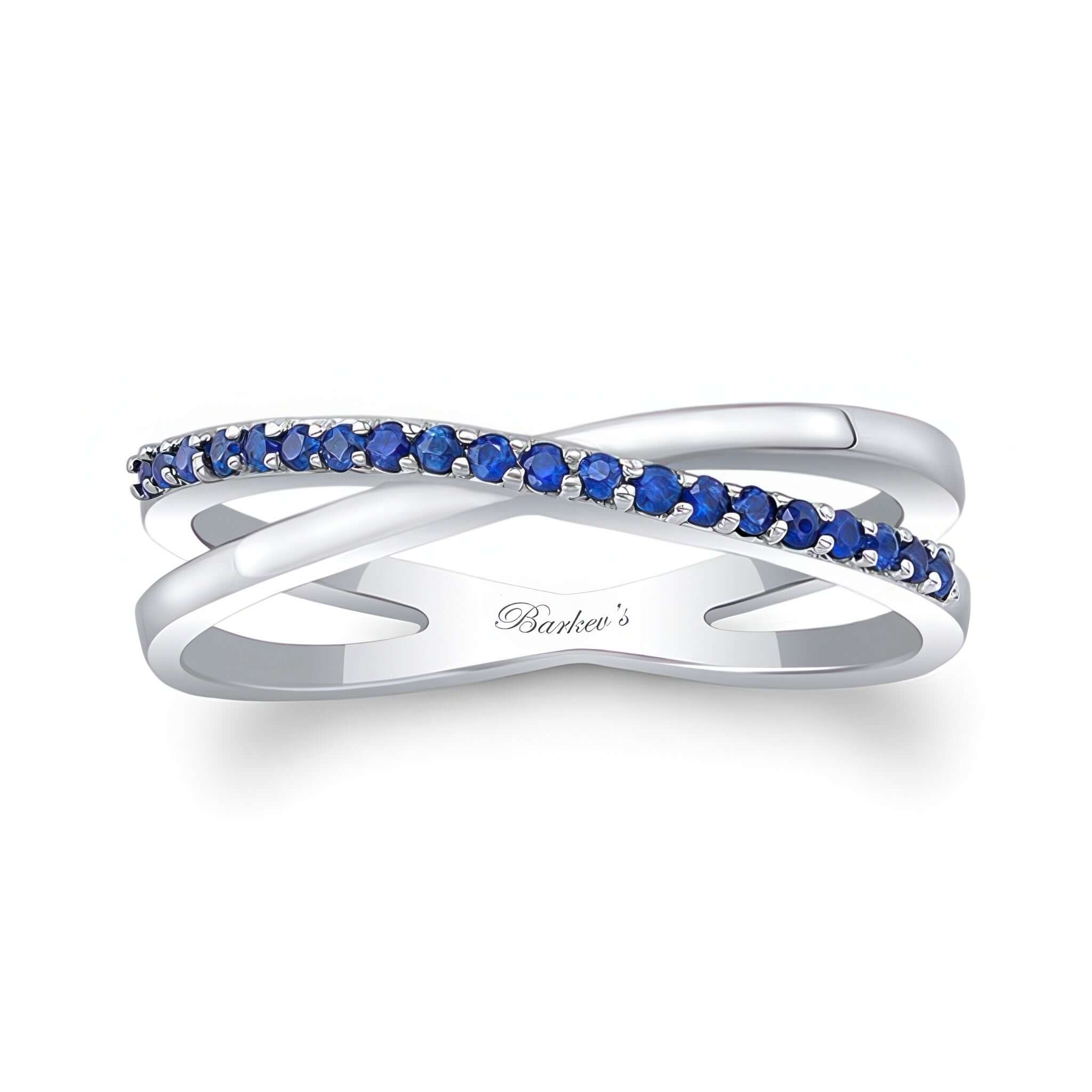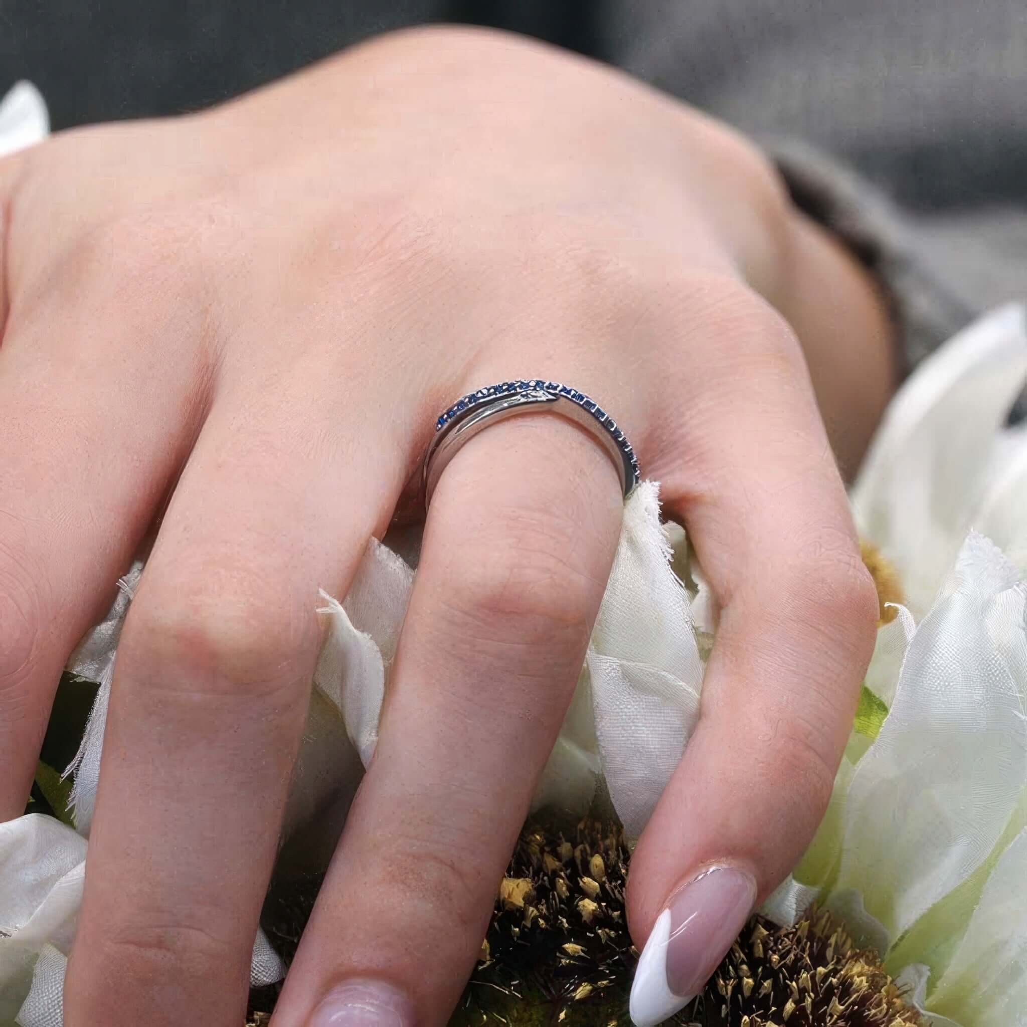 A beautiful overlap sapphire promise ring featuring shared prong set blue sapphires sitting on an overlapping gold band.