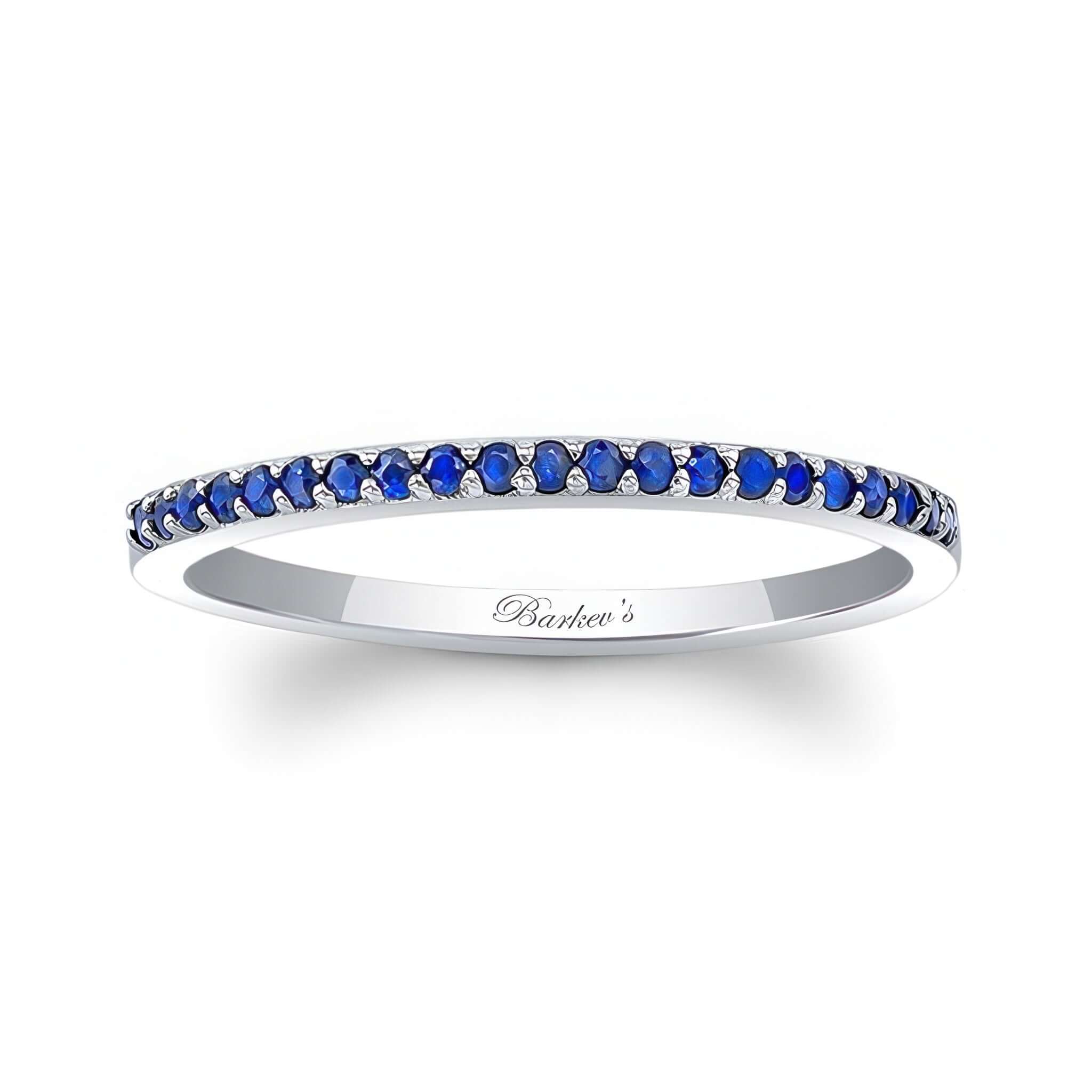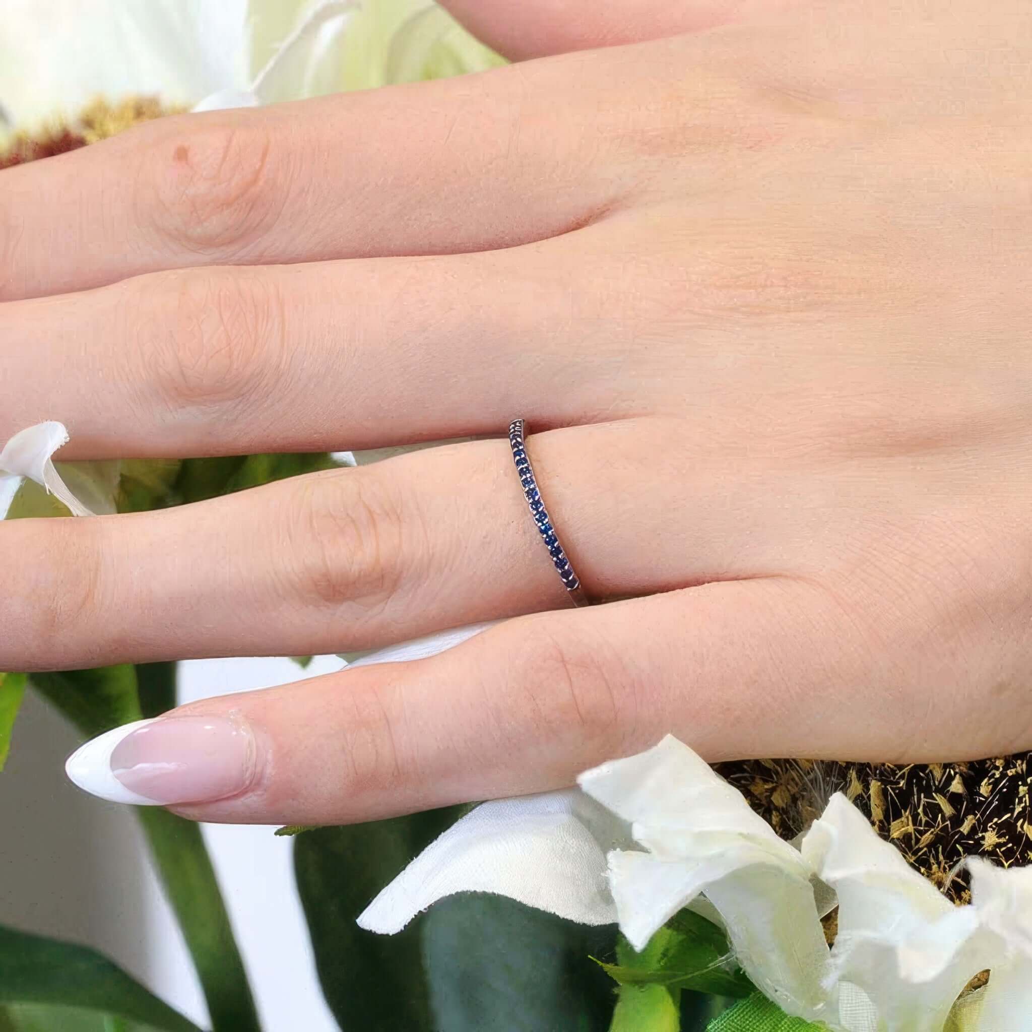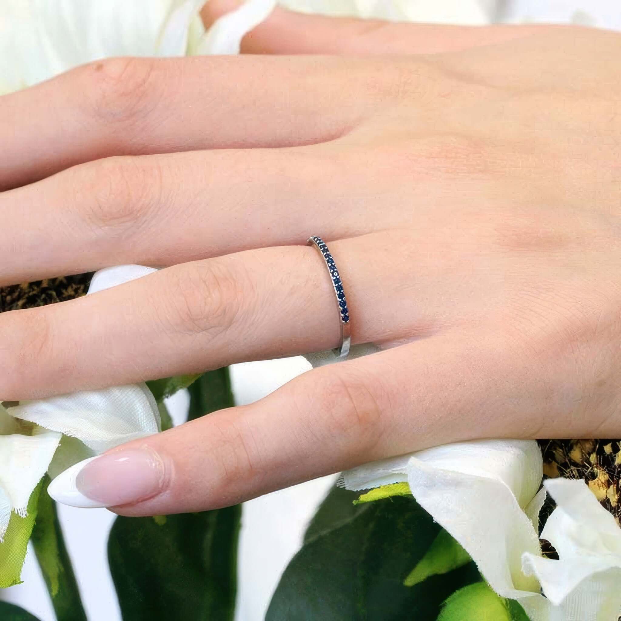 A thin stackable blue sapphire wedding band with shared prong set blue sapphires. Wear it alone or stack it with other rings to add a touch of elegance.