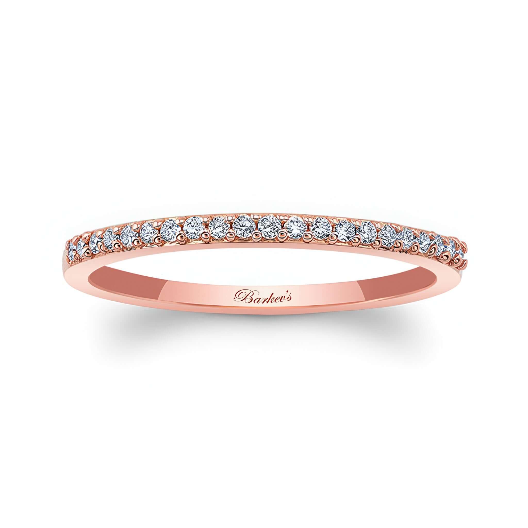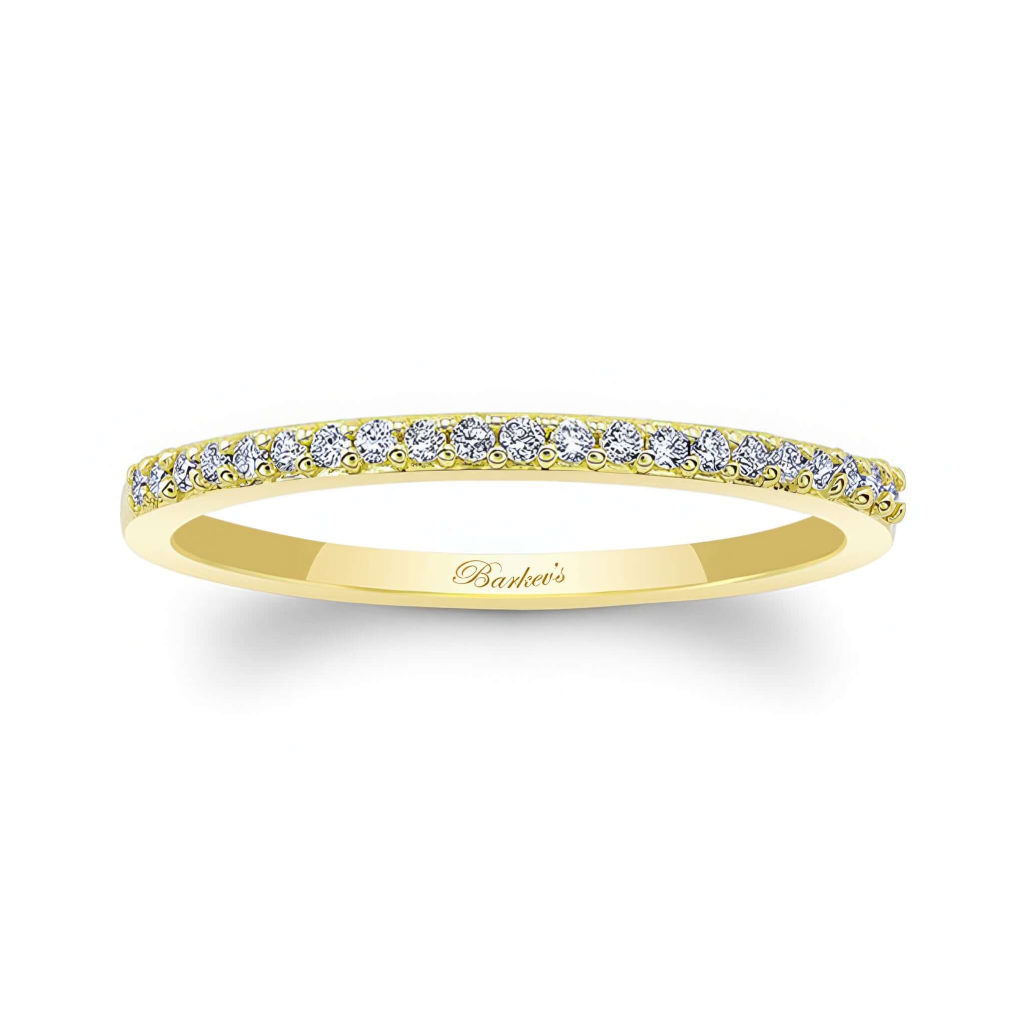 A thin stackable diamond wedding band with shared prong set diamonds. Wear it alone or stack it with other rings to add a touch of elegance.