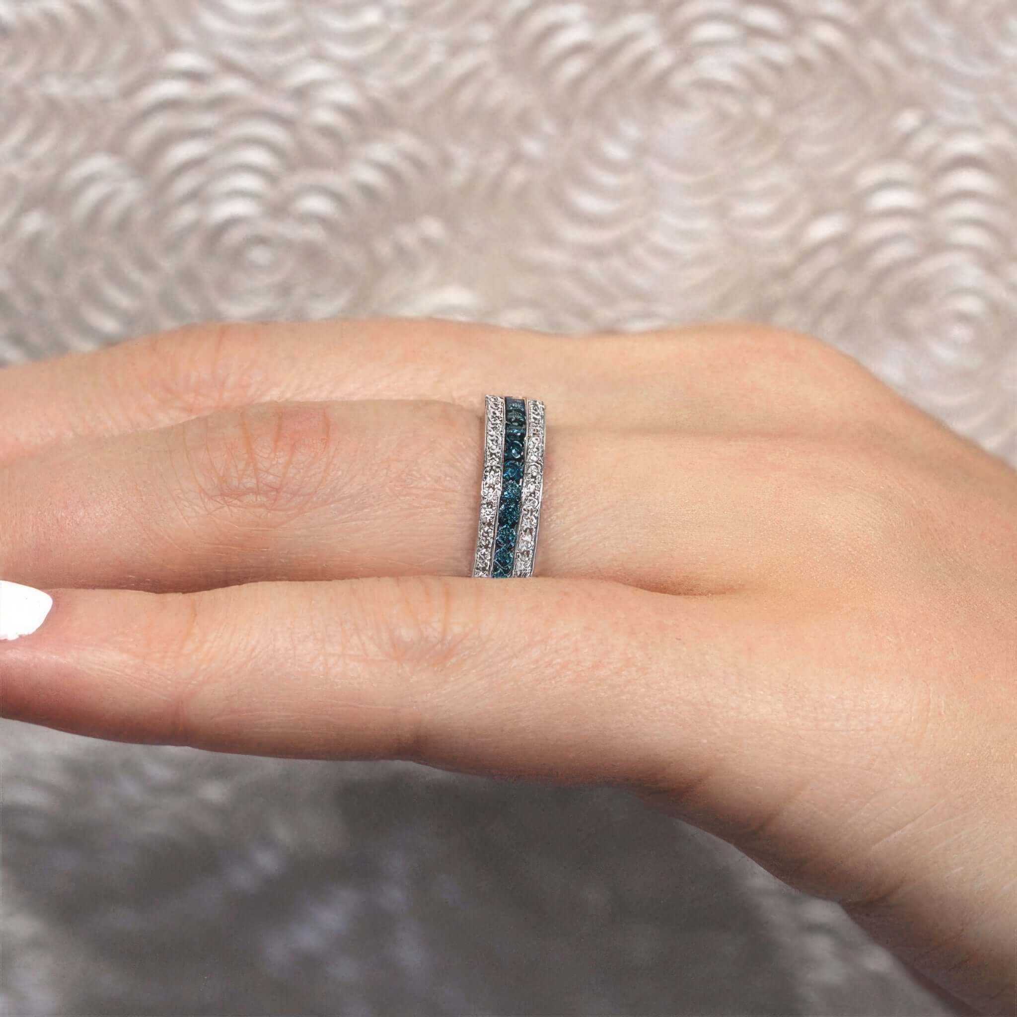 This three row blue and white diamond wedding band features channel set blue diamonds in the center surrounded by two rows of pave set white diamonds and a milgrain finish for a stunning look.