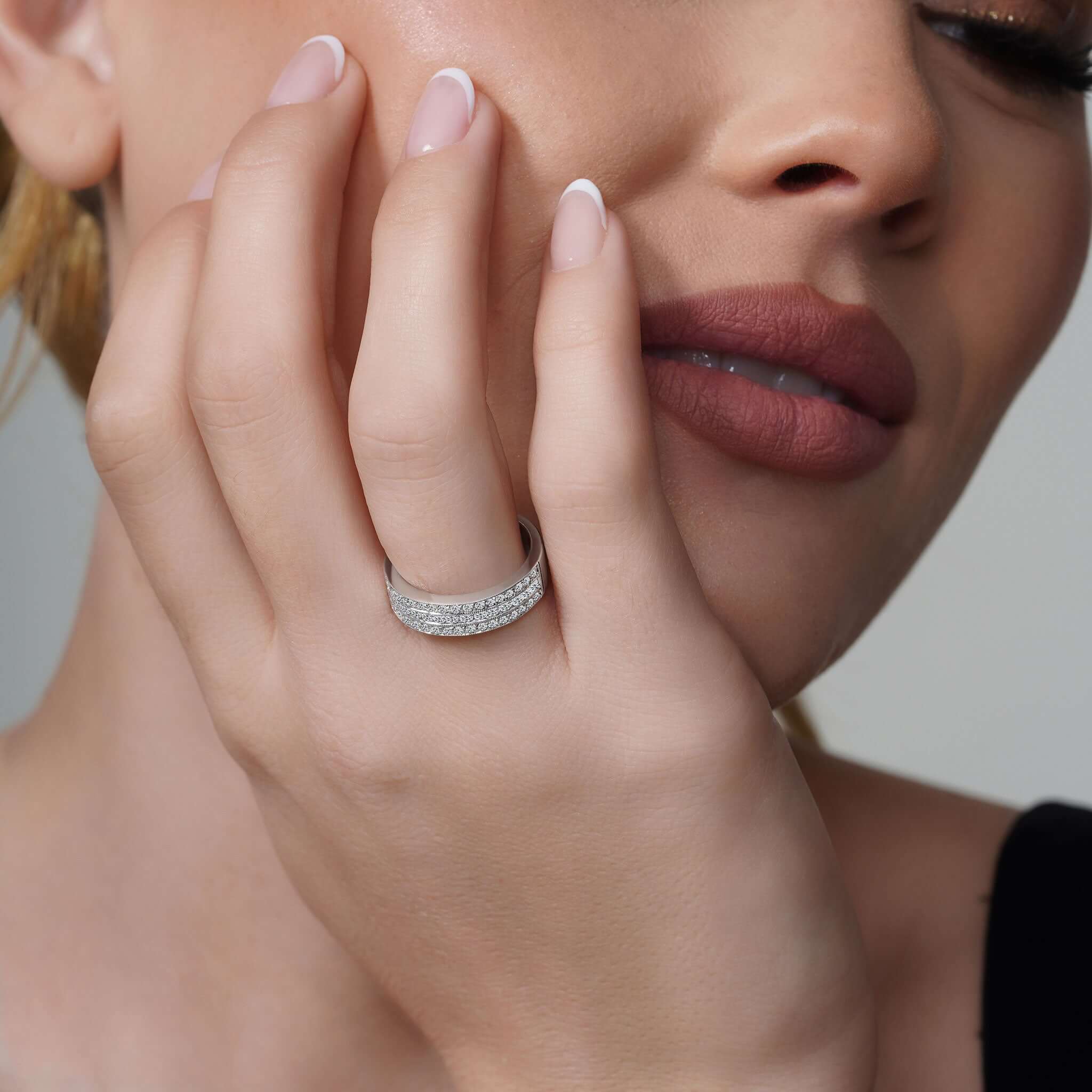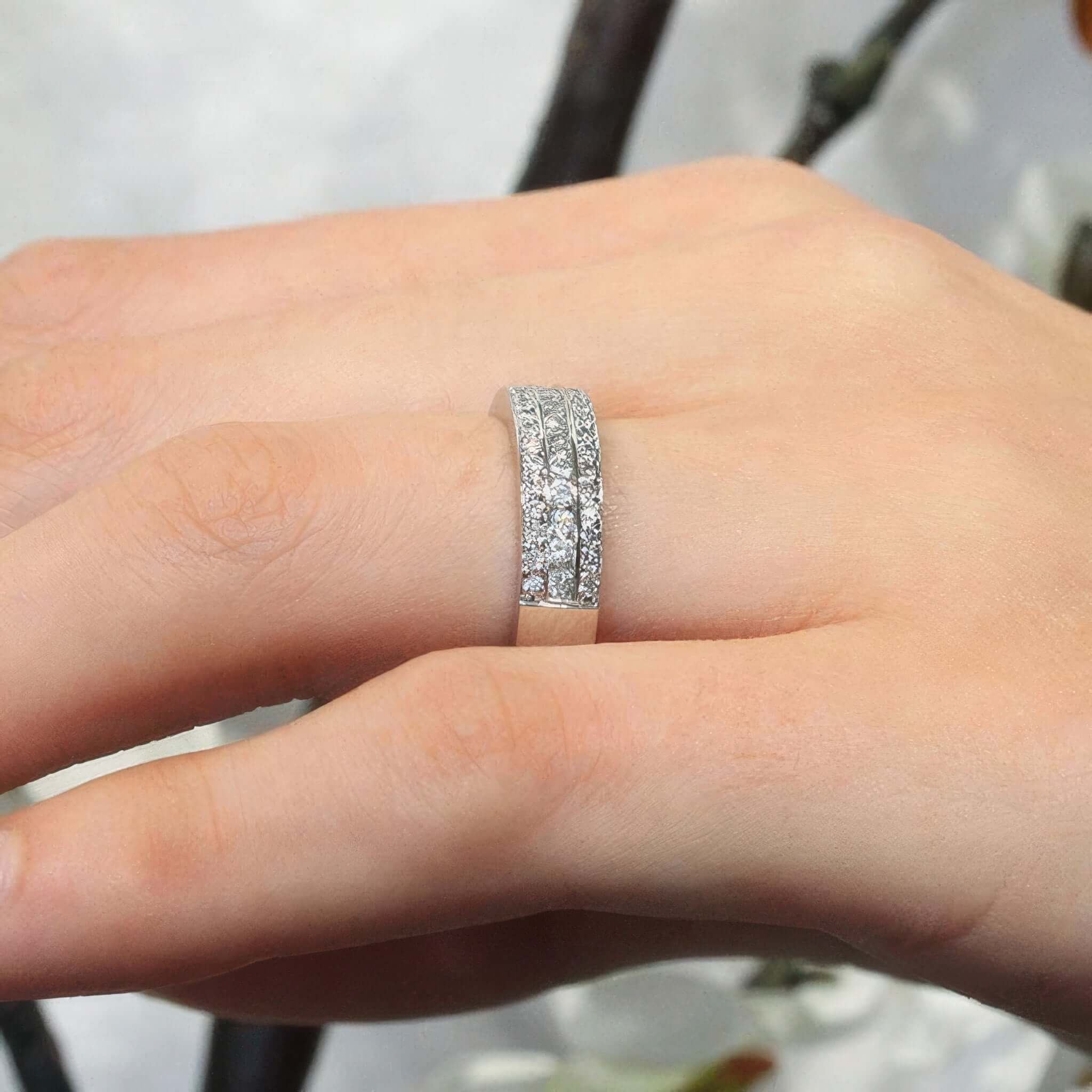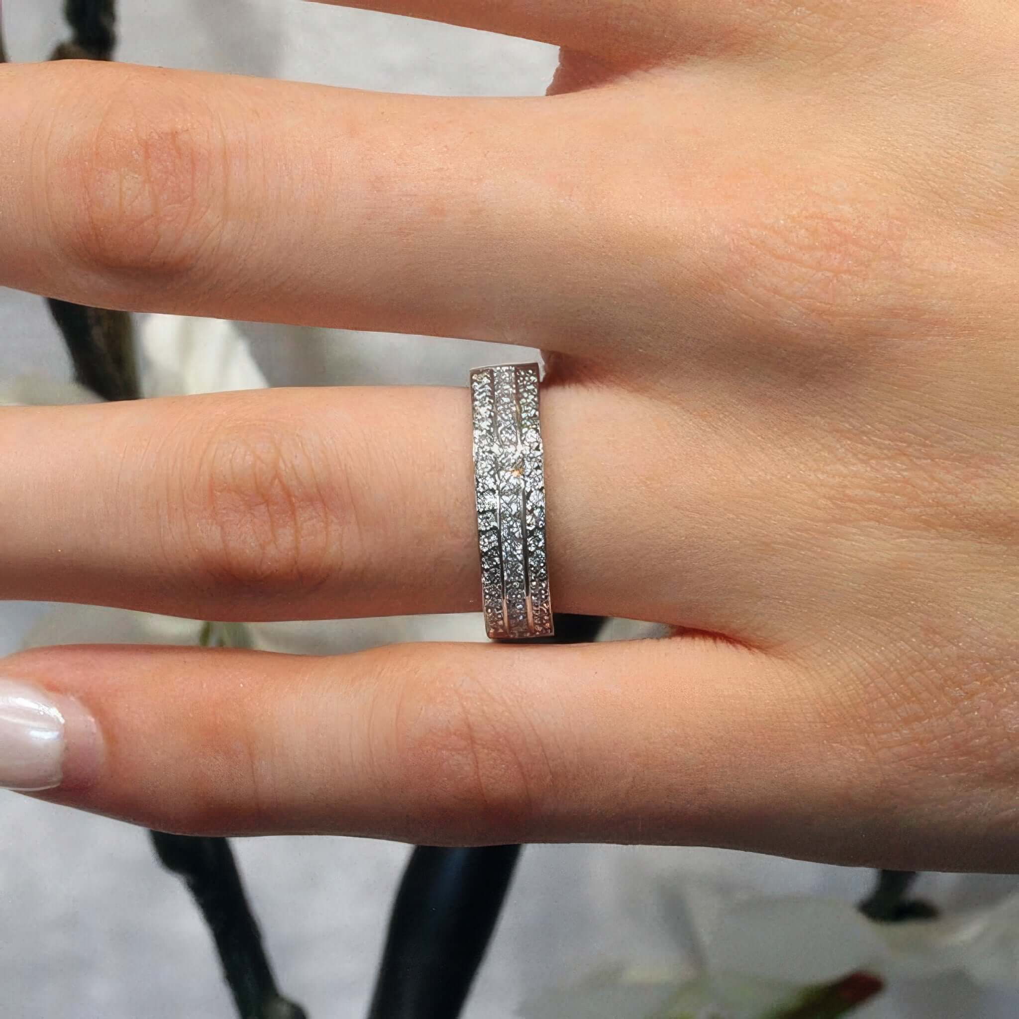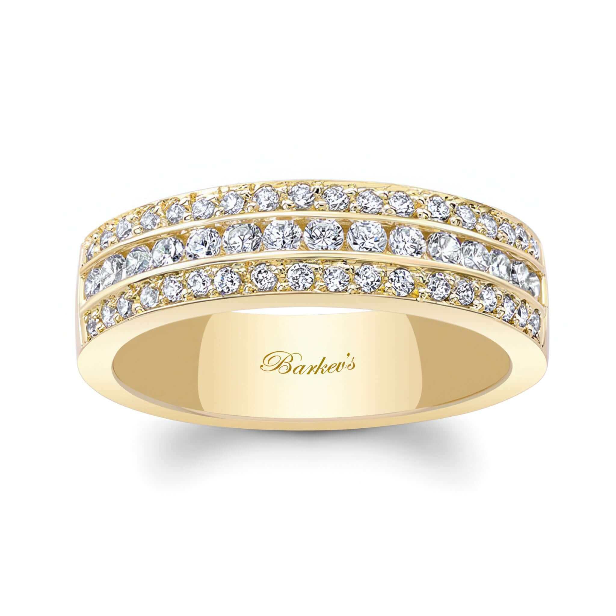 This three row diamond wedding band features channel set diamonds in the center surrounded by two rows of pave set diamonds and a milgrain finish for a stunning look.
