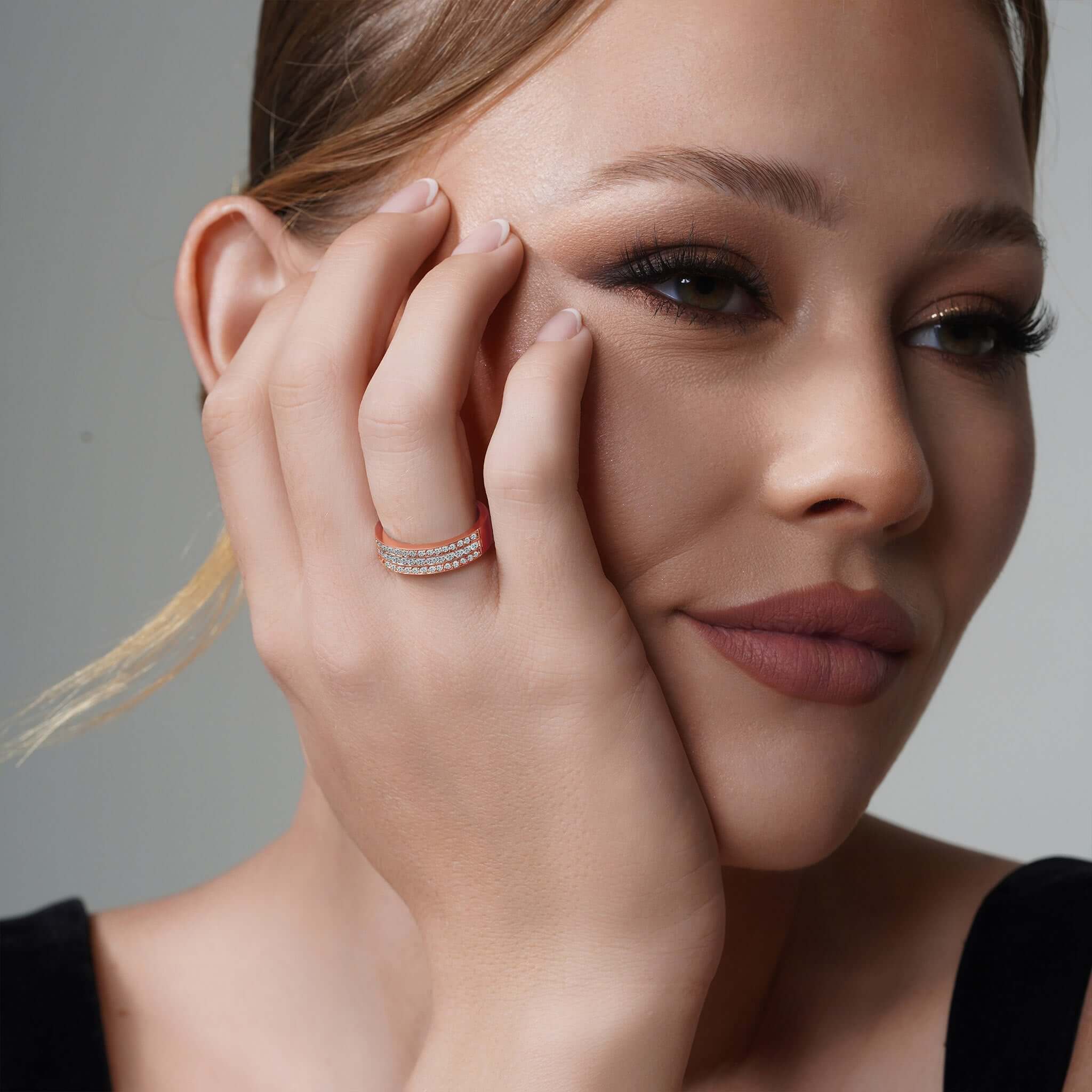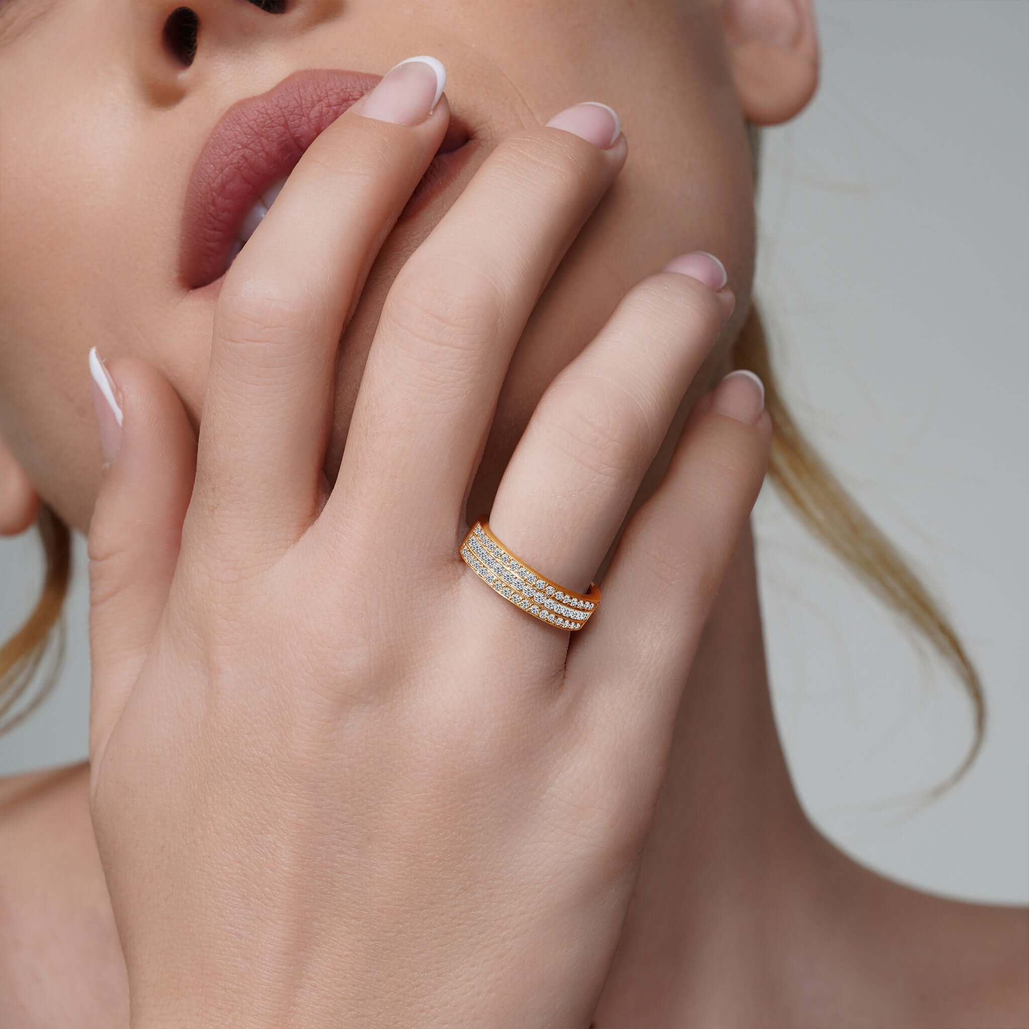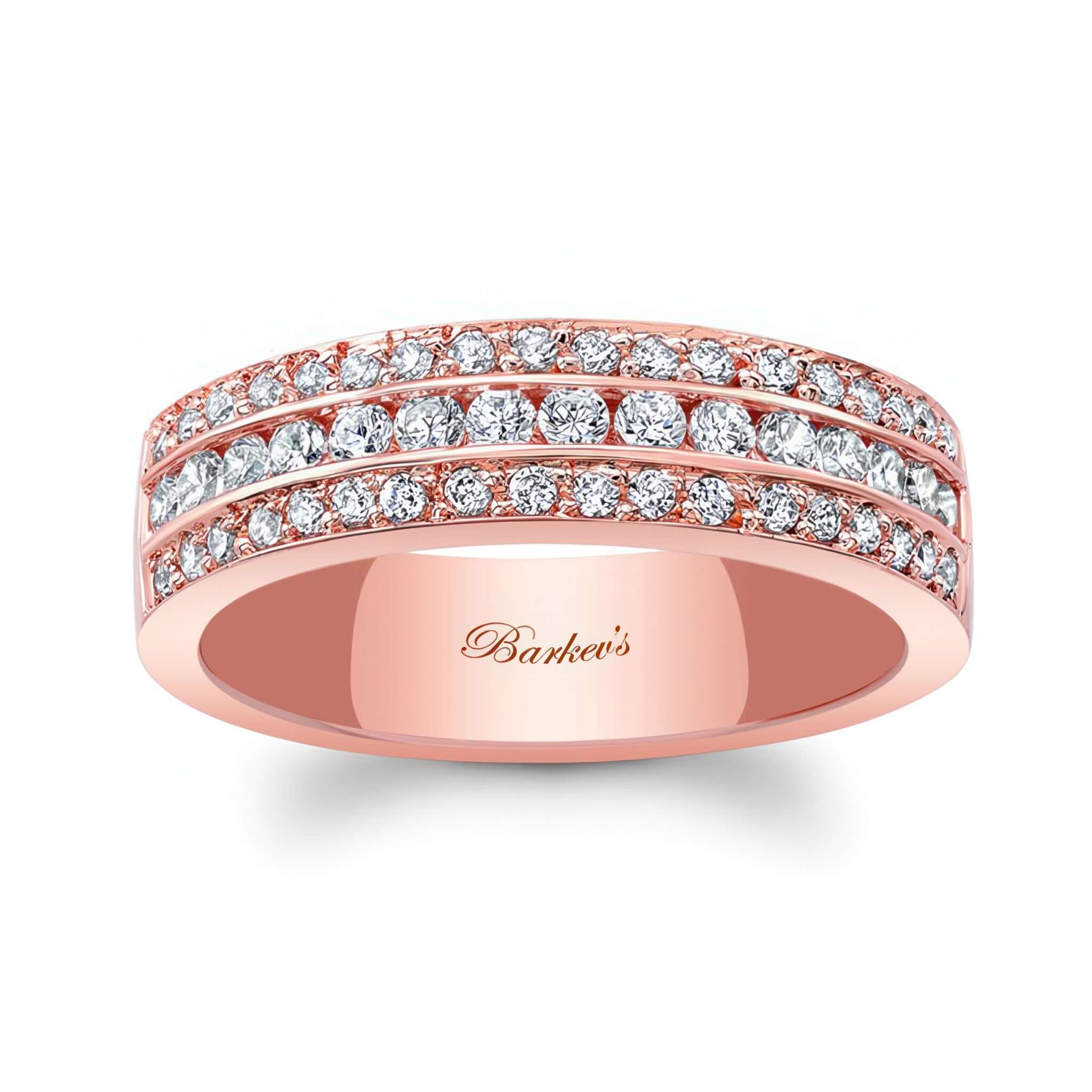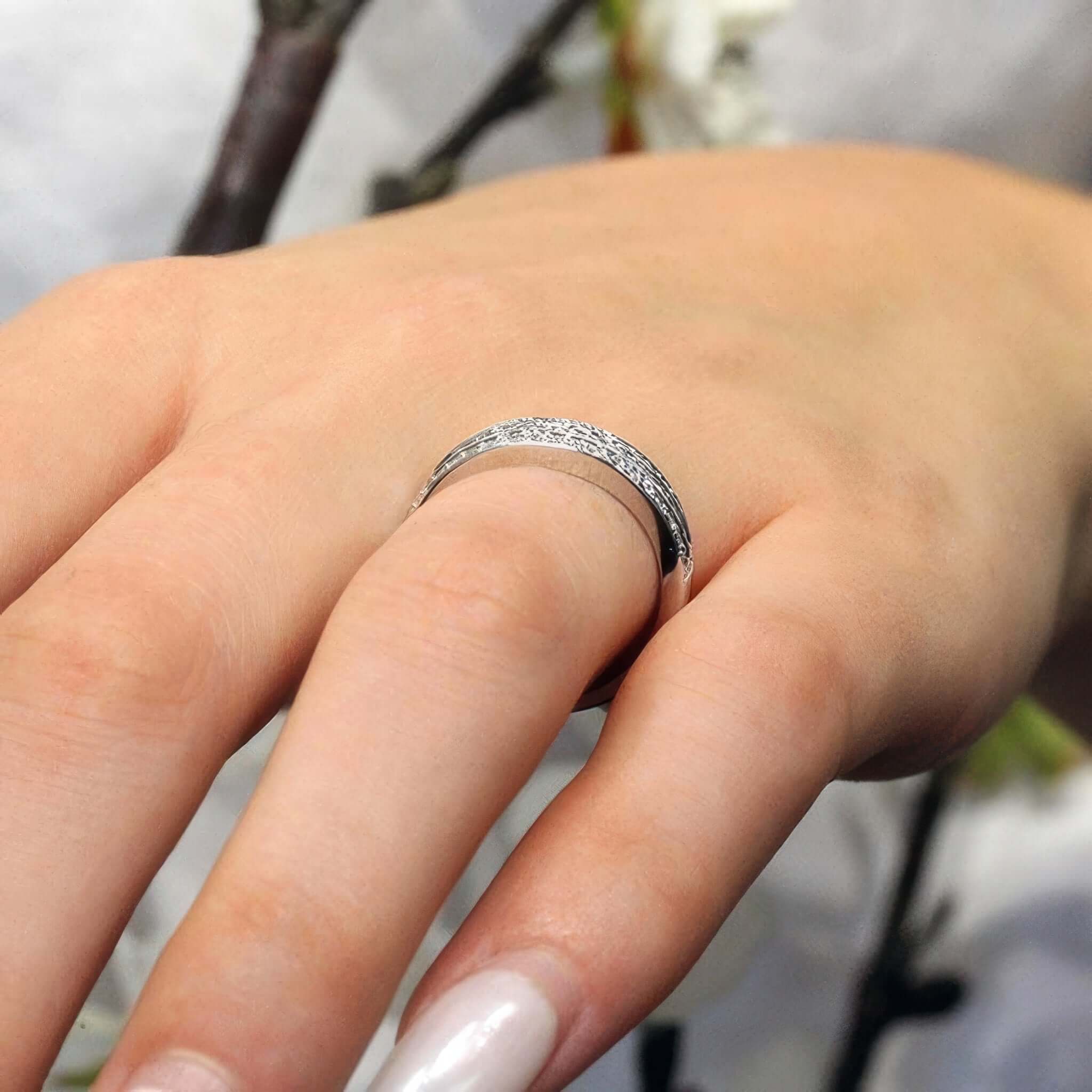 This three row diamond wedding band features channel set diamonds in the center surrounded by two rows of pave set diamonds and a milgrain finish for a stunning look.