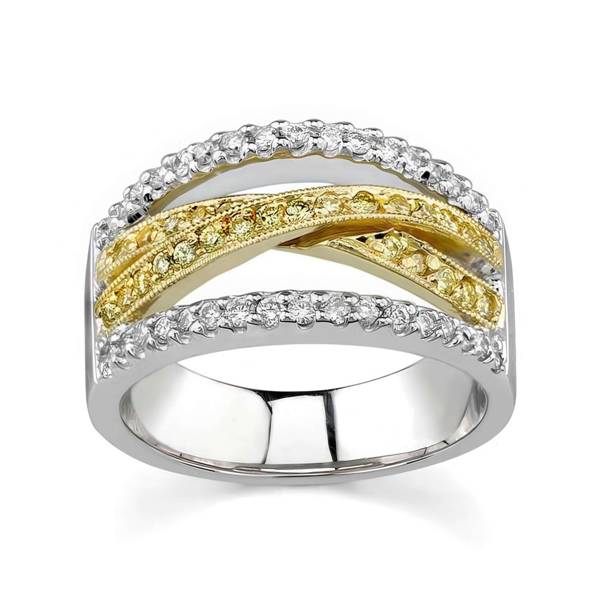 This unique band with yellow diamonds features a center section with yellow gold, criss-crossing bars, adorned with pave set fancy yellow diamonds and two flanking outside rows sporting shared prong set diamonds for a dramatic look of elegance.