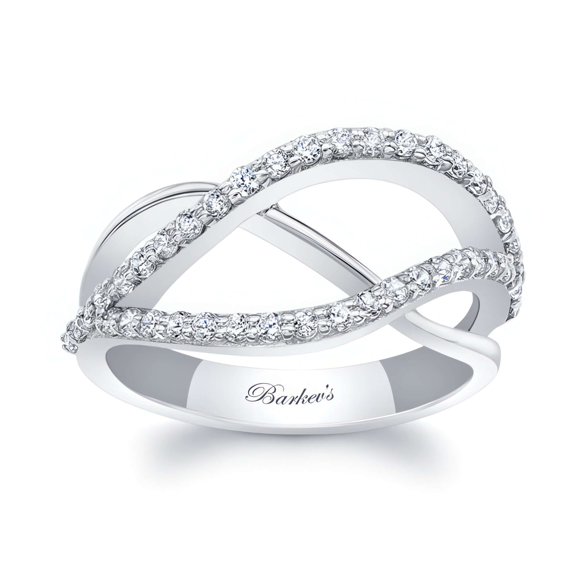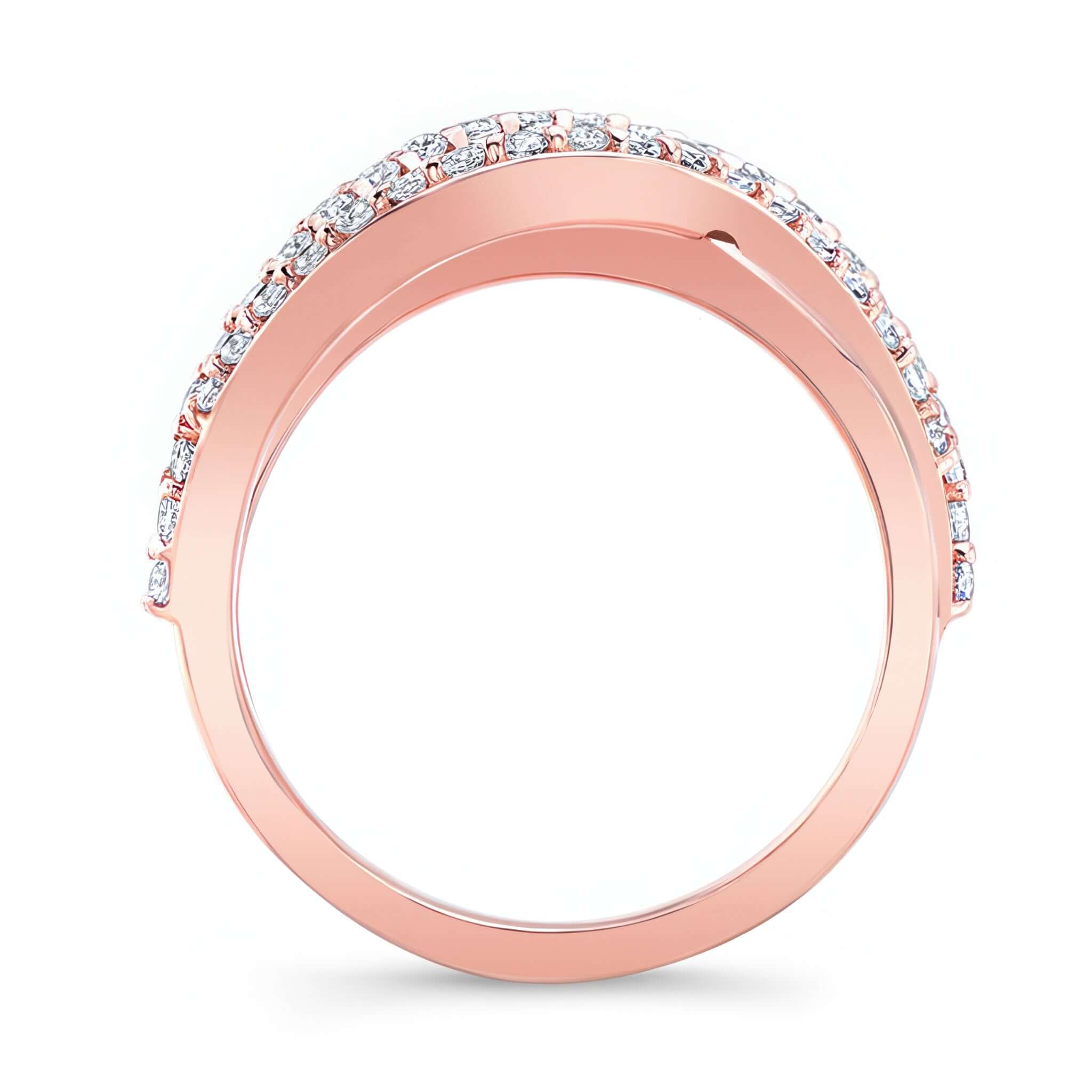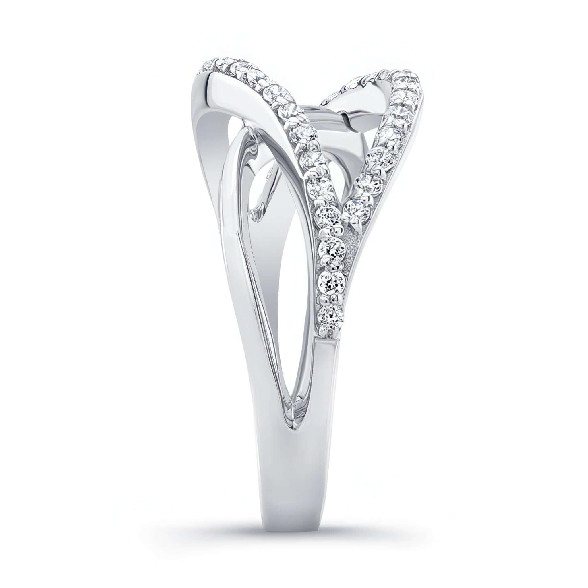 A beautiful and unique split shank diamond band featuring overlapping swirls adorned with shared prong set diamonds for an extra touch of elegance.