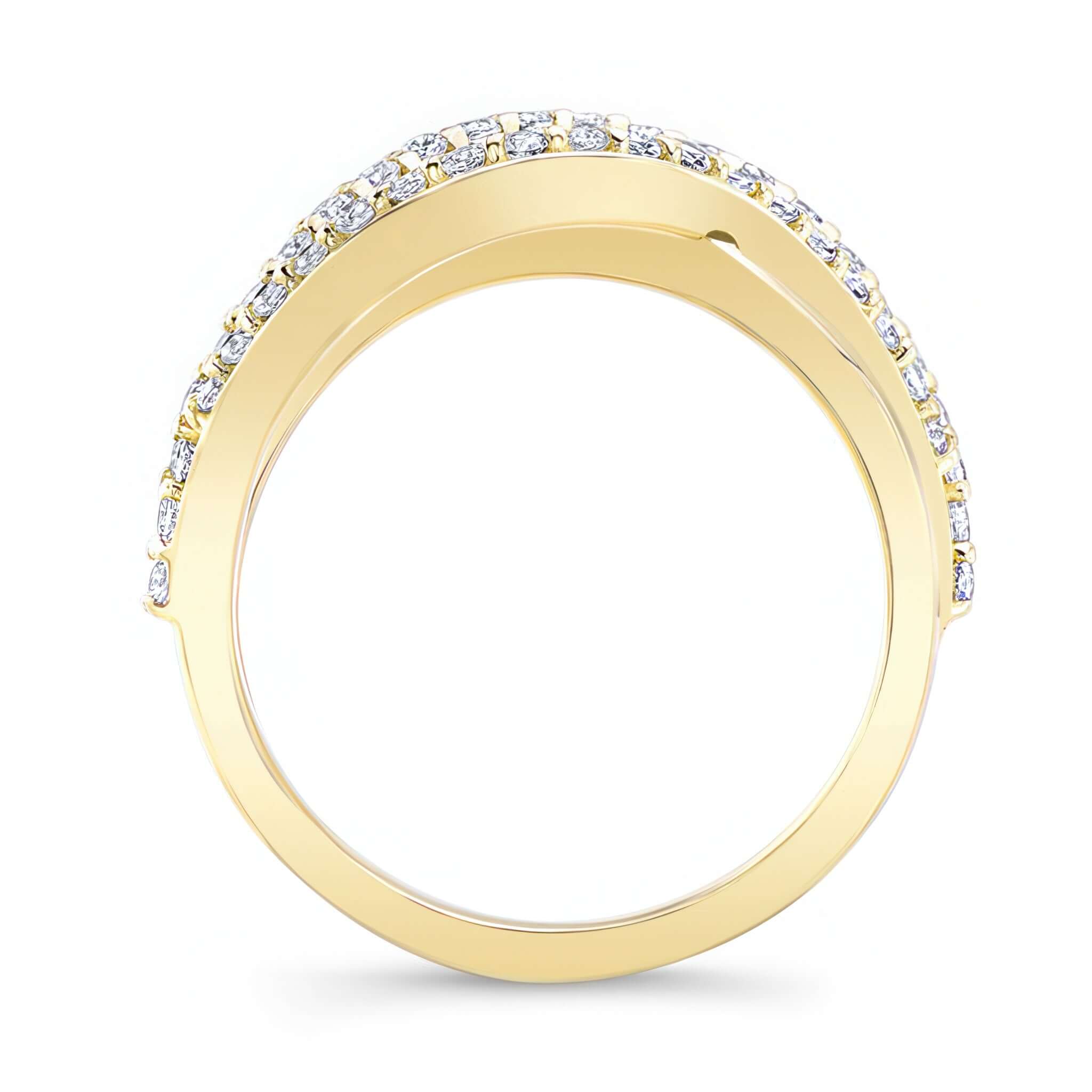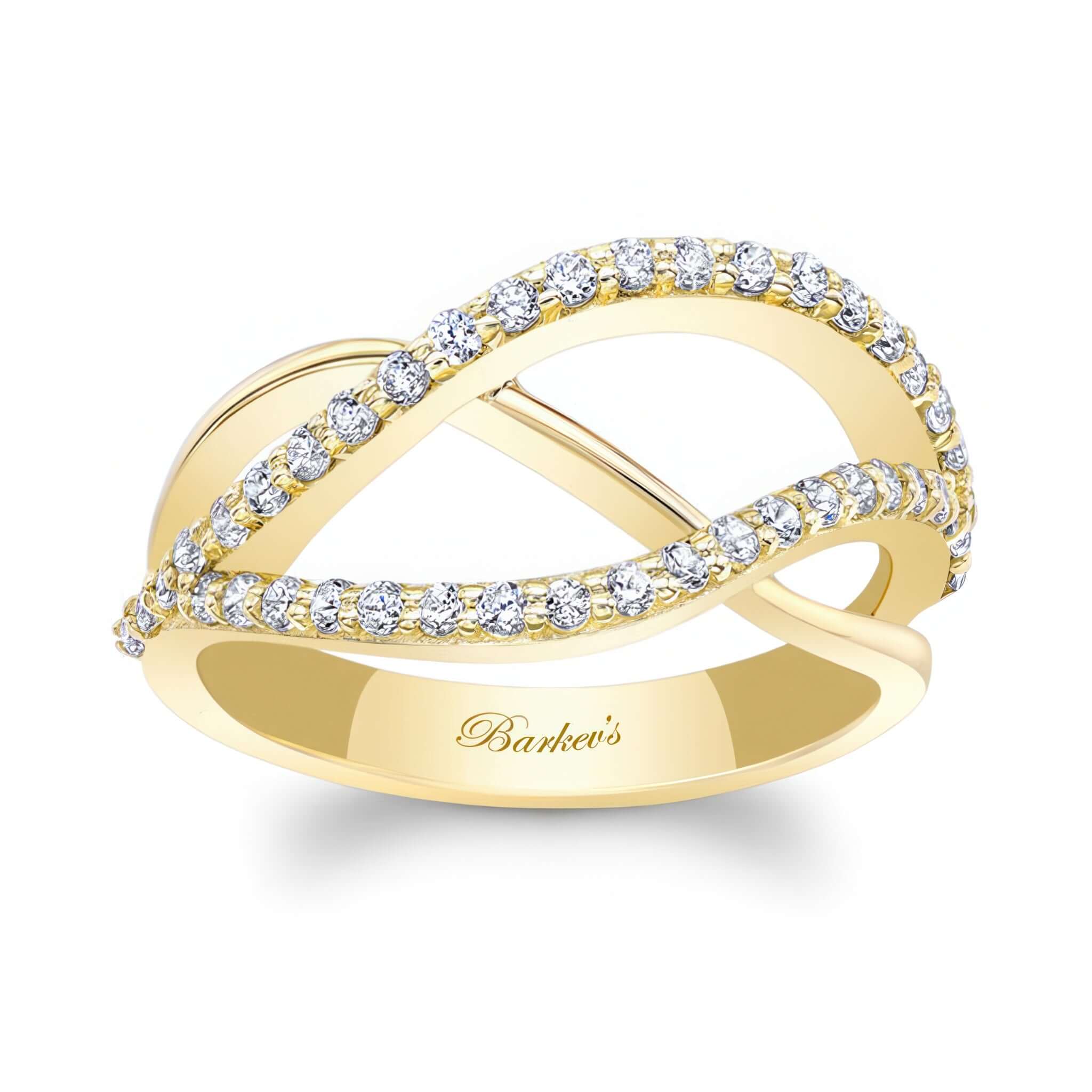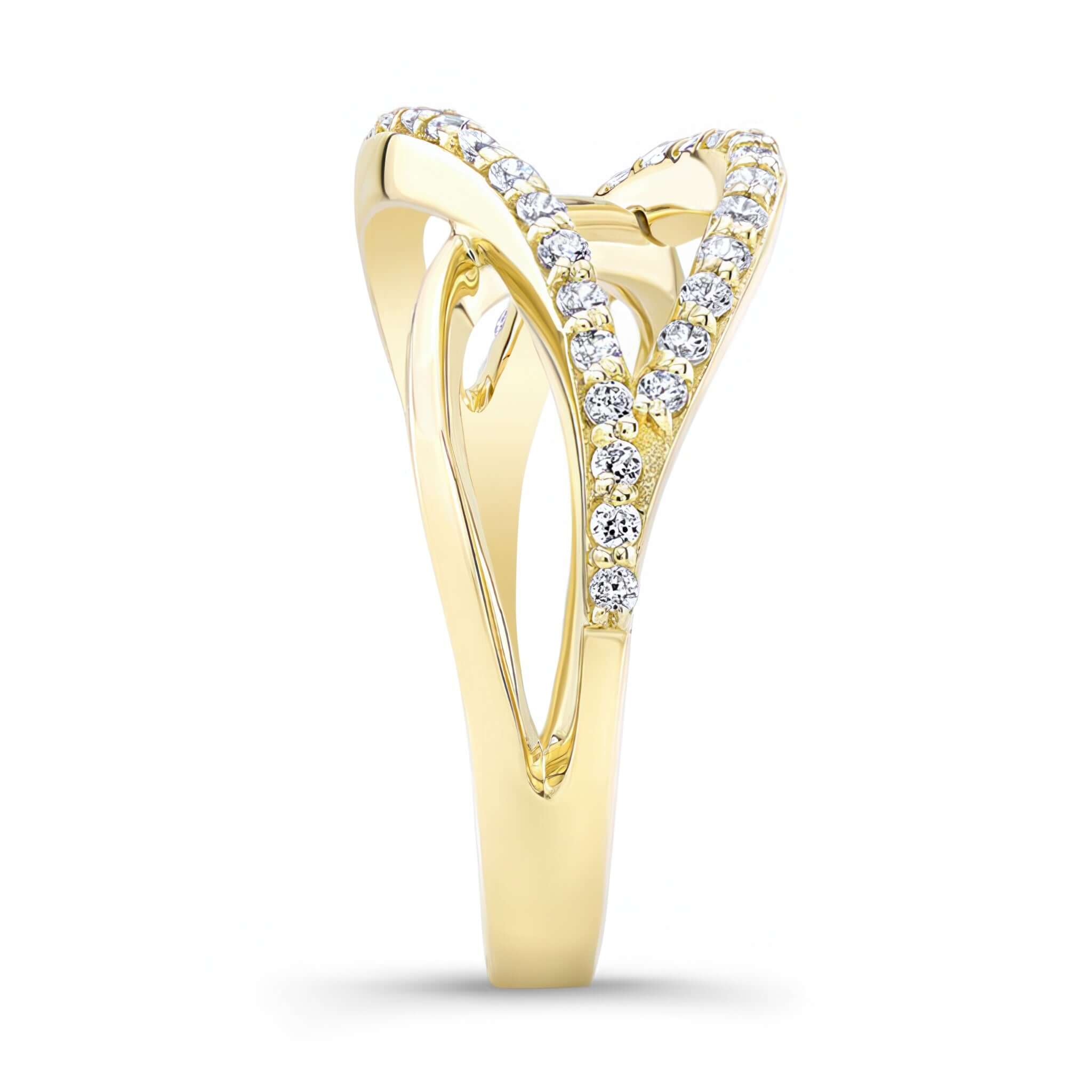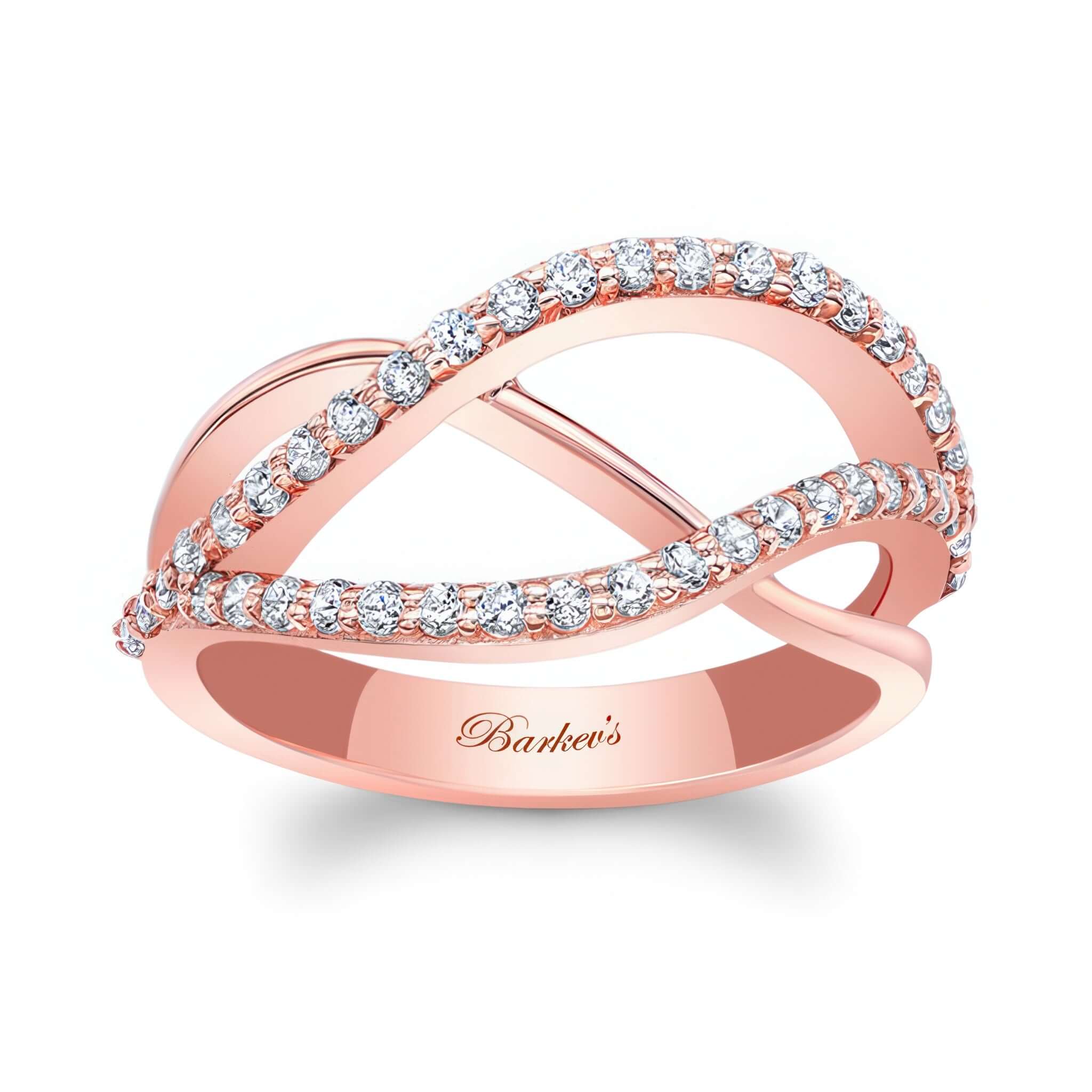 A beautiful and unique split shank diamond band featuring overlapping swirls adorned with shared prong set diamonds for an extra touch of elegance.