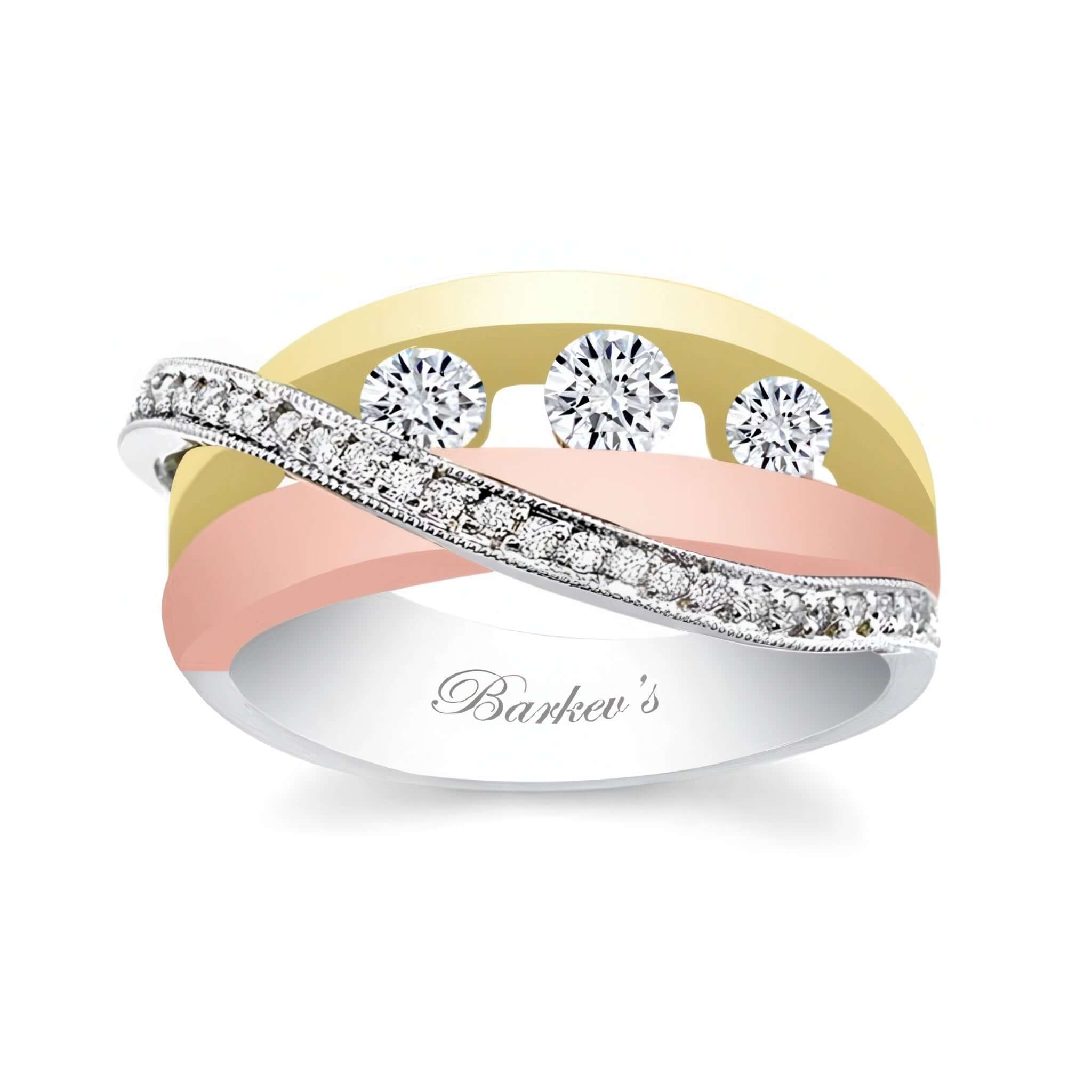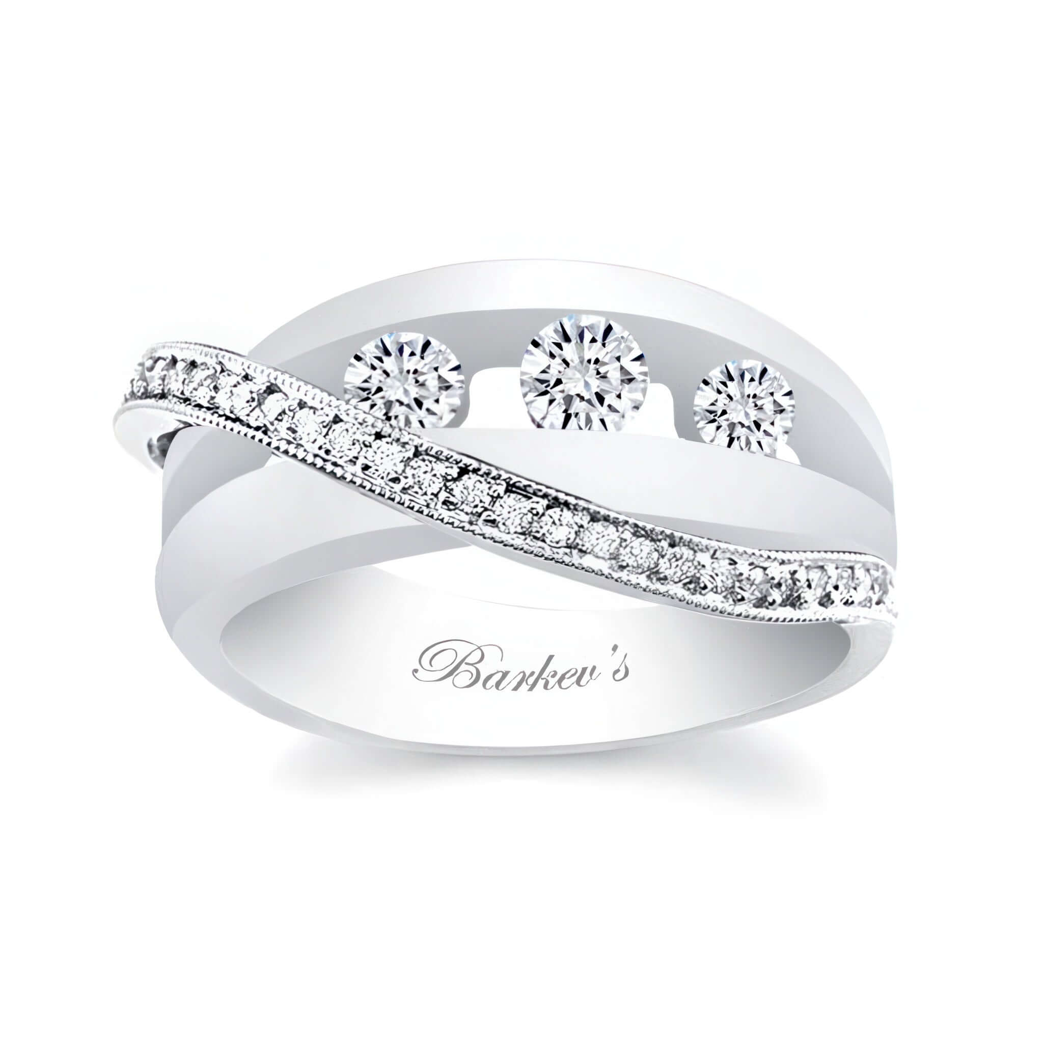 This unique trim wedding band features an open shank channel set with 3 diamonds and an accent curving trim adorned with pave set diamonds.