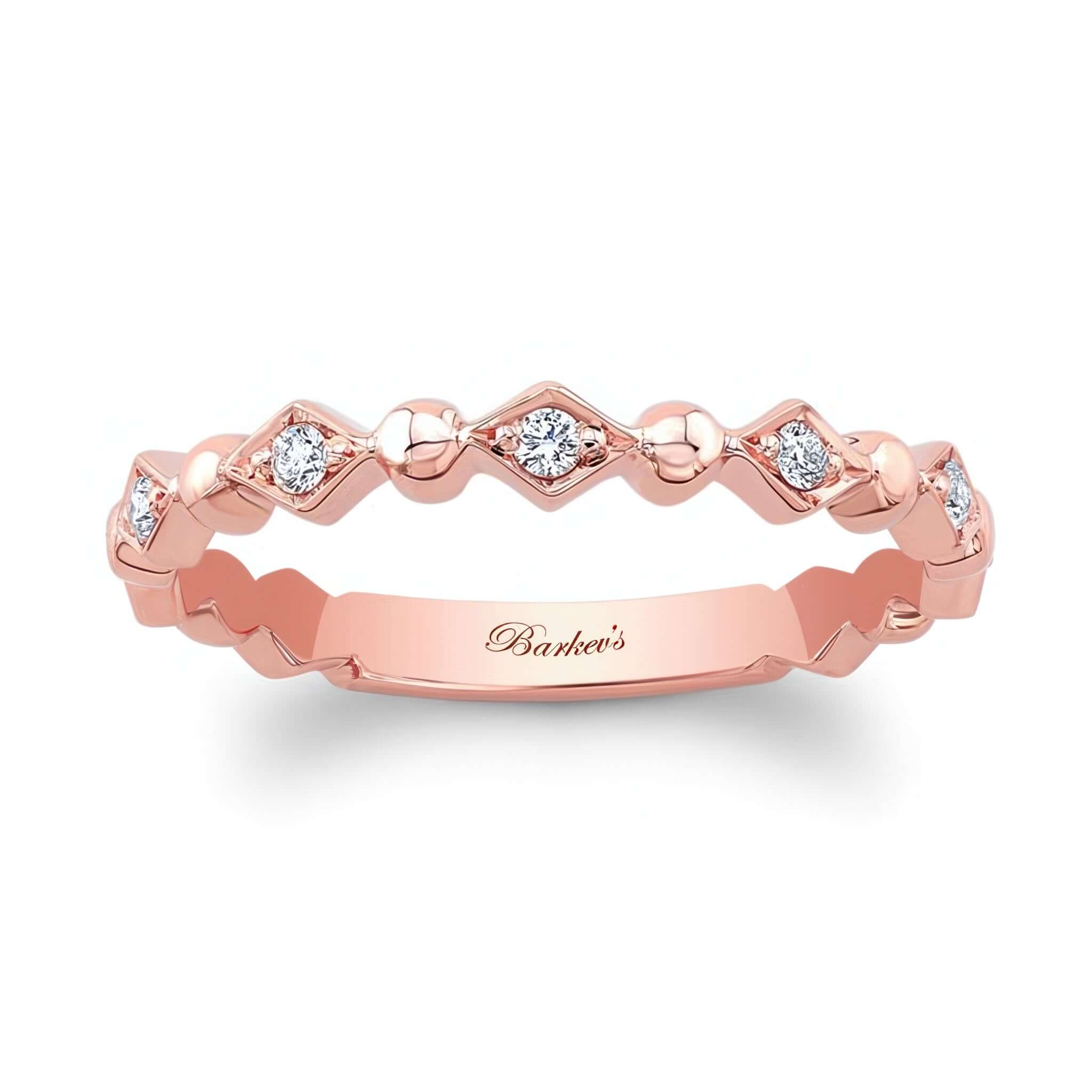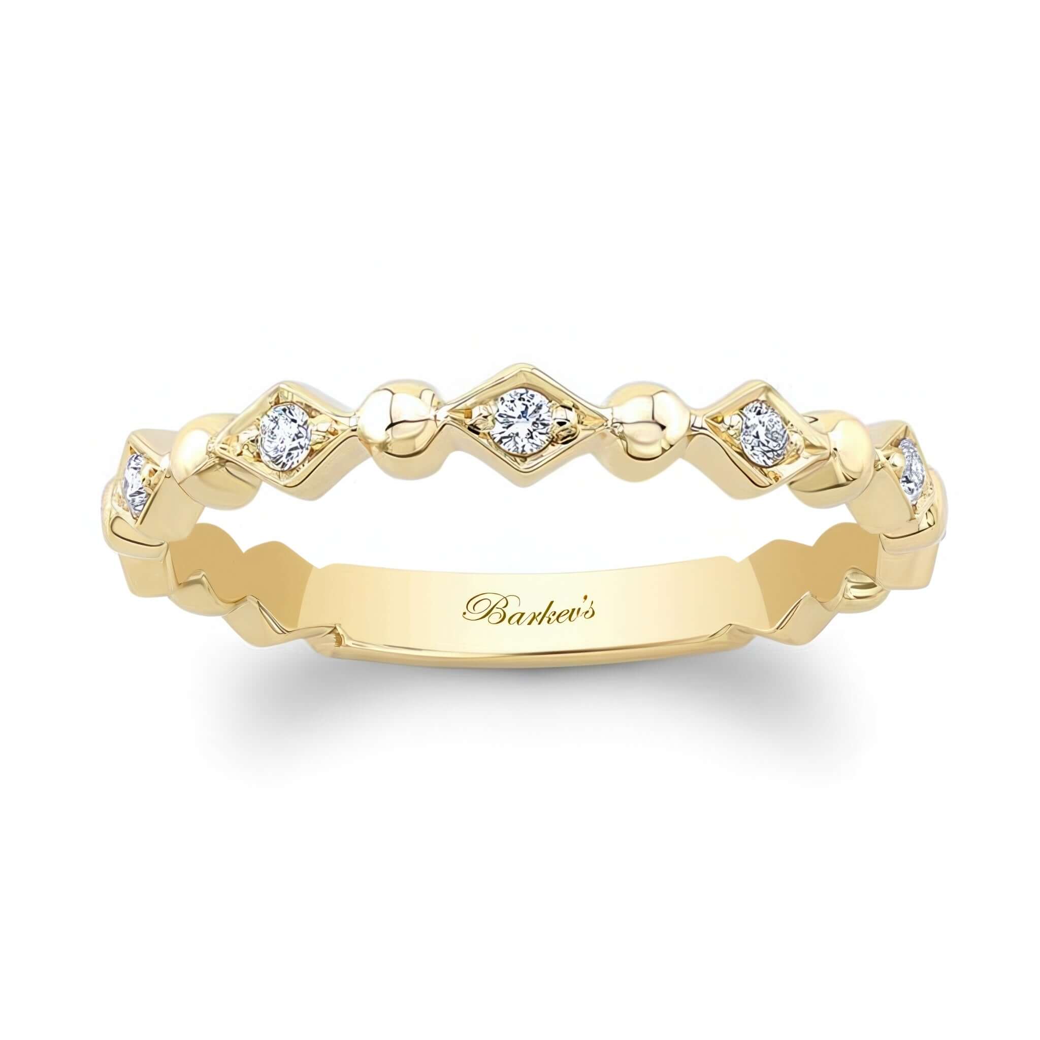 This vintage wedding band features an intricate round and diamond shaped wavy design with nine melees artfully placed to create that dramatic look.