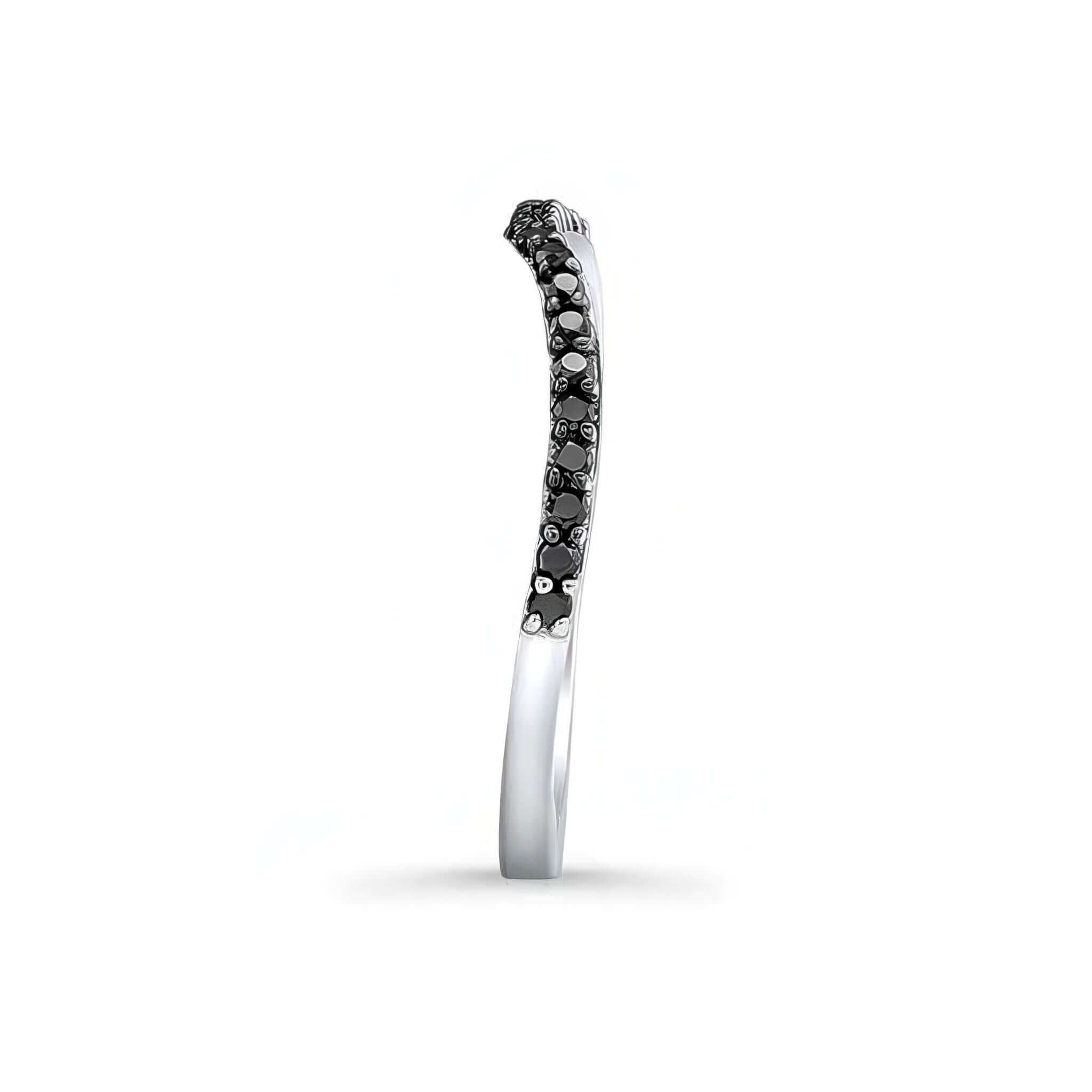 Elevate your bridal stack with the perfect pairing to our bestselling twist engagement ring—Style 8076LBK. This coordinating wedding band is sleek, elegant, and designed to fit like a dream alongside the engagement ring’s curving shoulders. Crafted with a modern silhouette and adorned with sparkling black diamond accents, it adds the perfect moody shimmer for those who crave something a little bolder. The shared prong setting not only keeps the stones secure but also maximizes light exposure for that extra pop of brilliance with every move.