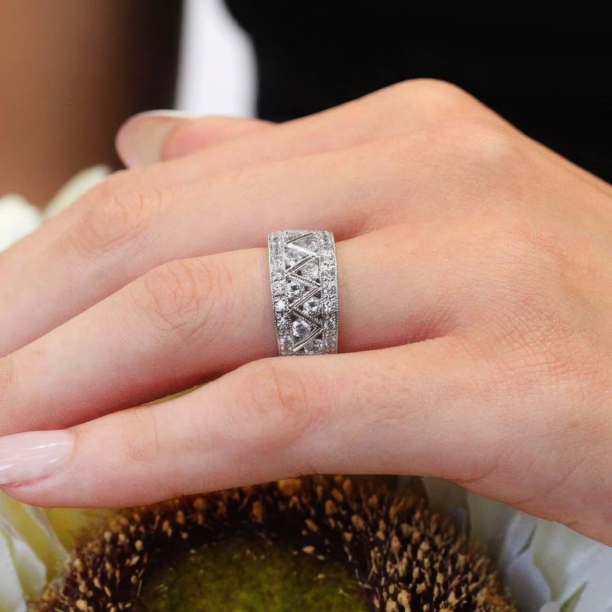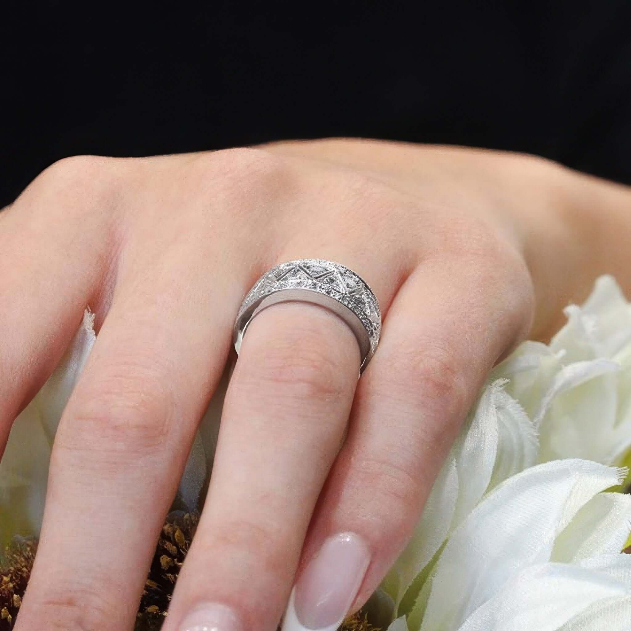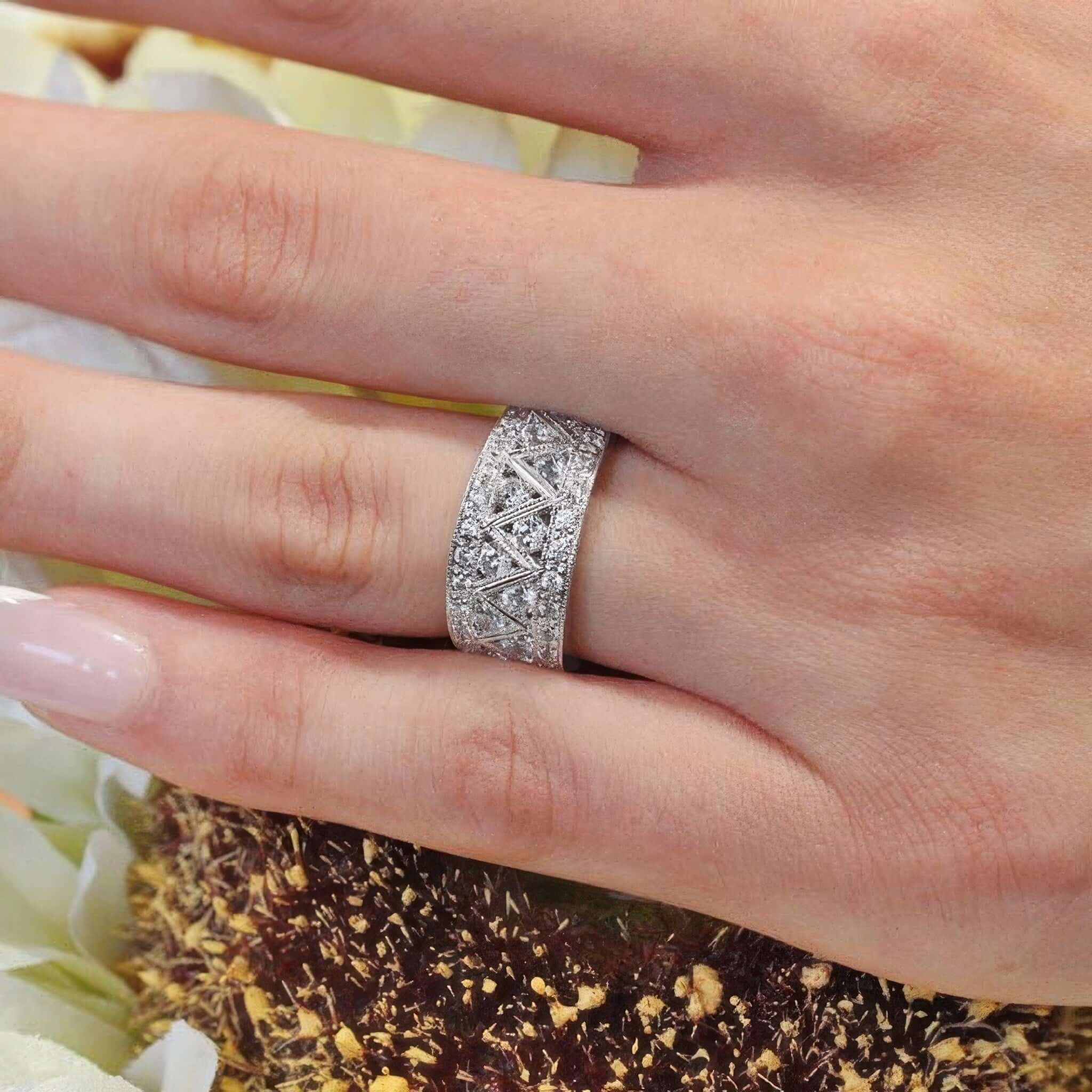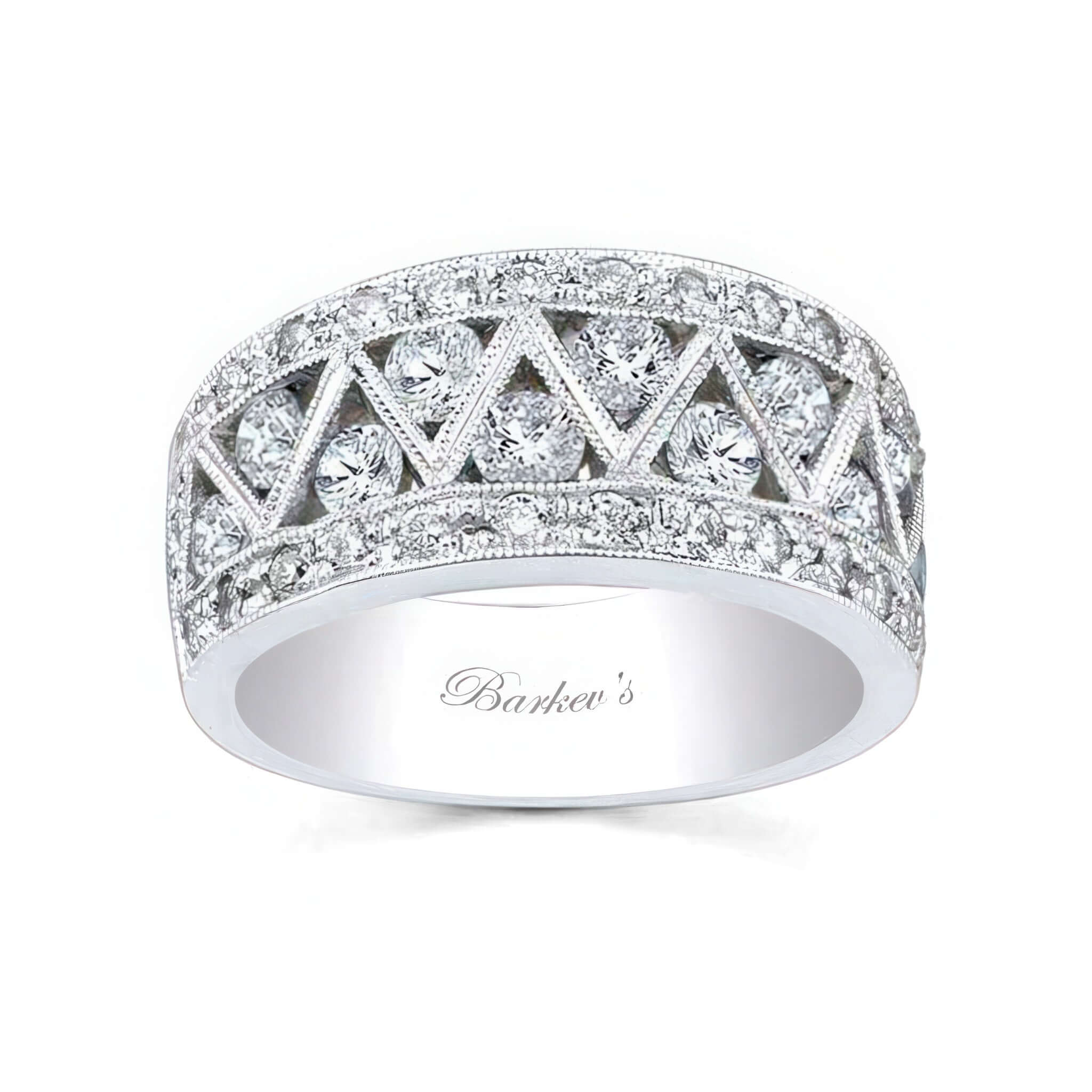 This unique white diamond wedding band features a center row of channel set diamonds artfully encased in a zigzag pattern with pave set diamonds framing the sides and a milgrain finish.
