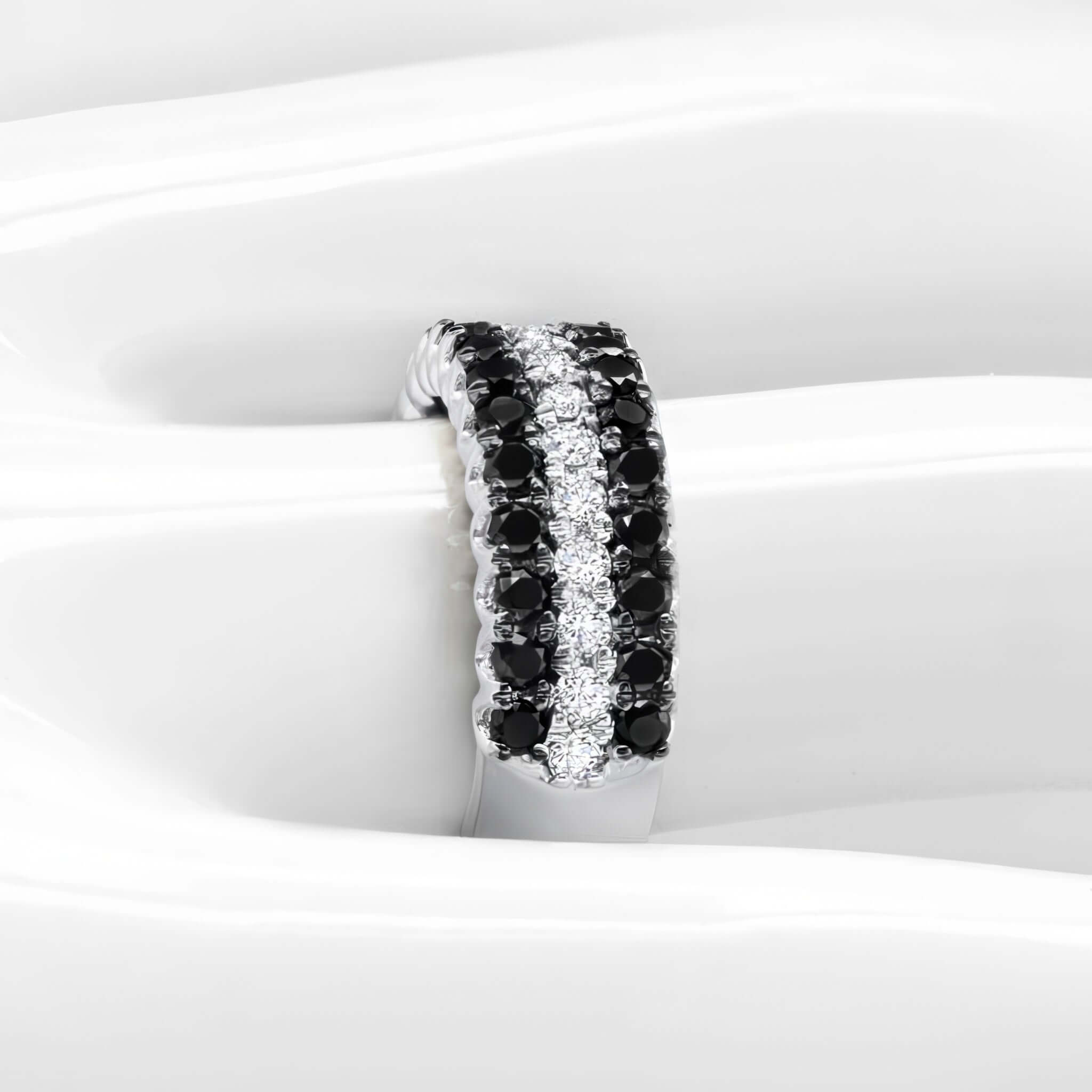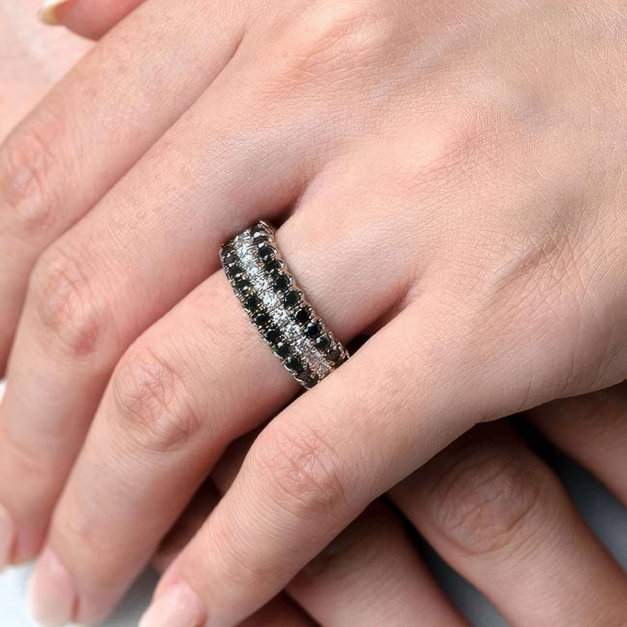 Wide Three Row Black And White Diamond Wedding Band