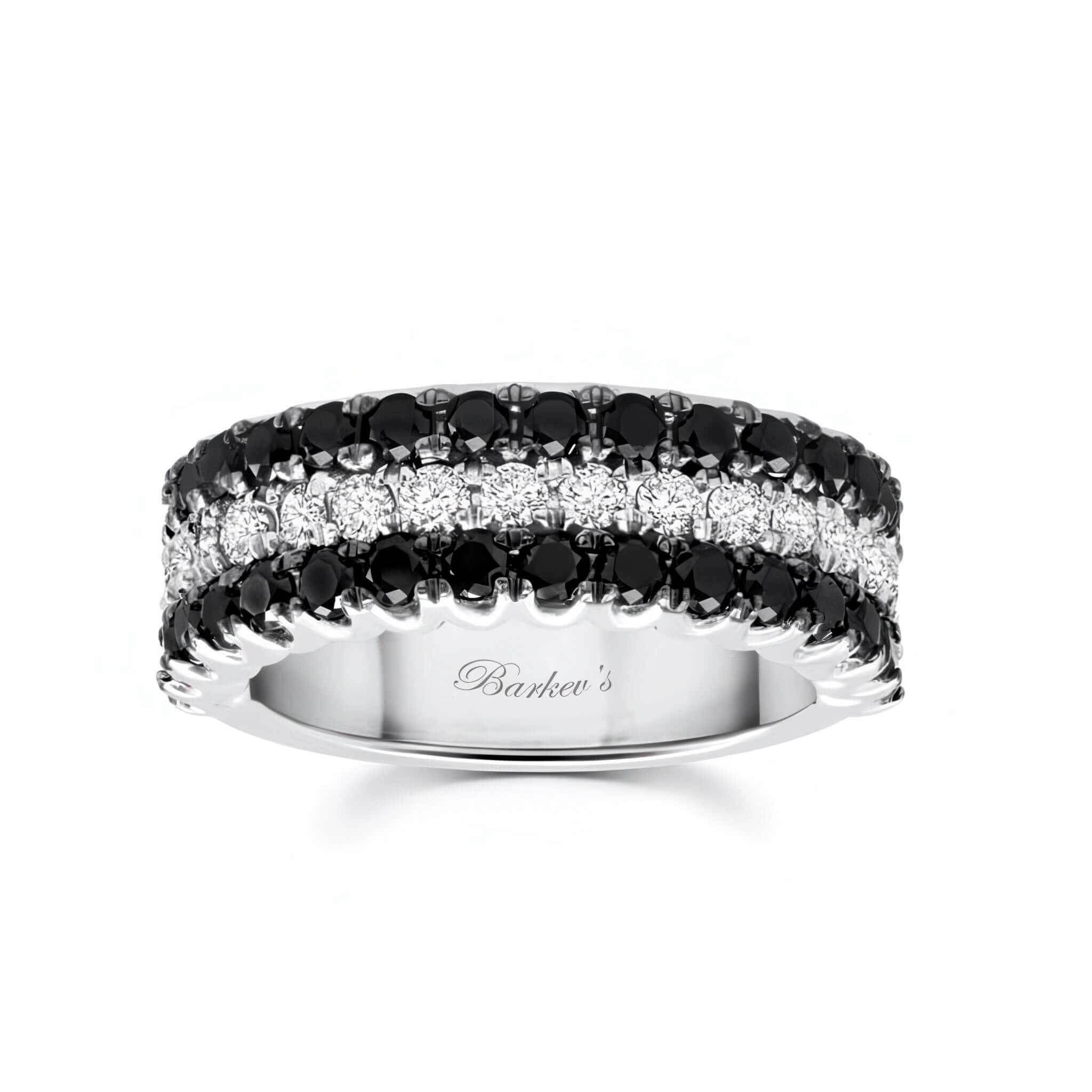 This wide three row black and white diamond wedding band features alternating rows of shared prong set black and white diamonds that provide sparkle and is sure to catch the eye of many admirers.