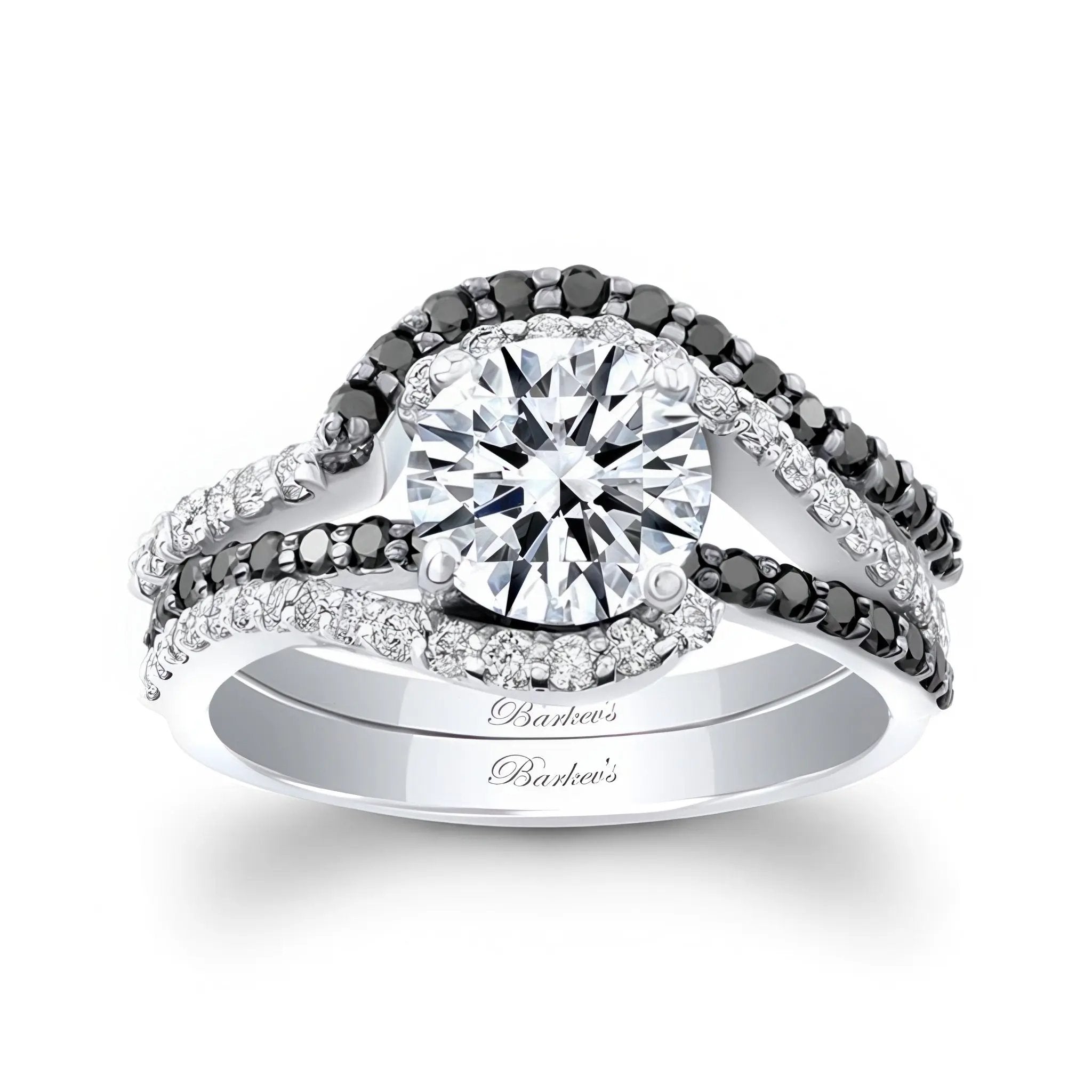 This 1 carat black diamond accent wedding set features an engagement ring with a split shank that curves around the prong set round center, a bridge running underneath and a matching wedding band all adorned with shared prong set black and white diamonds for a classic yet brilliant look.