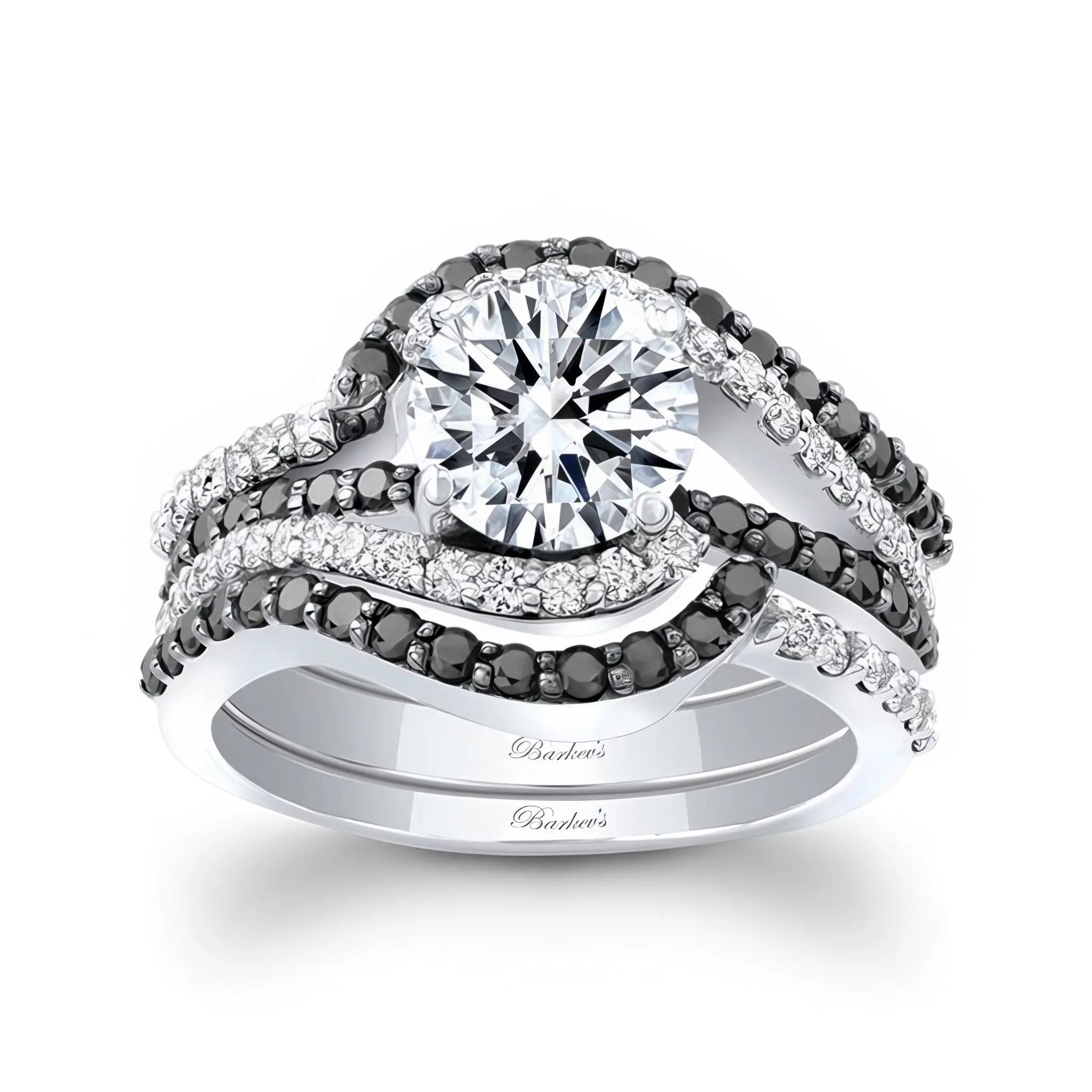 This 1 carat black diamond accent wedding set with 2 bands features an engagement ring with a split shank that curves around the prong set round center, a bridge running underneath and a matching 2 wedding bands all adorned with shared prong set black and white diamonds for a classic yet brilliant look.