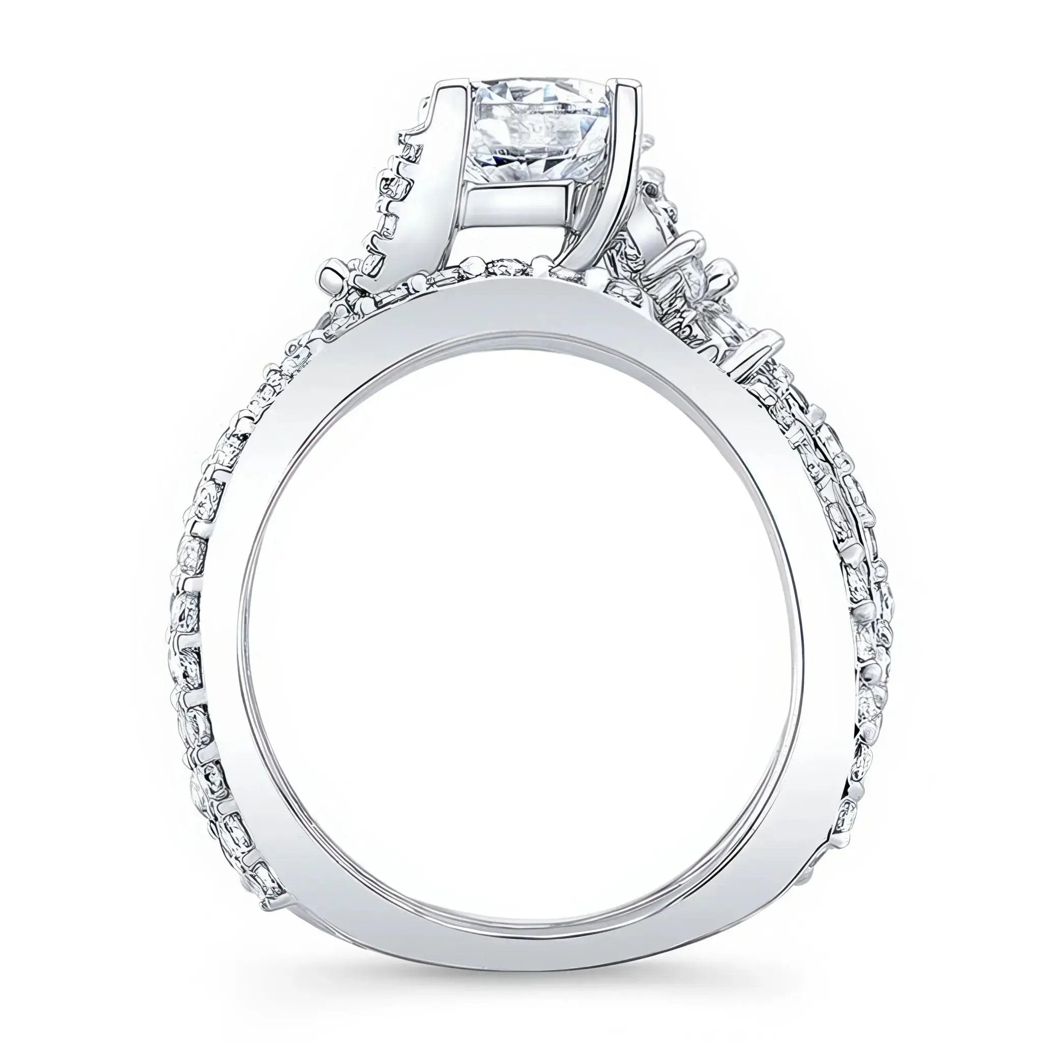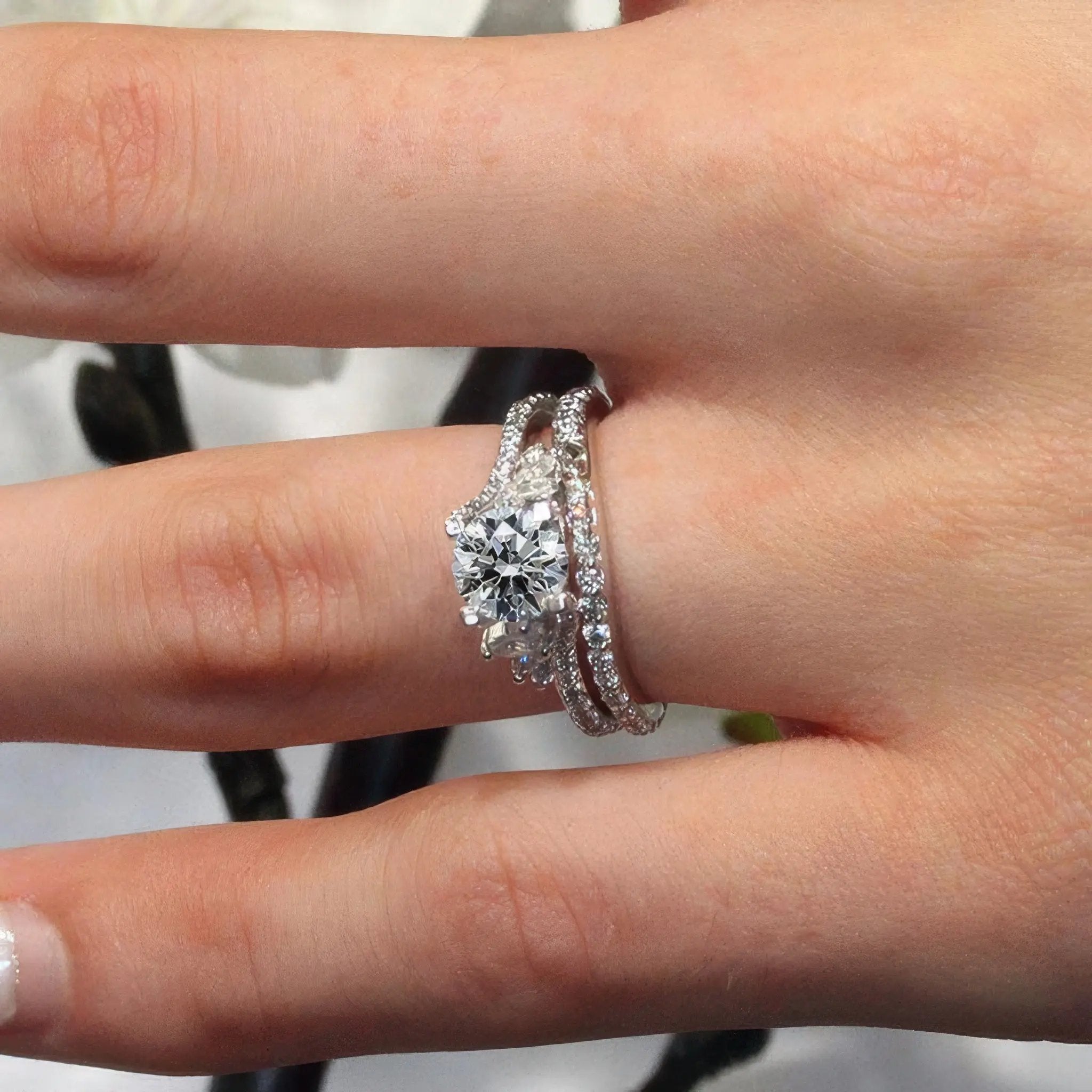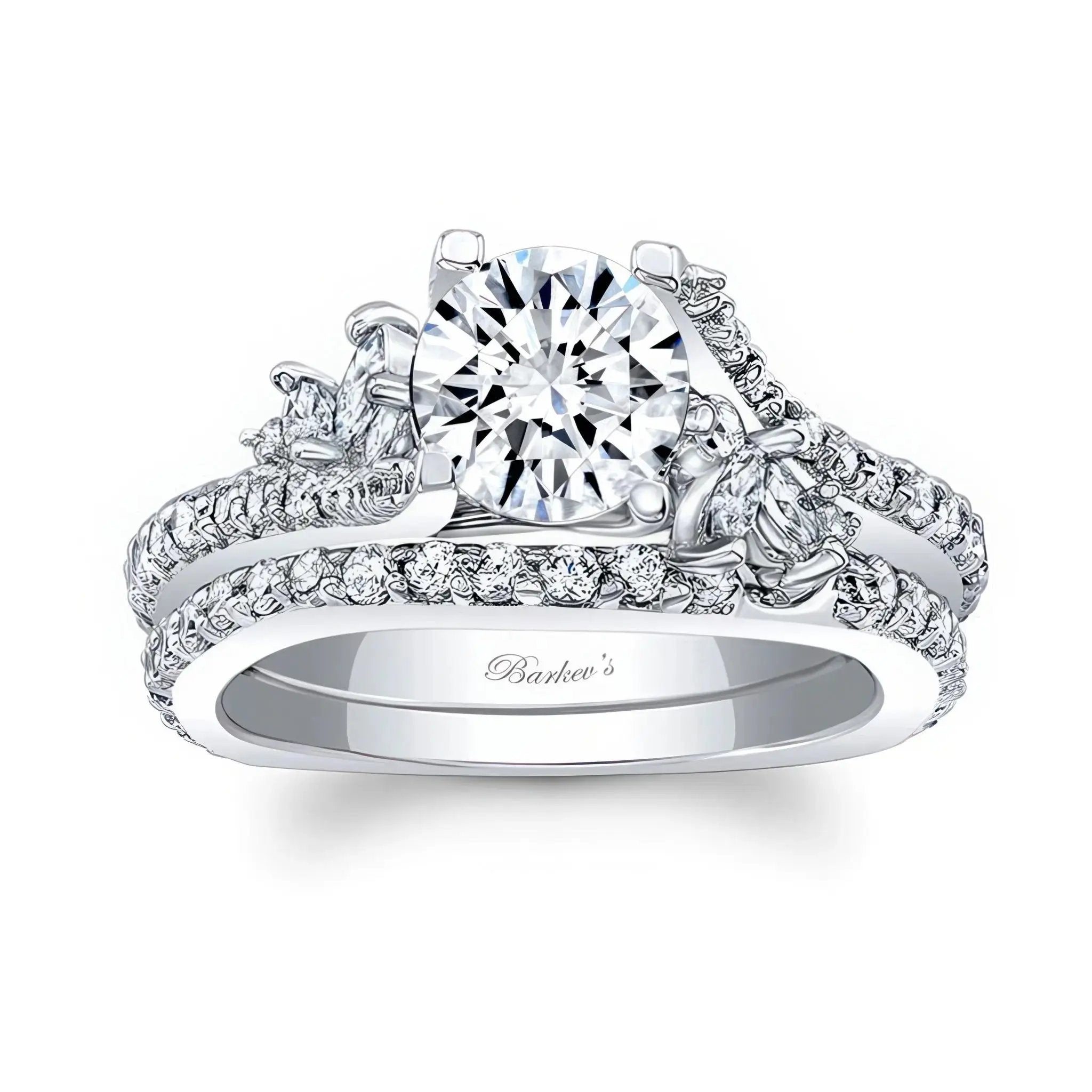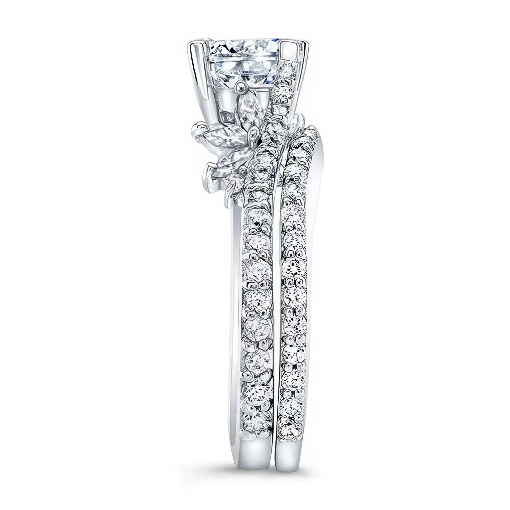 This elegant 1 carat round diamond bridal set features a prong set center stone graced on each side with a flare of marquise and round diamonds cascading down the dainty shank. Comes with a matching wedding band.