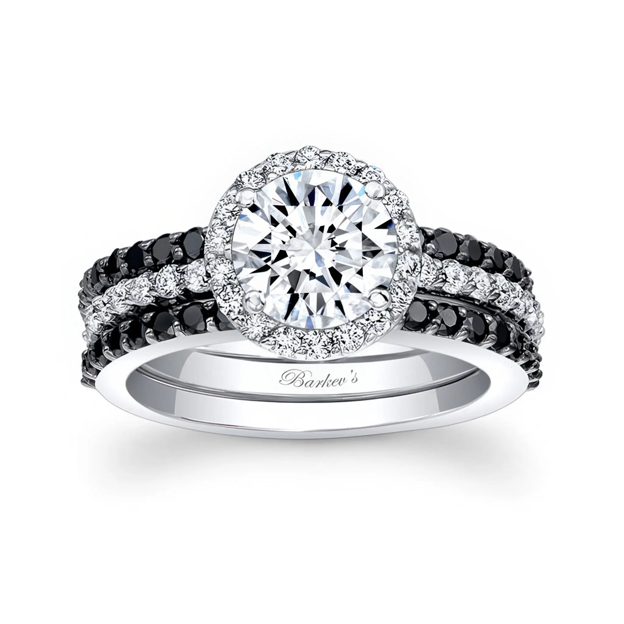 This 3 piece black diamond accent halo wedding ring set features a round center with a halo encircling it and diamonds cascading down the dainty shank for a look of sheer elegance. Comes with two matching black diamond wedding bands.