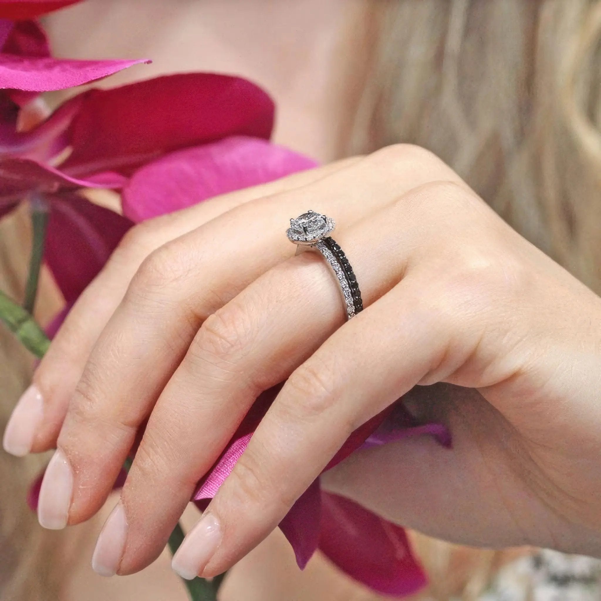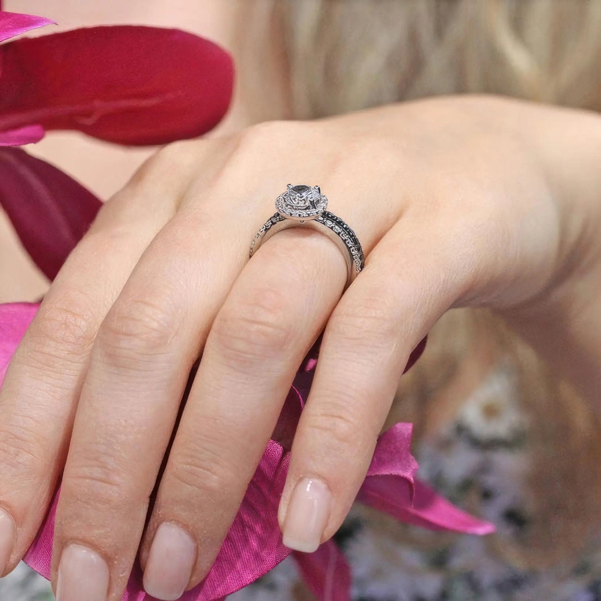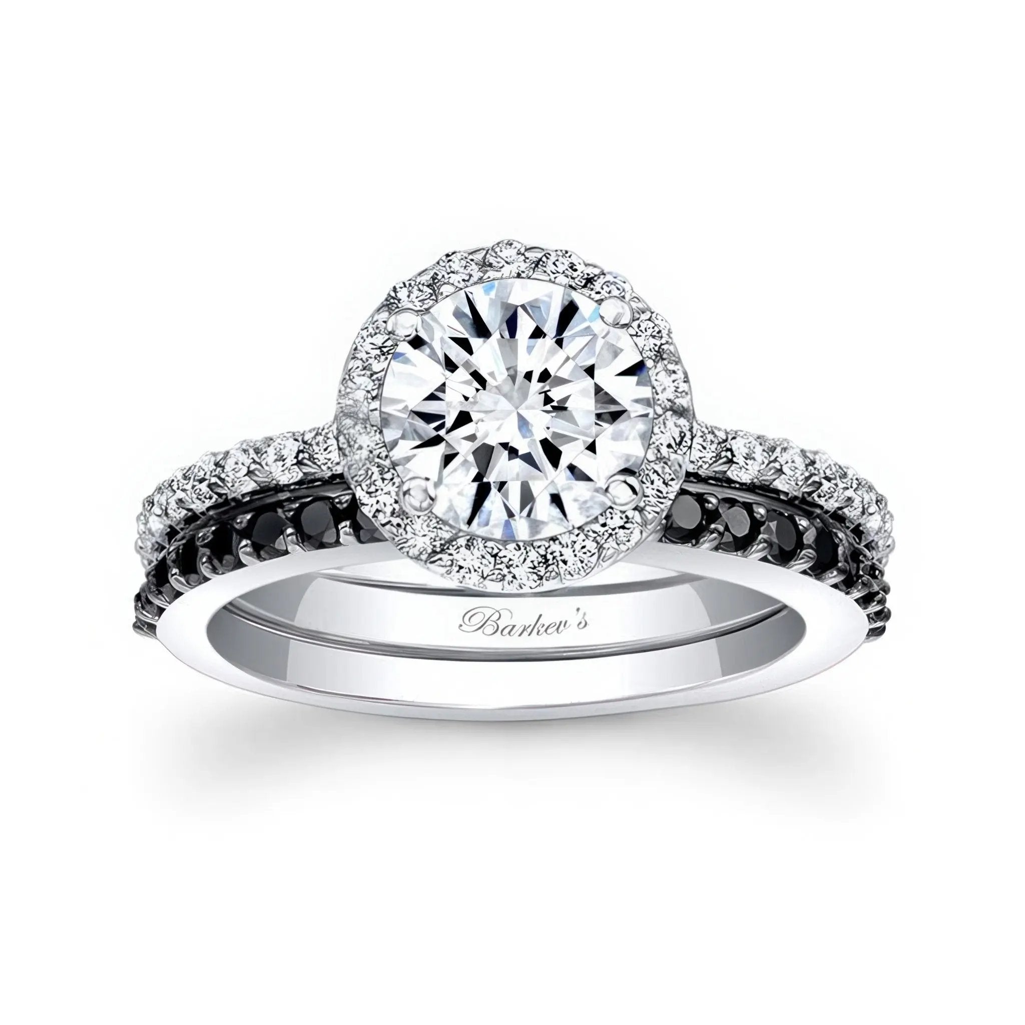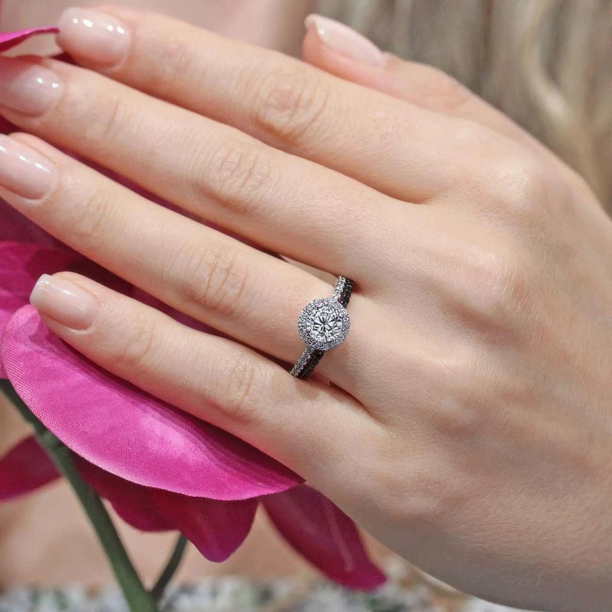 This black diamond accent halo wedding ring set features a round center with a halo encircling it and diamonds cascading down the dainty shank for a look of sheer elegance. Comes with a matching black diamond wedding band.