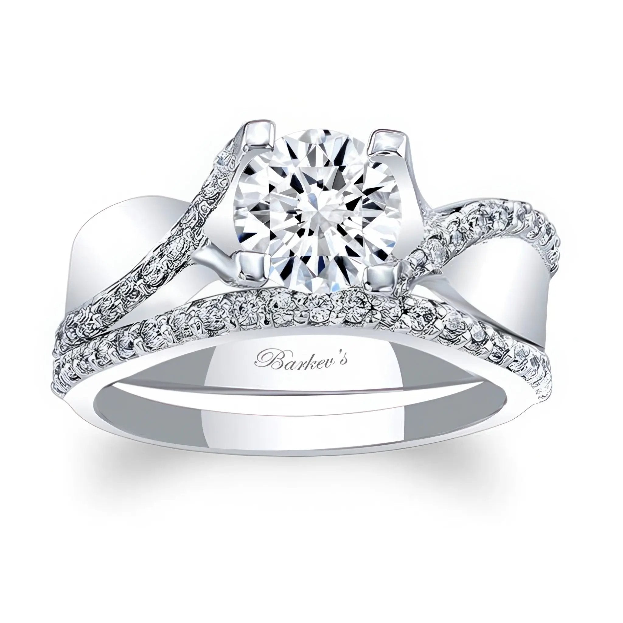 This criss cross band bridal set sports a round center with shared prong set diamonds on the shoulders for the ultimate in elegance. Comes with a matching wedding band.
