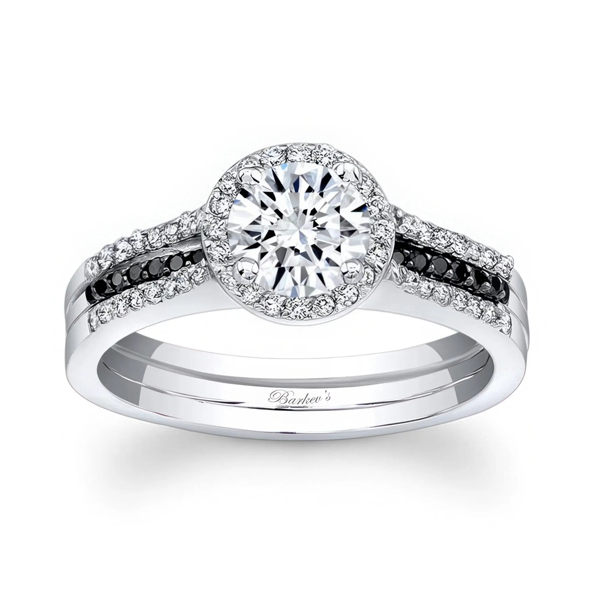 This half carat interlock halo black diamond accent bridal set features a round prong set center with a diamond halo around it and diamonds cascading down the shoulders. Comes with a matching black diamond wedding band that slips into the ring.