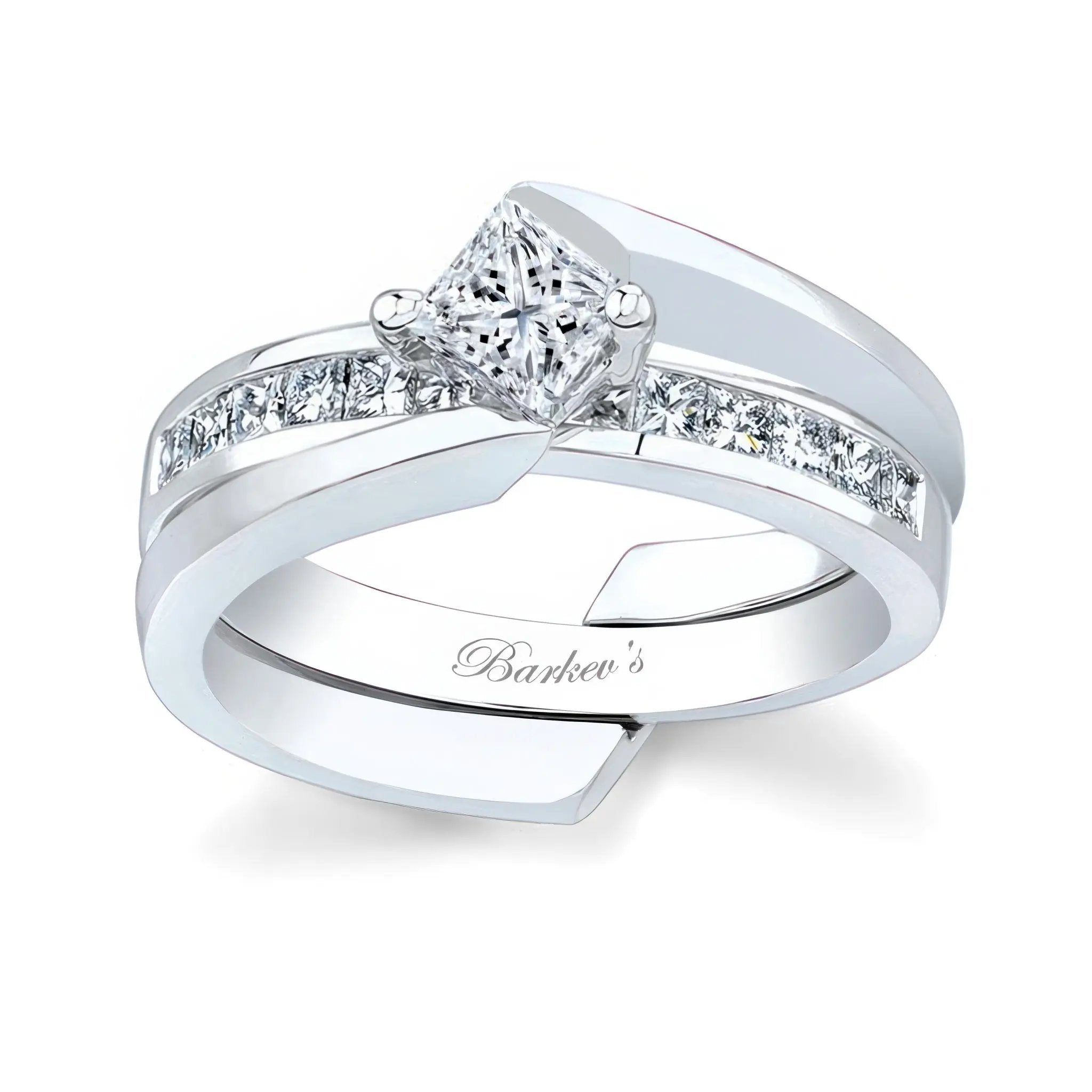 This princess cut interlock bridal set features a solitaire ring with a prong set princess cut center and a channel set princess cut diamond wedding band for an elegant look.