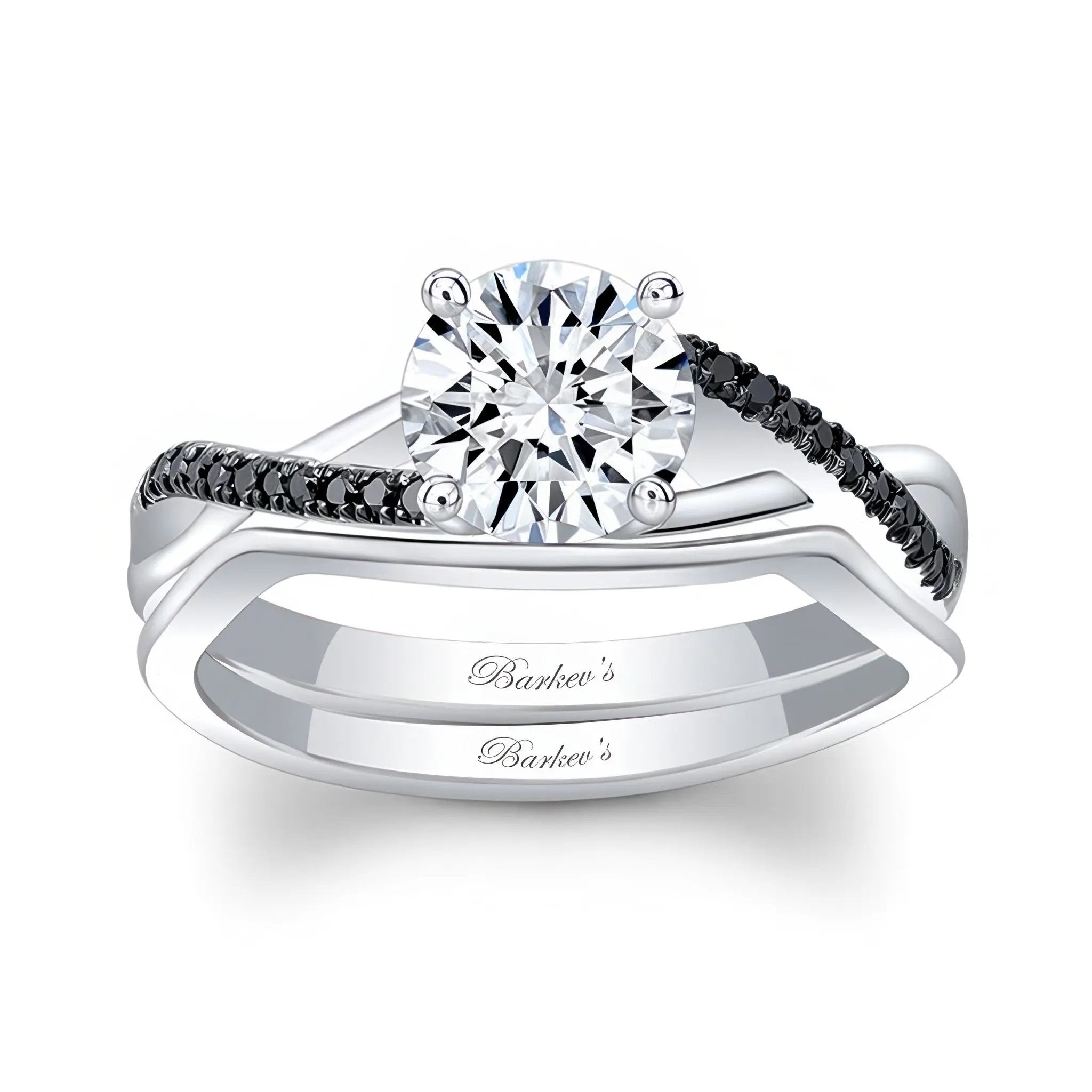 This stunning simple black diamond accent bridal set features a prong set round center with intertwining shoulders adorned with shared prong set black diamond melees. Comes with a matching wedding band.