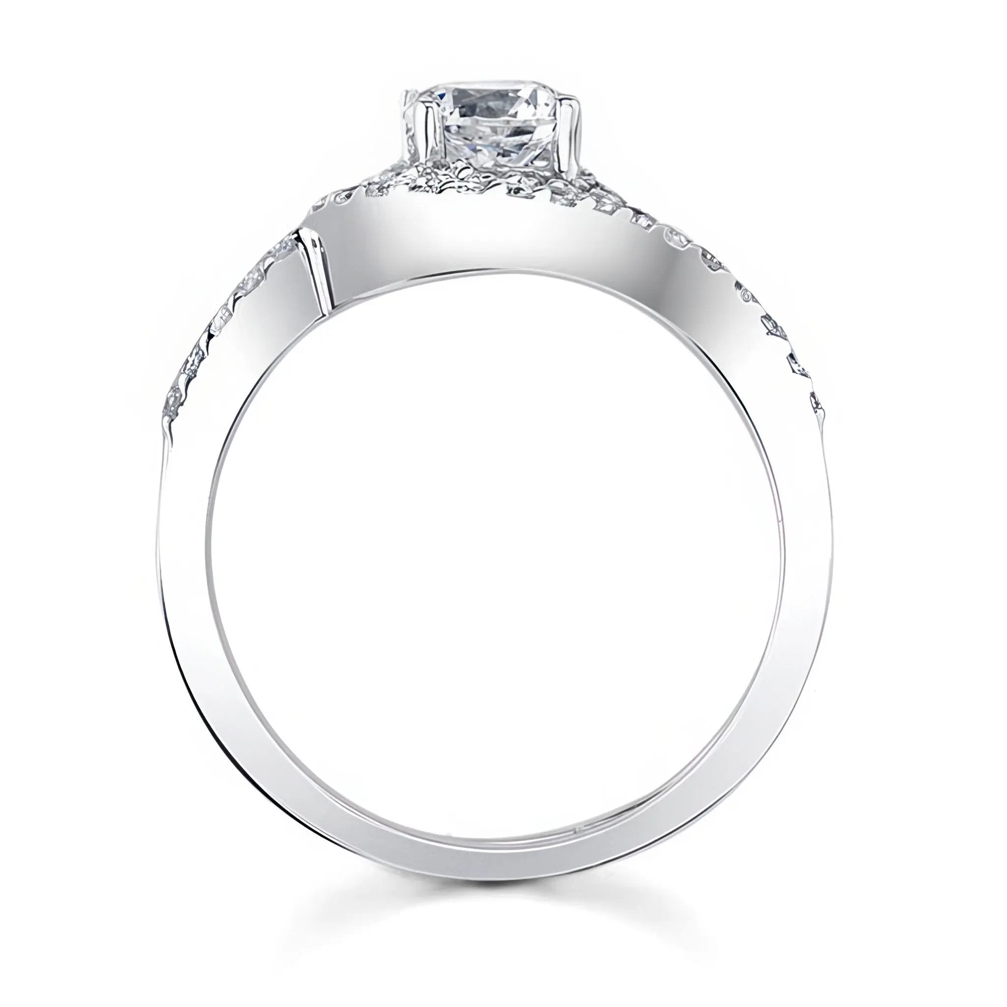 This swirl diamond wedding ring set features a prong set round center while shared prong set diamonds swirl around and cascade down the shoulders. Comes with a matching diamond wedding band.