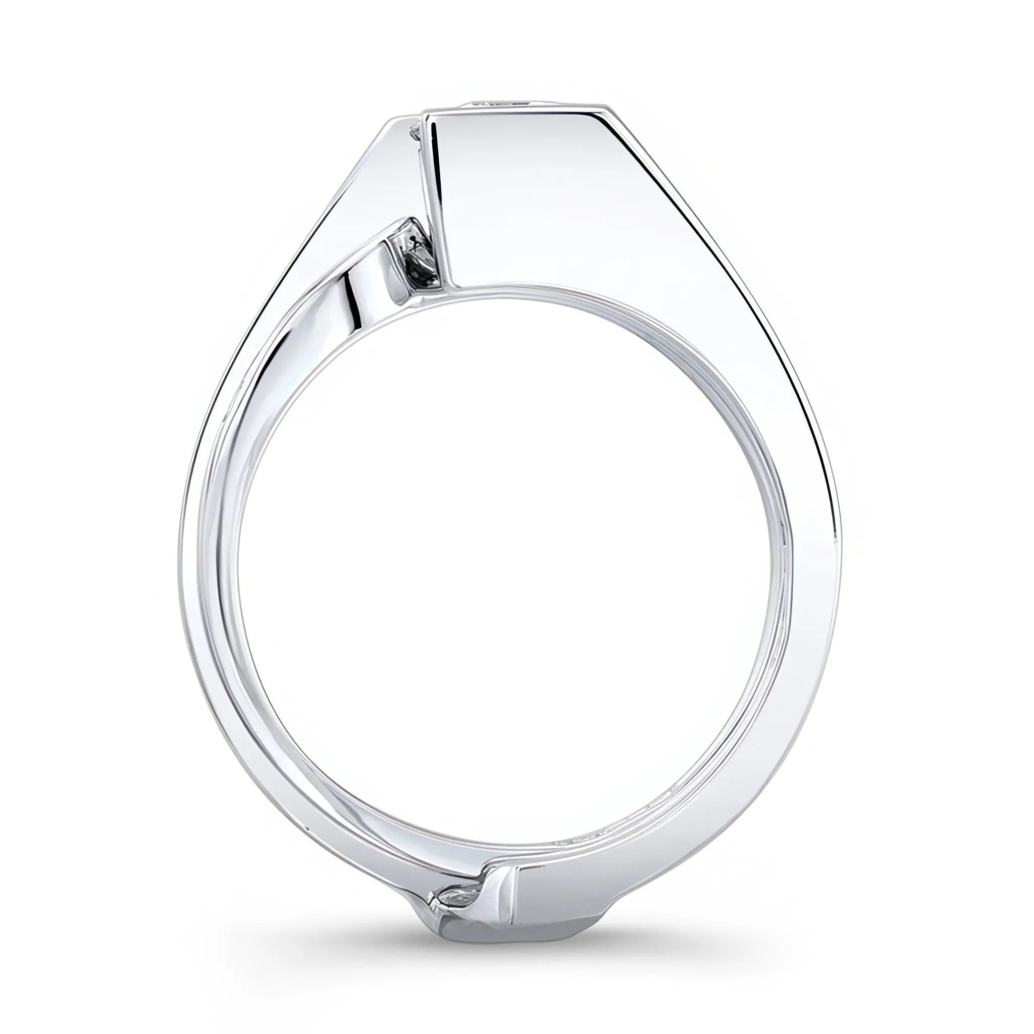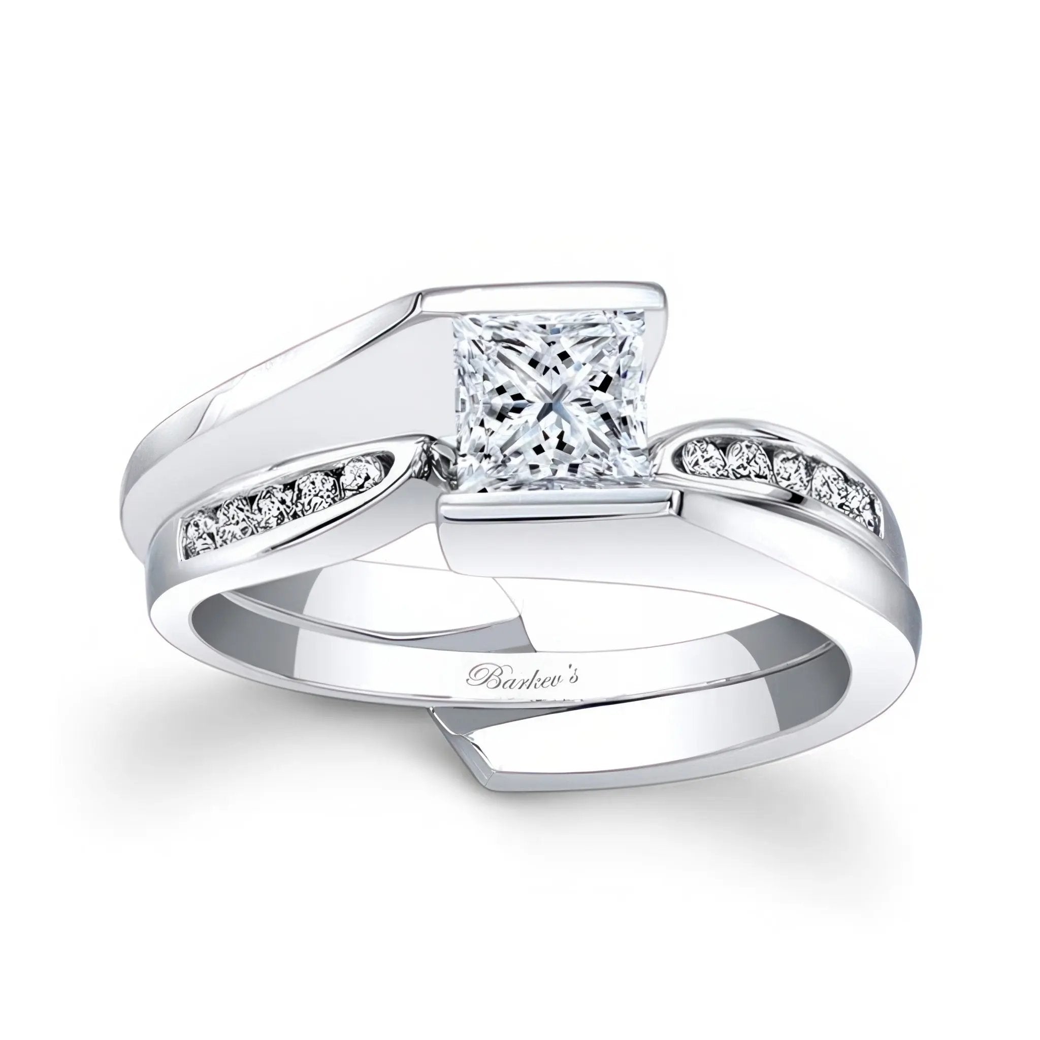 This unique interlock solitaire bridal set features a soltaire ring with a channel set princess cut center and a channel set diamond wedding band.