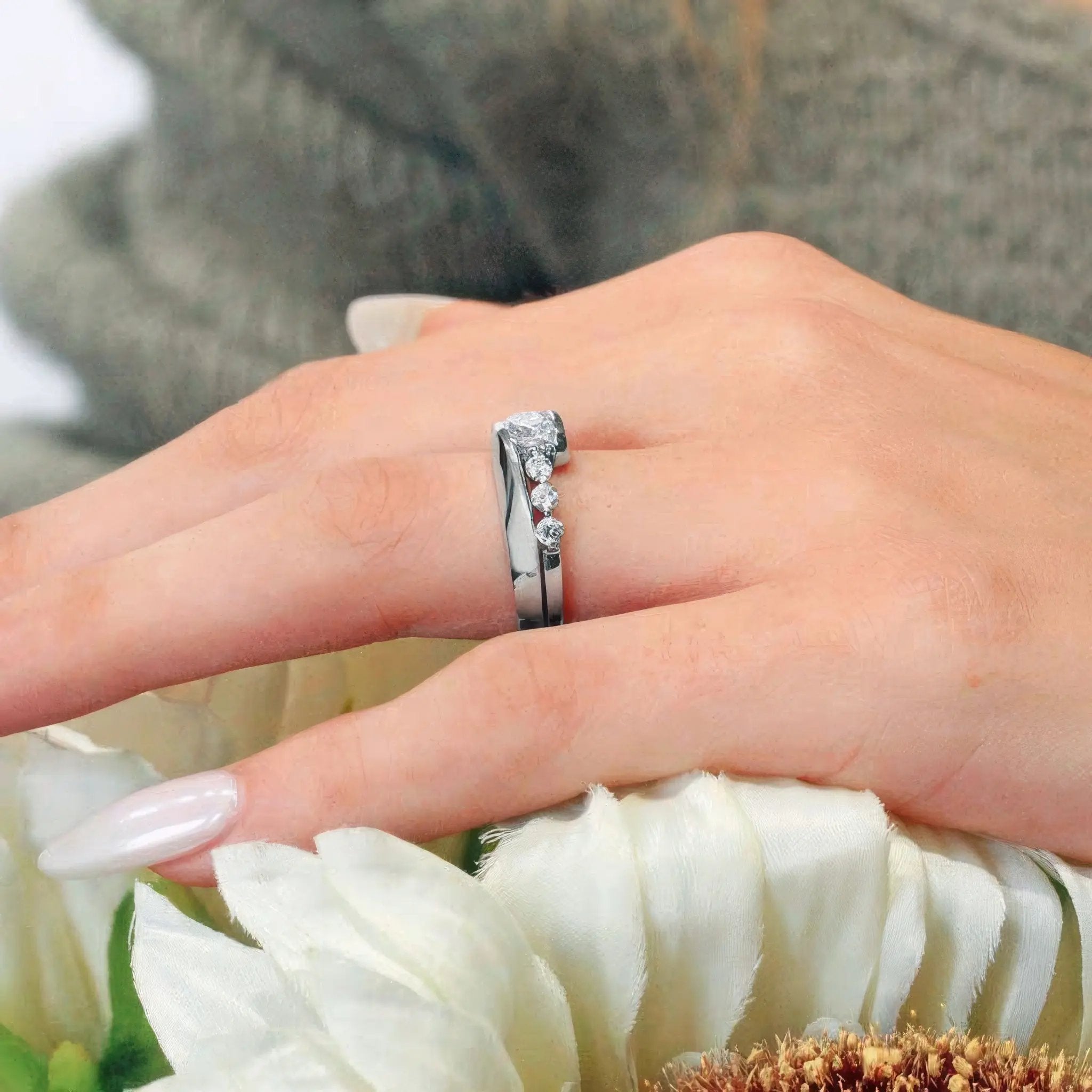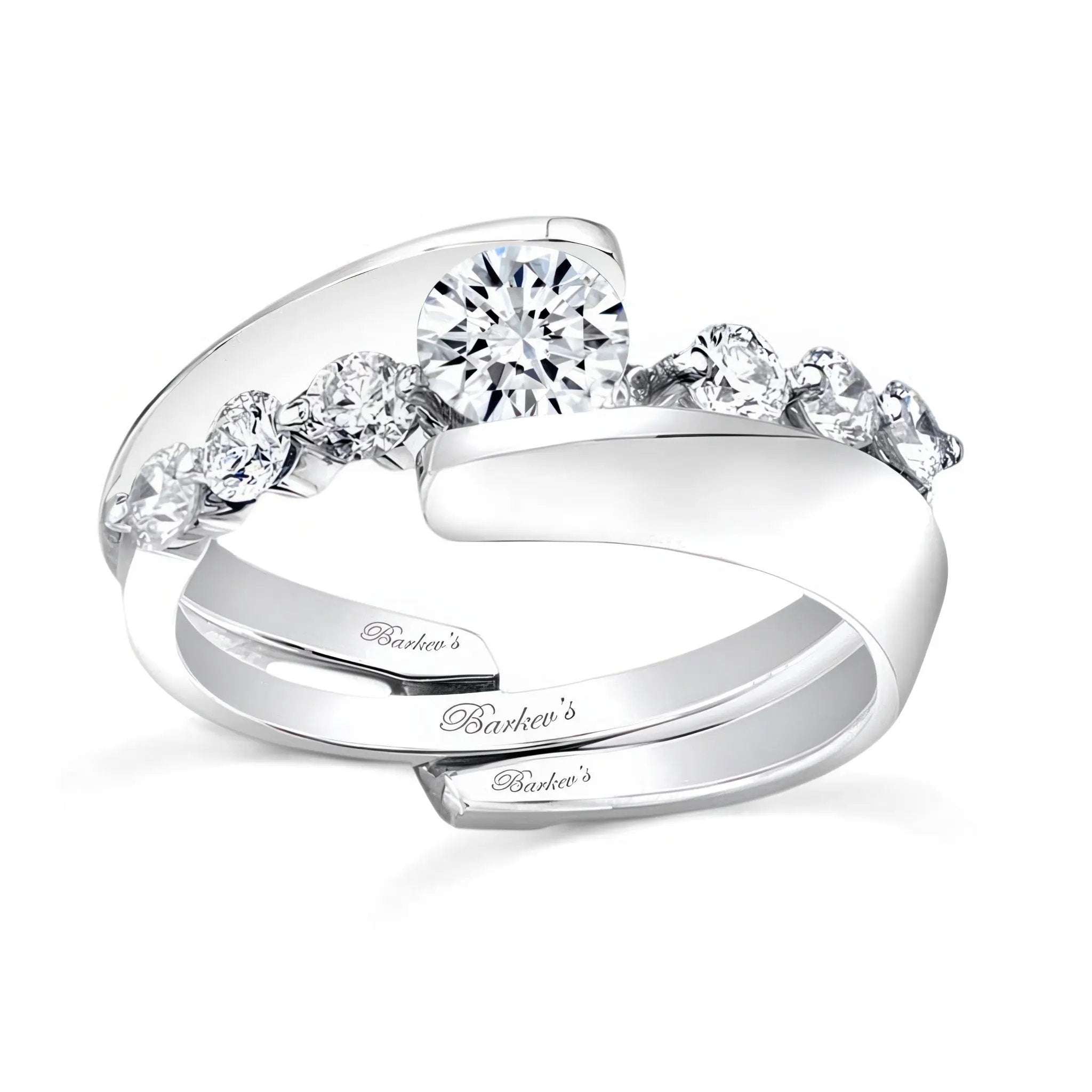 This unique interlocking bridal set features a channel set round center and a wedding band with shared prong set diamonds that interlocks into the ring.