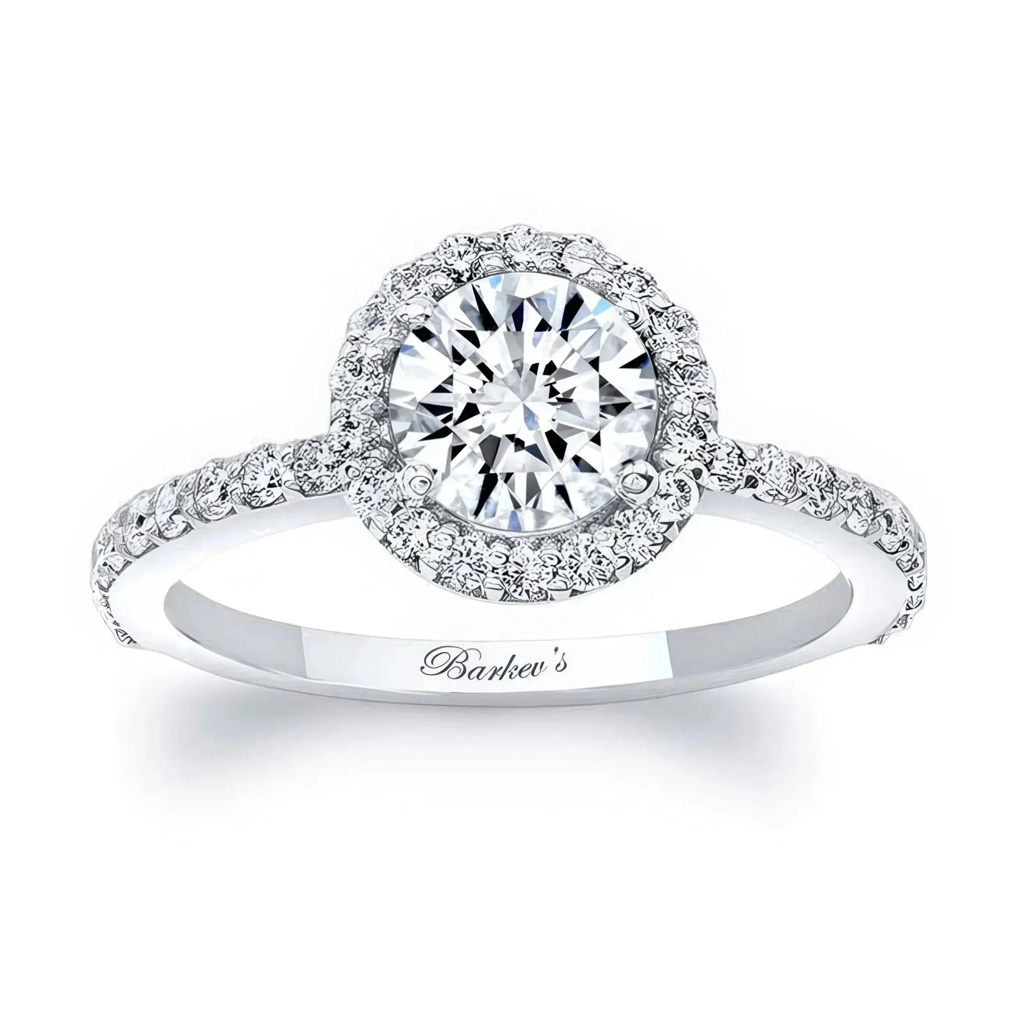 This diamond halo ring features a round center with a halo encircling it and diamonds cascading down the dainty shank for a look of sheer elegance.