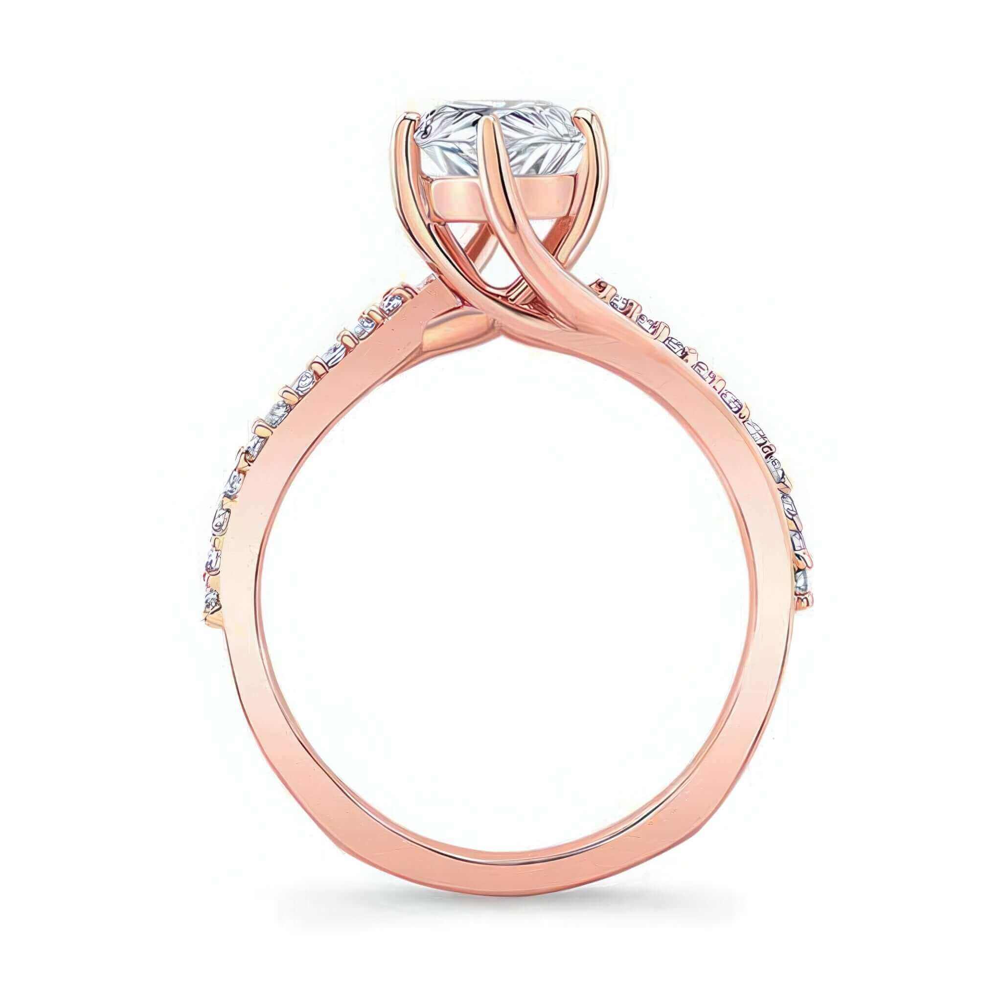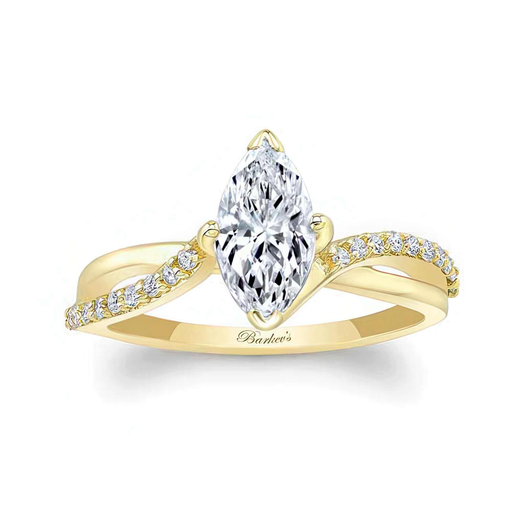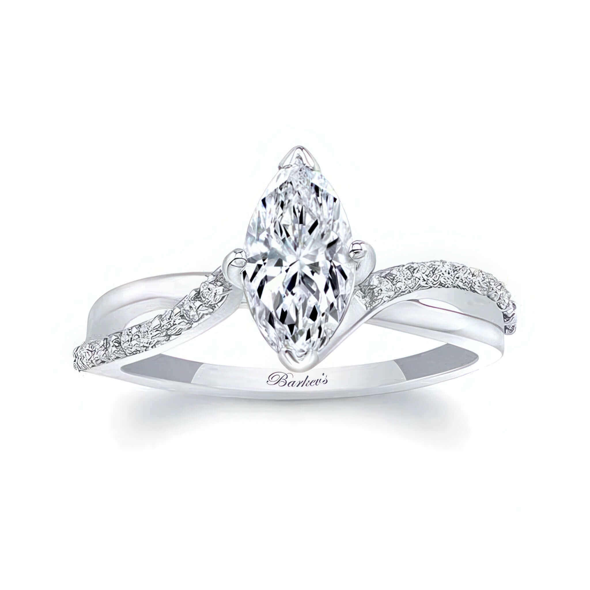 This marquise engagement ring with twisted band features open curving shoulders sweeping up to create the prongs that hold the marquise center while the opposing sides of the shank are adorned with shared-prong set diamonds for a subtle sparkle that will draw the eye.