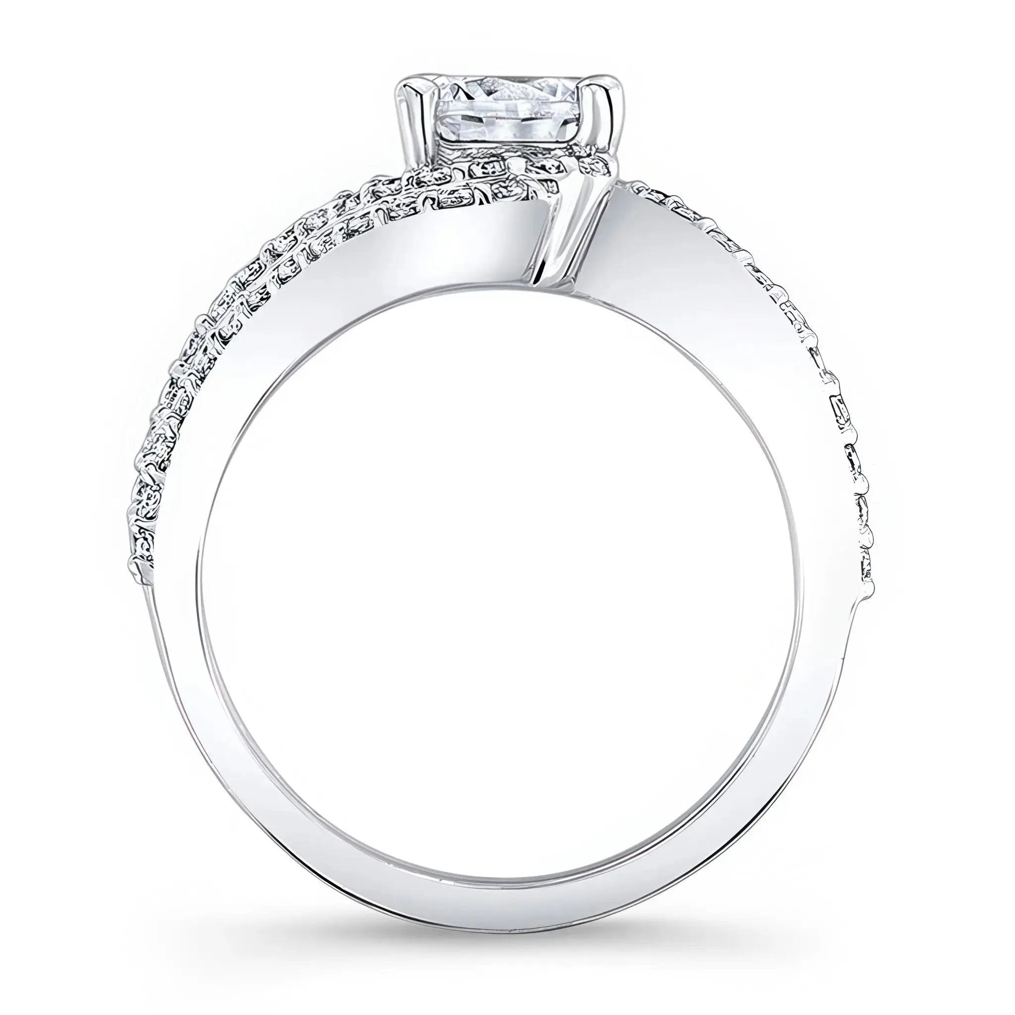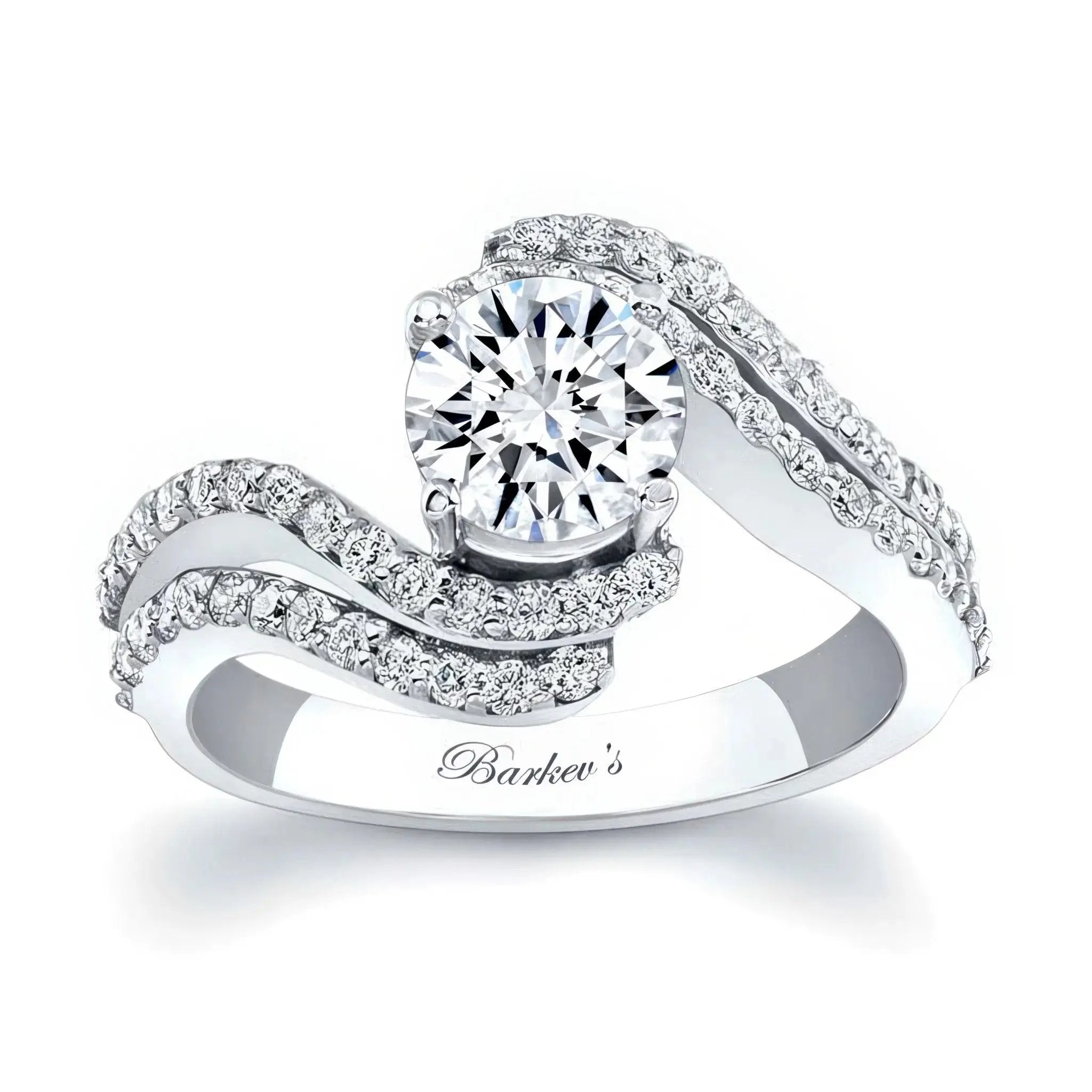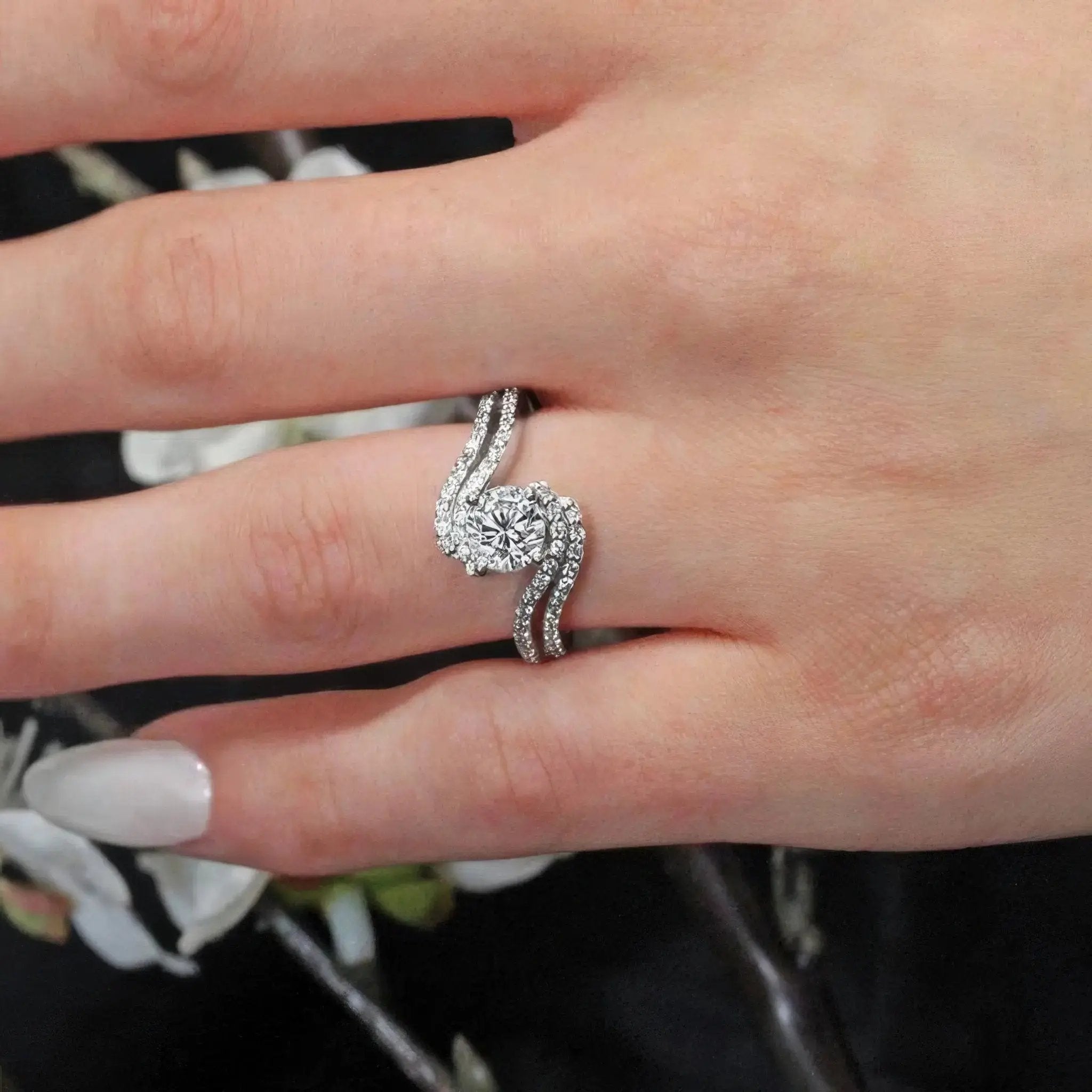 This swirl engagement ring features a double row of shared prong set diamonds swirling around the prong set round center for a classic sophisticated look.