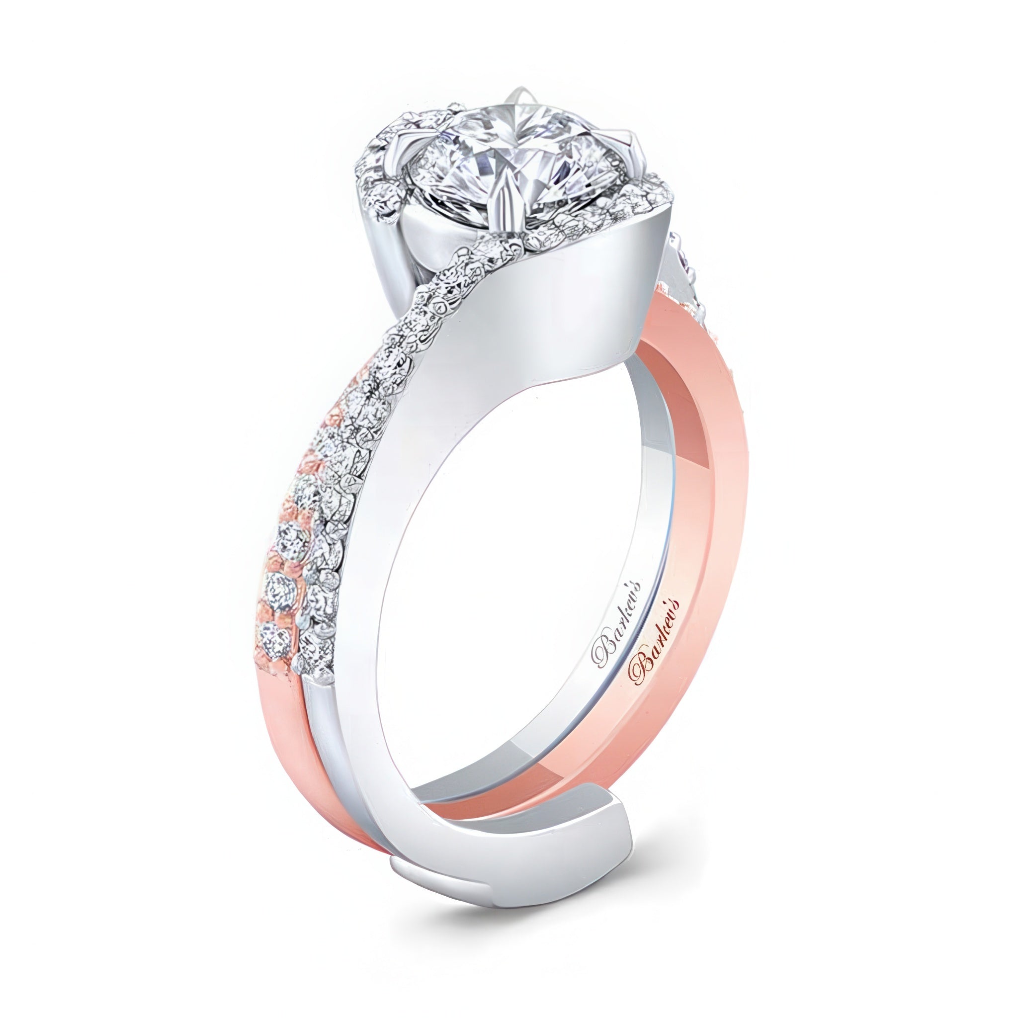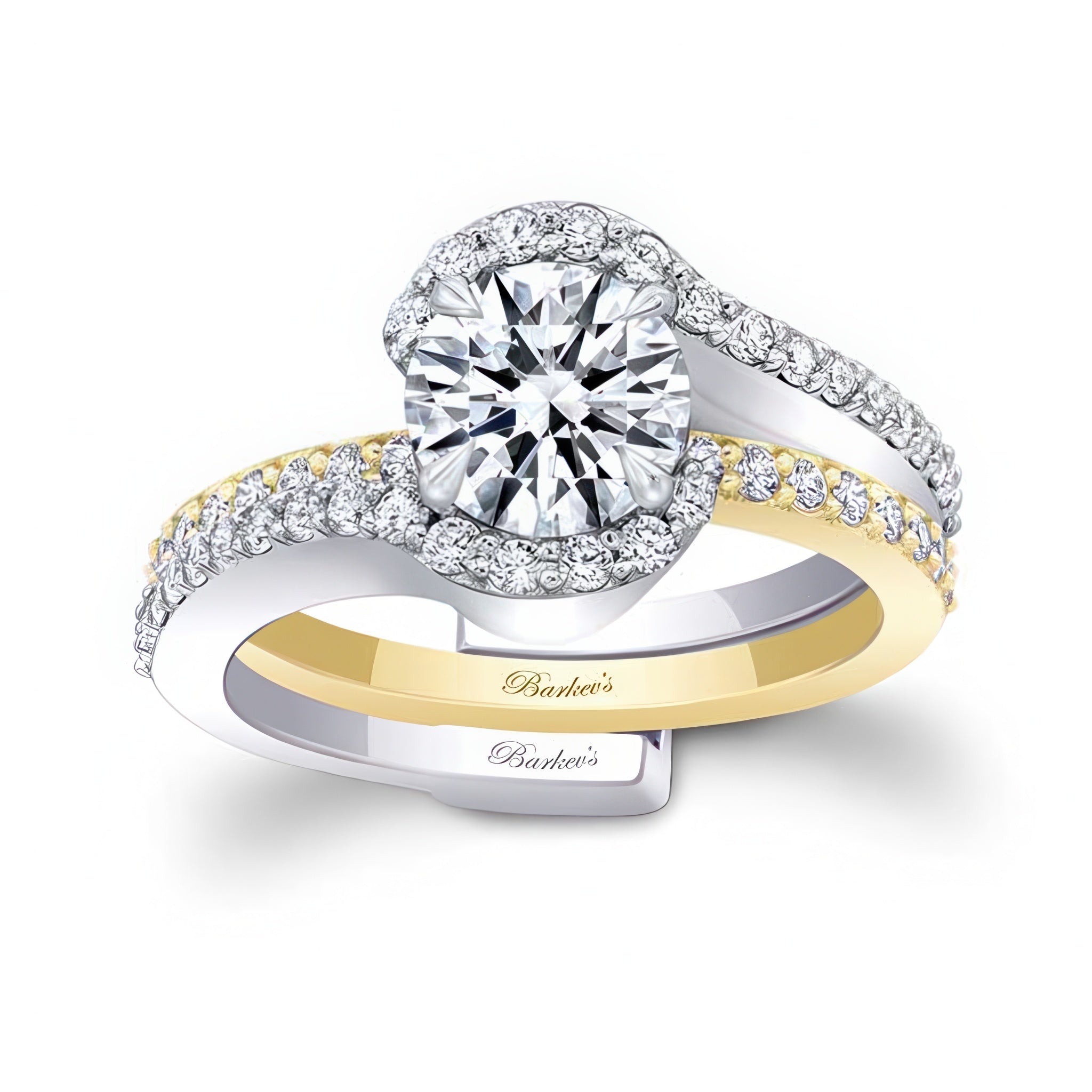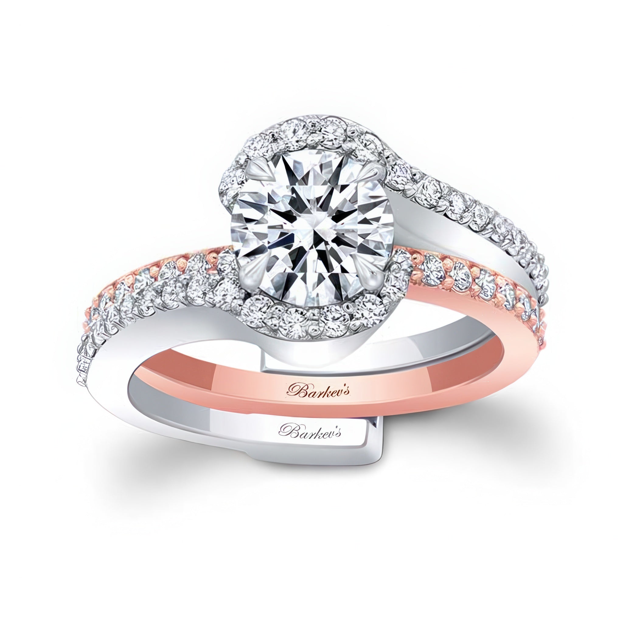 This 1 carat moissanite bridal set features a prong set round center with pave diamonds and a diamond wedding band that slips in between the split shank.
