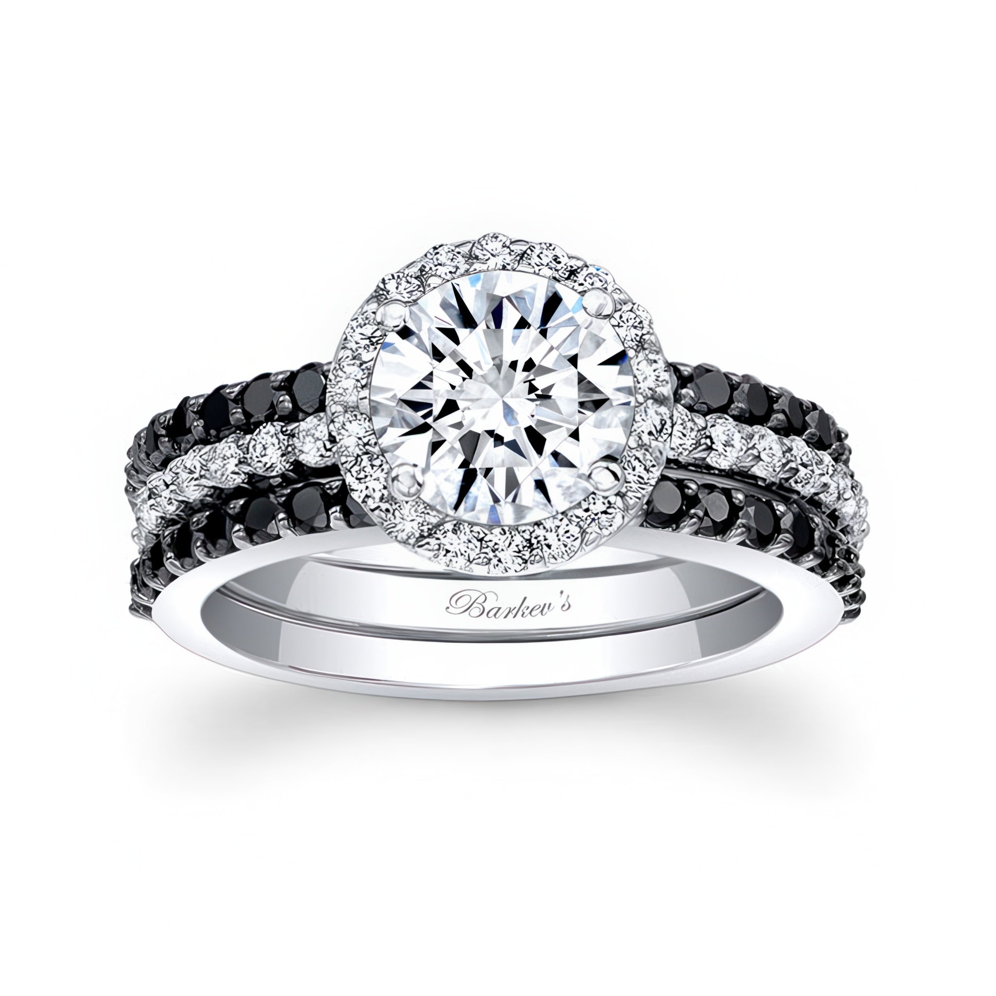 This 3 piece moissanite black diamond accent halo wedding ring set features a round center with a halo encircling it and diamonds cascading down the dainty shank for a look of sheer elegance. Comes with two matching black diamond wedding bands.
