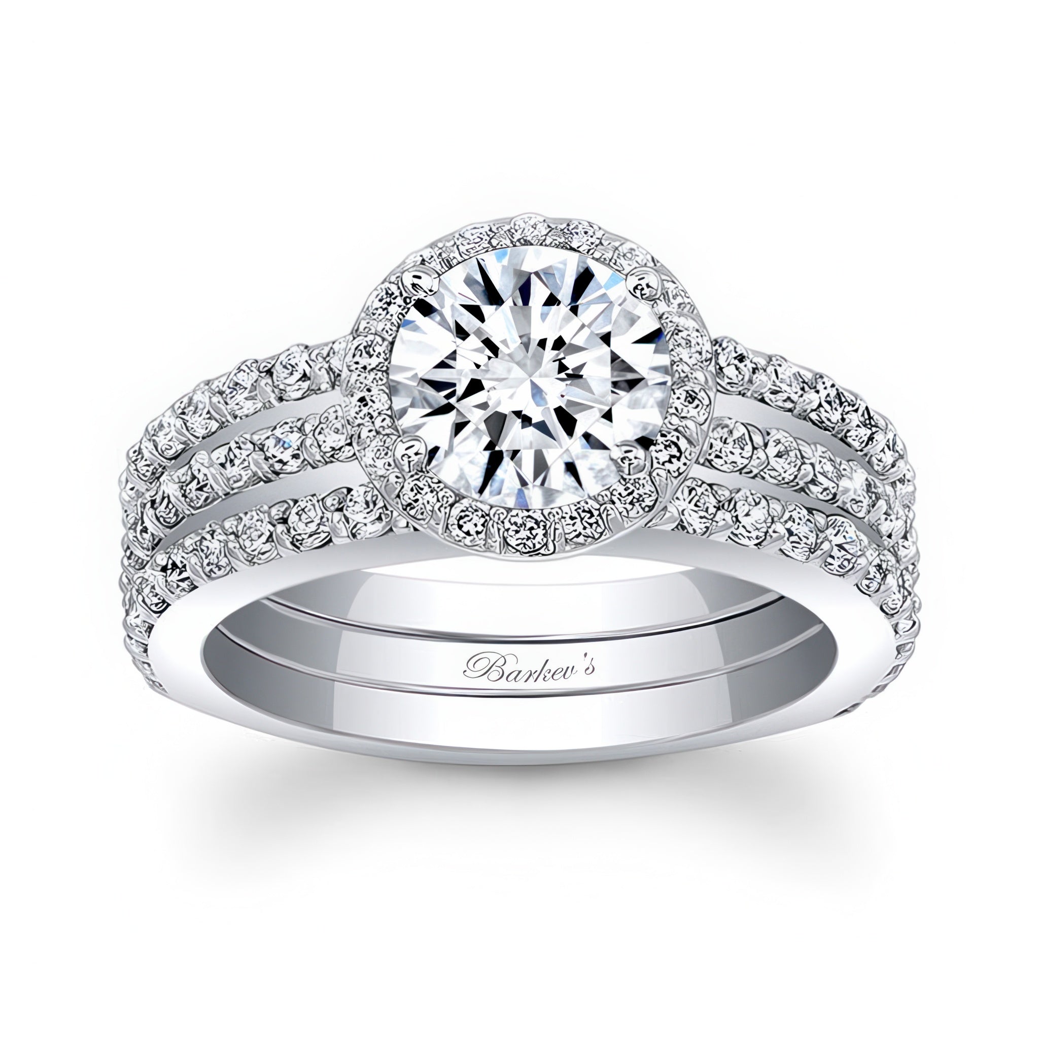 This 3 piece moissanite halo wedding ring set features a round center with a halo encircling it and diamonds cascading down the dainty shank for a look of sheer elegance. Comes with two matching wedding bands.