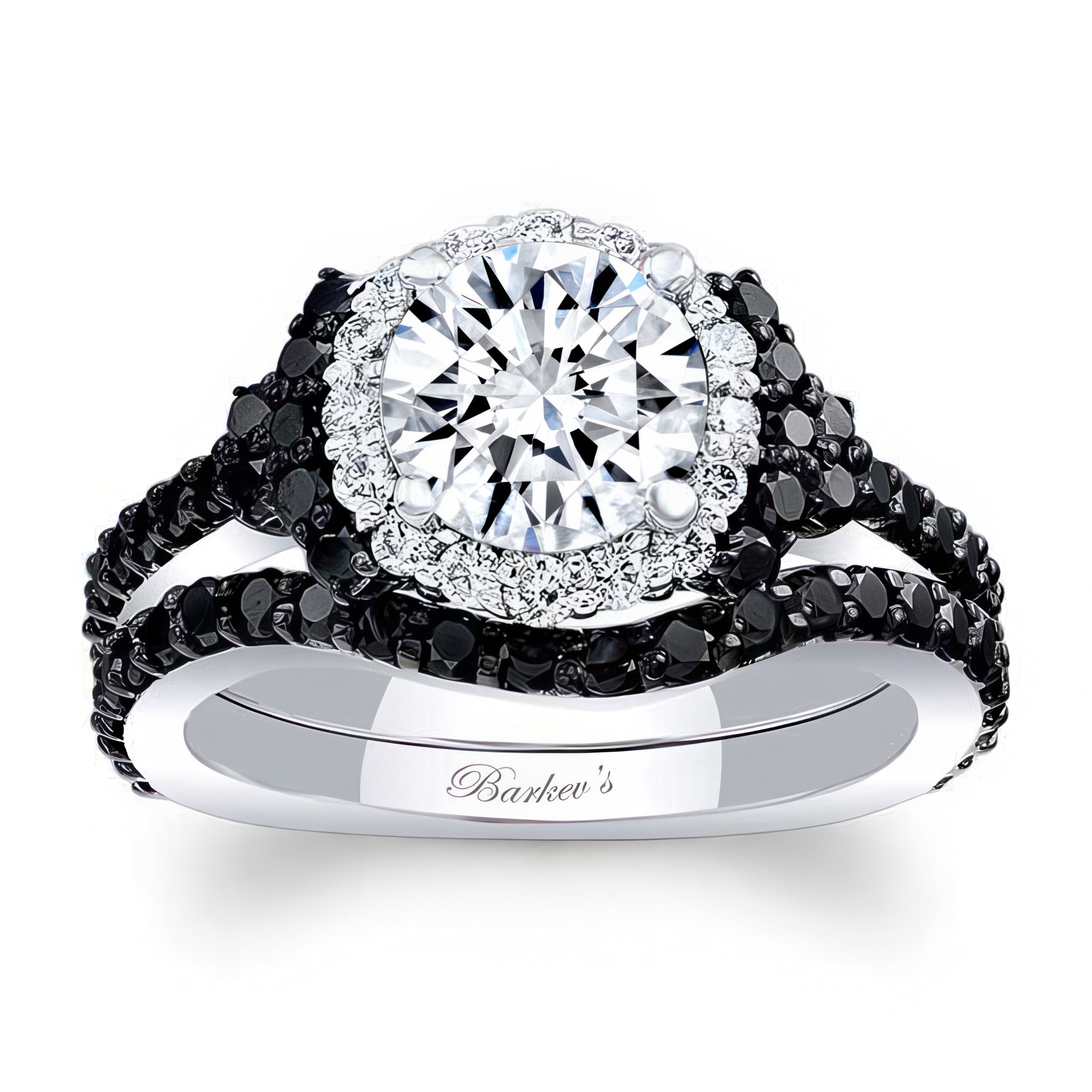 This black diamond accent moissanite cluster wedding ring set features a prong set round moissanite center with a diamond halo and shared prong set black diamonds flowing down the shank. Comes with a matching wedding band.
