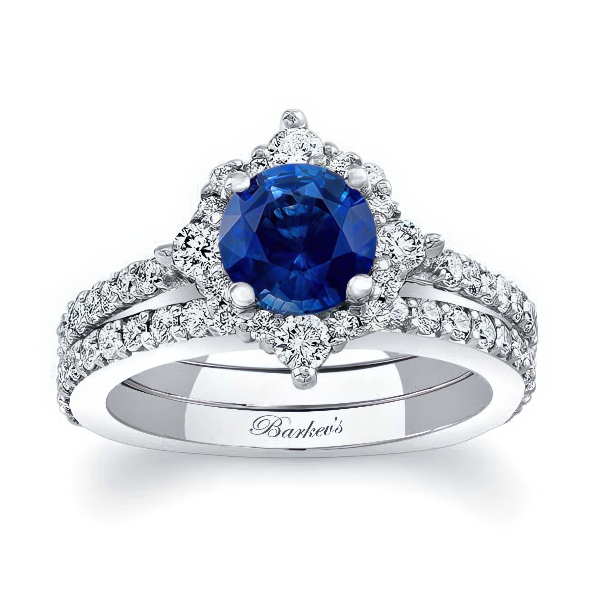 This classic halo blue sapphire and diamond bridal set features a prong set round center artfully embellished with diamonds for a twist on the traditional halo ring. The narrow shank is set with shared prong set diamonds for an elegant finish. Comes with a matching wedding band.