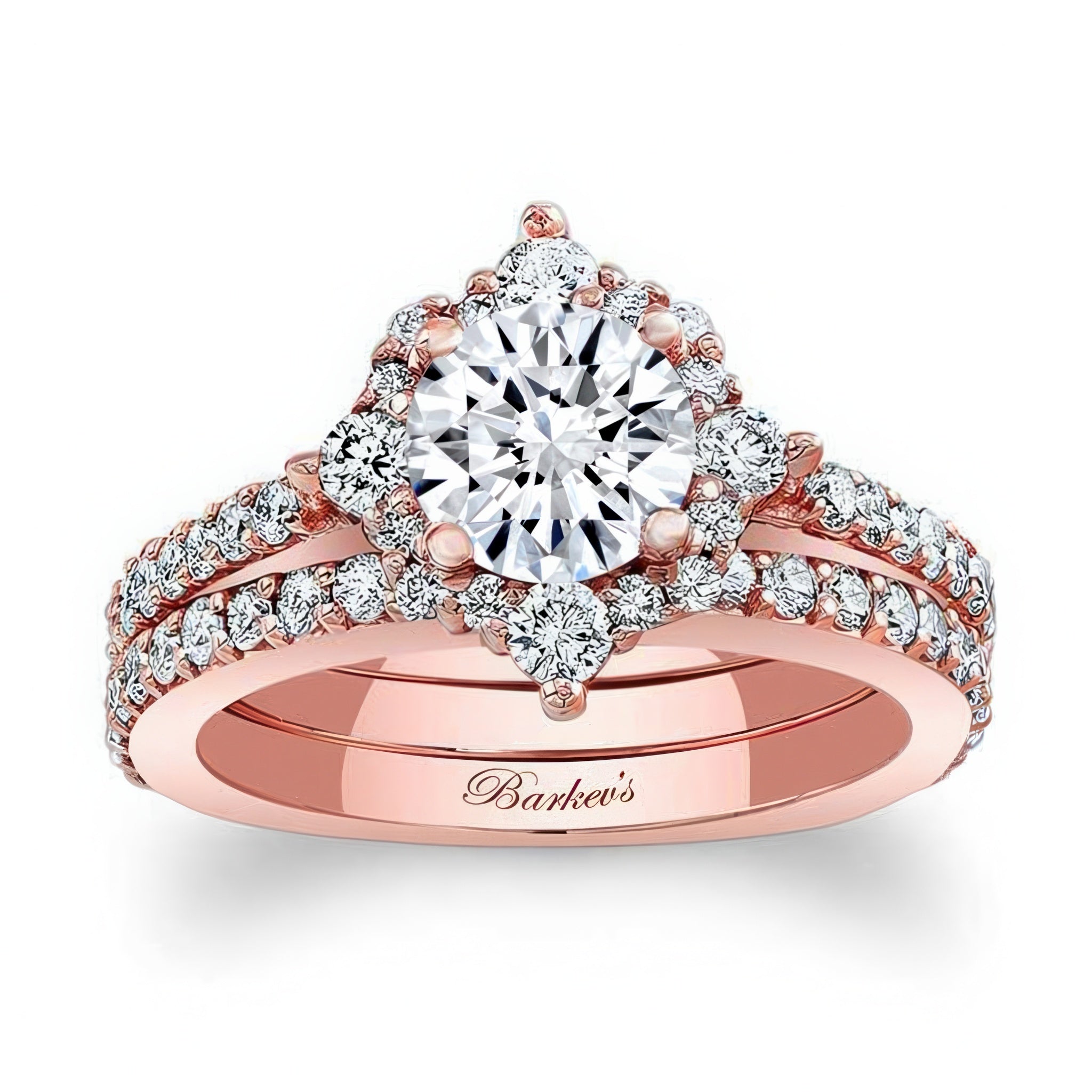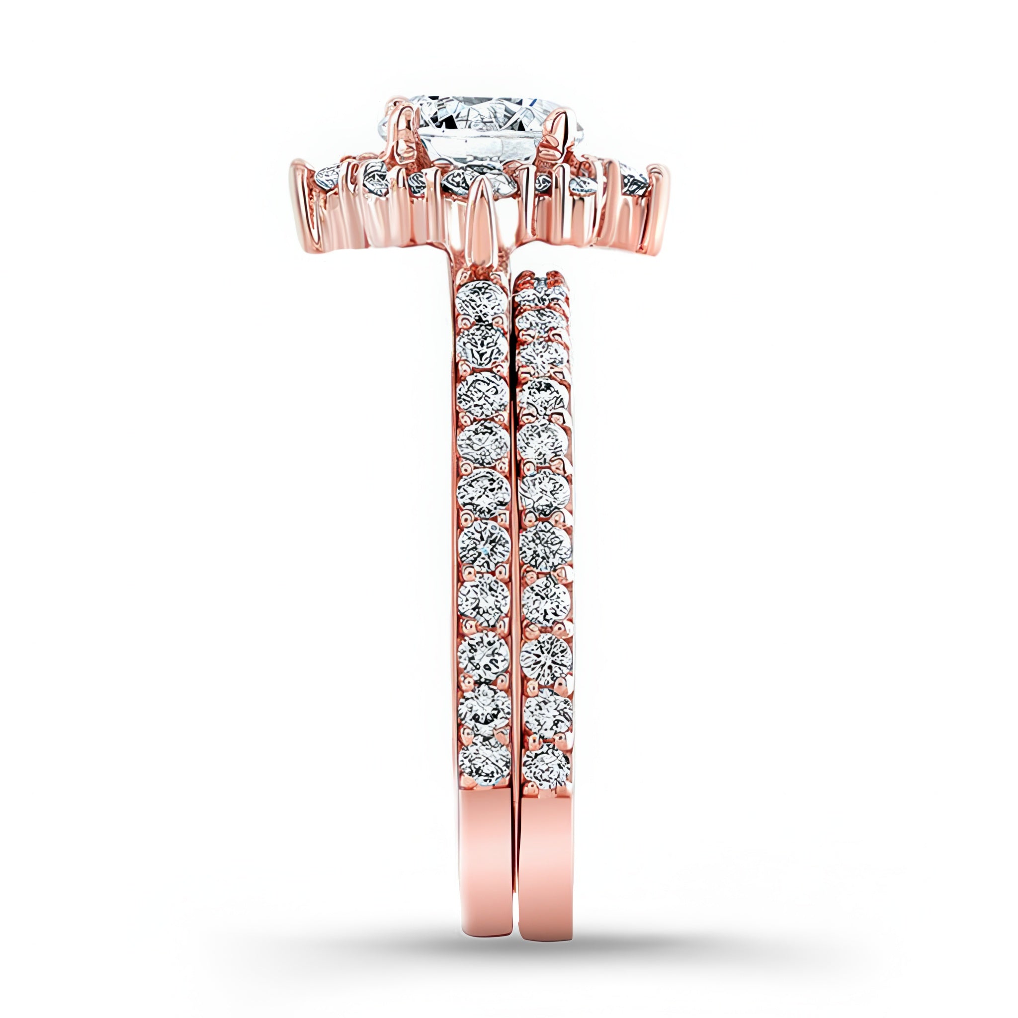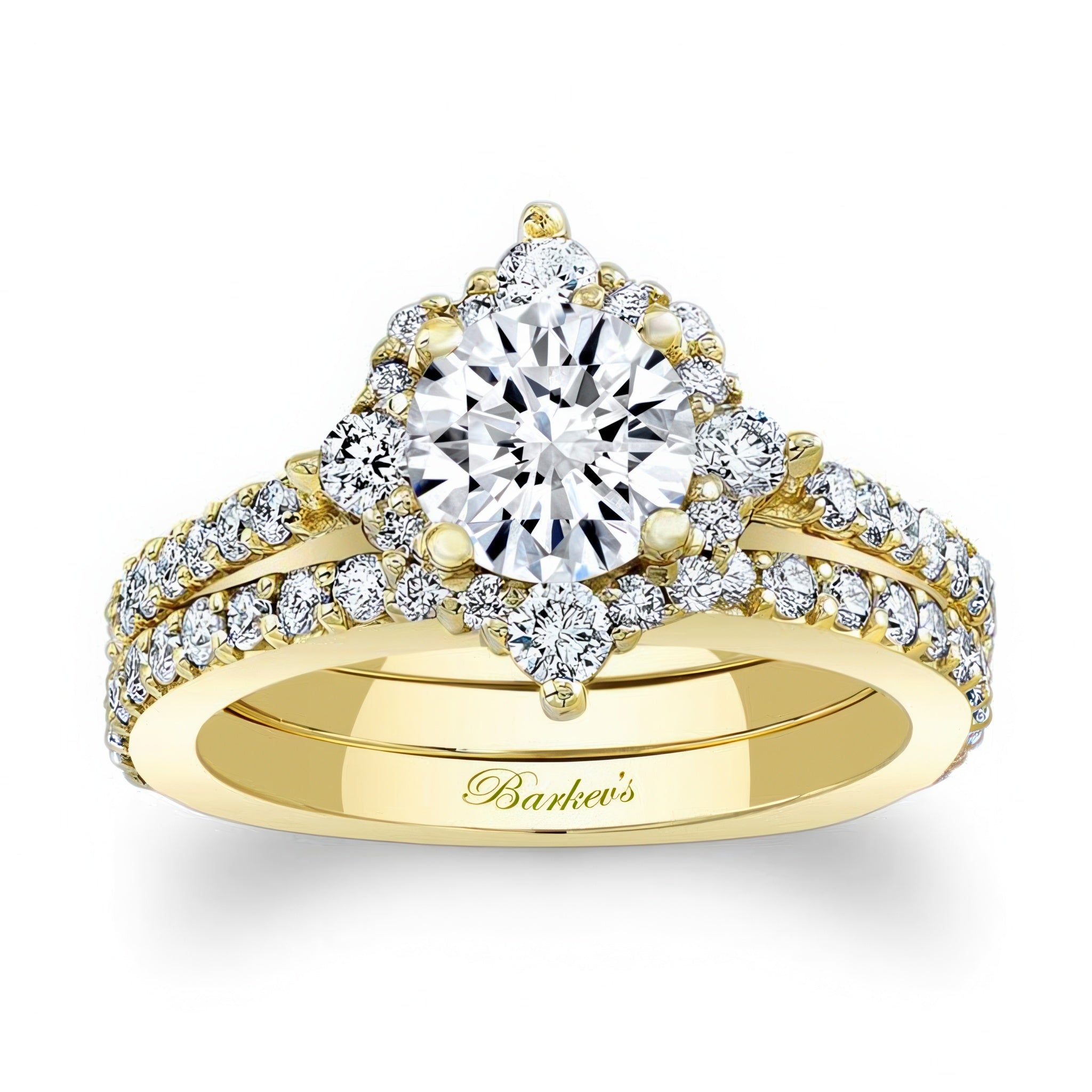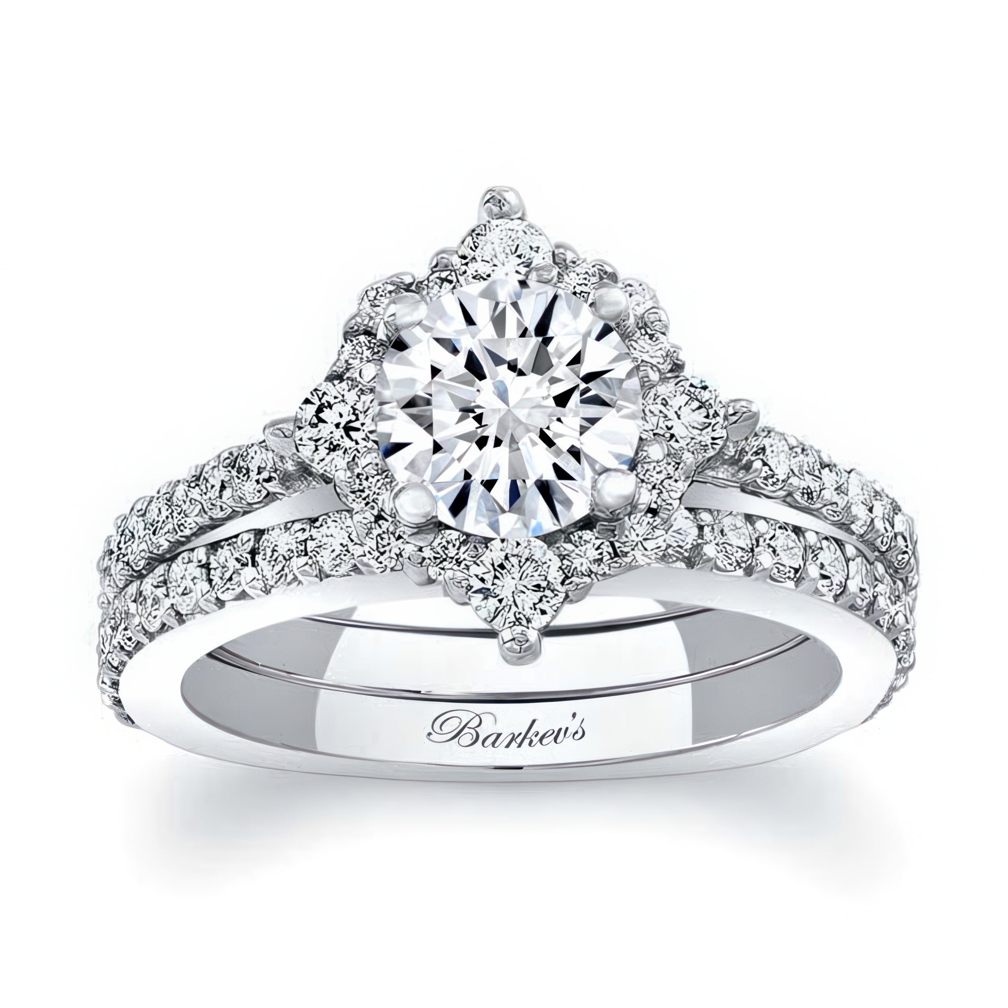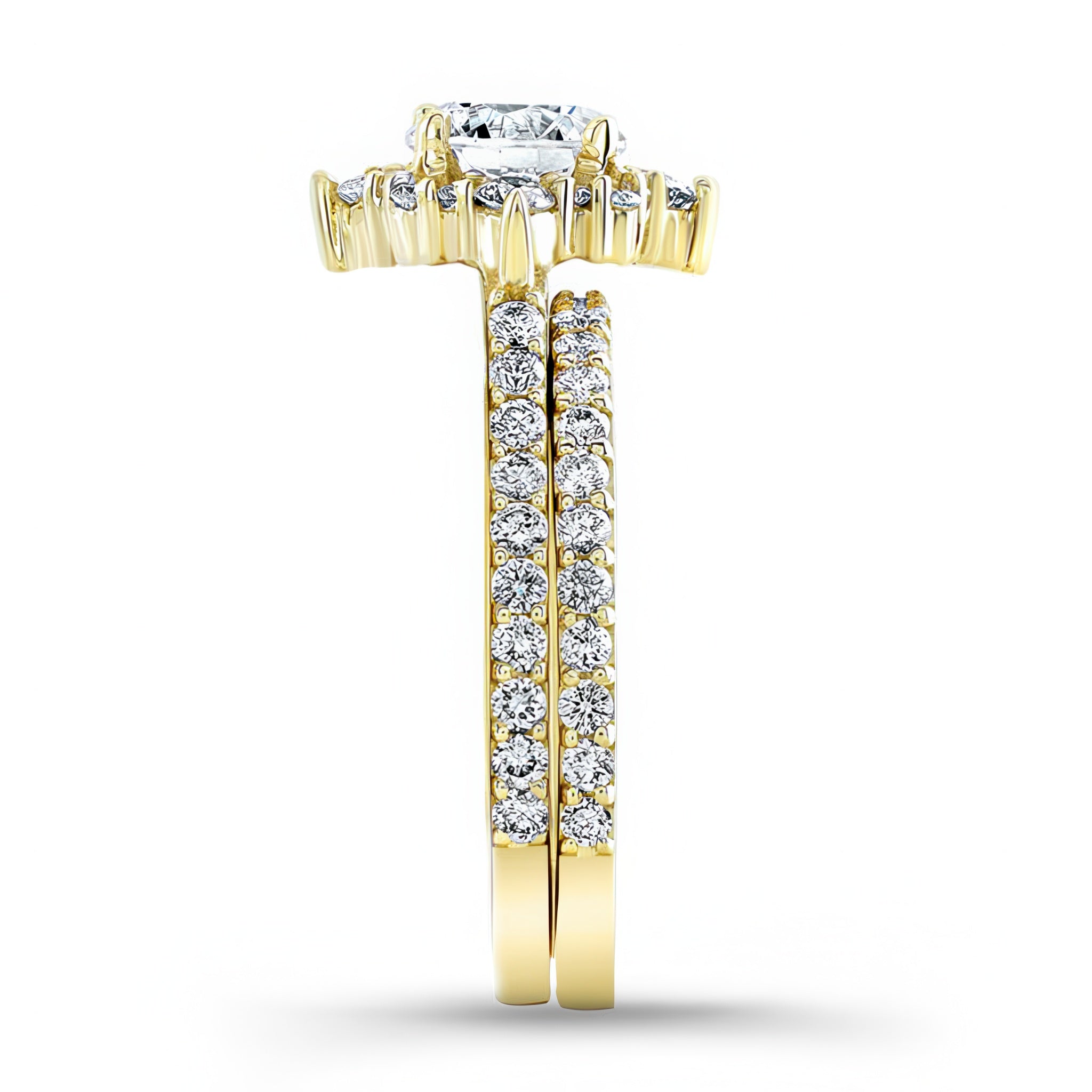 This classic halo moissanite bridal set features a prong set round center artfully embellished with diamonds for a twist on the traditional halo ring. The narrow shank is set with shared prong set diamonds for an elegant finish. Comes with a matching wedding band.