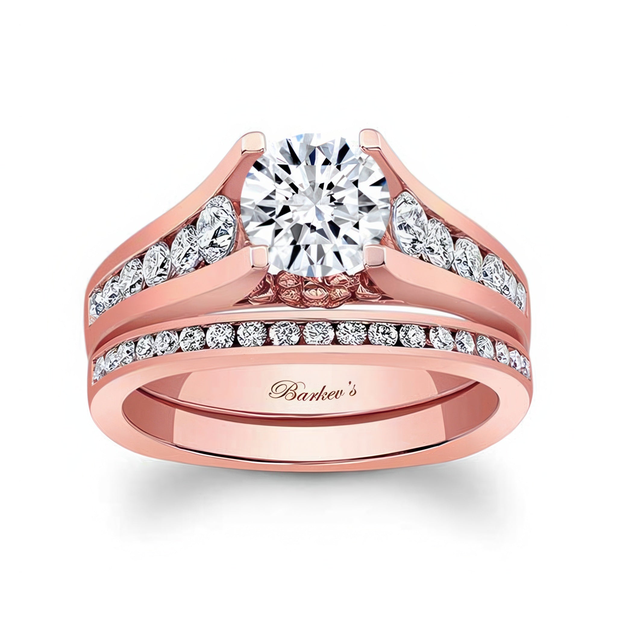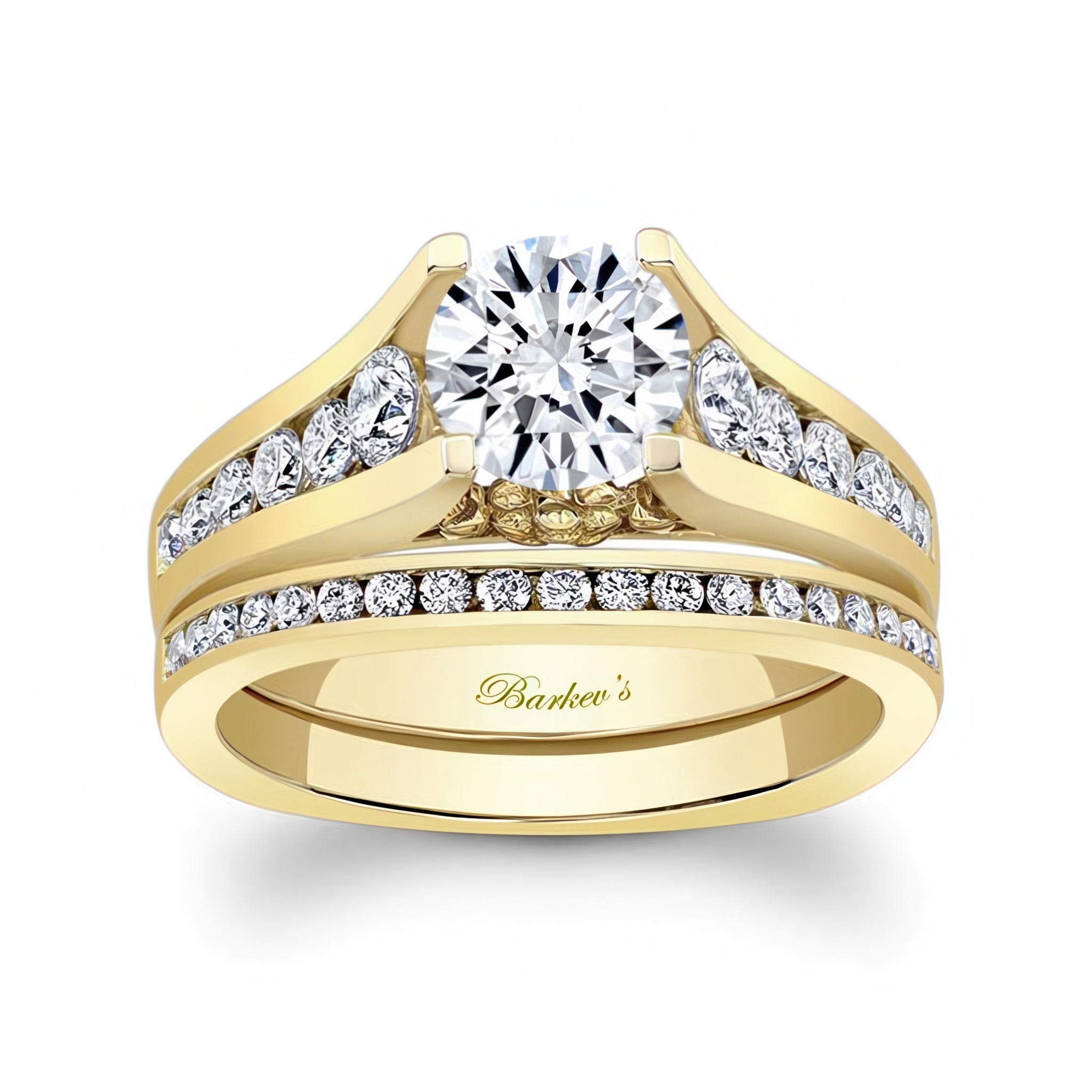 This classic moissanite channel bridal set features a prong set round center with channel set diamonds graduating down the shank. Comes with a matching diamond wedding band for a traditional feel.
