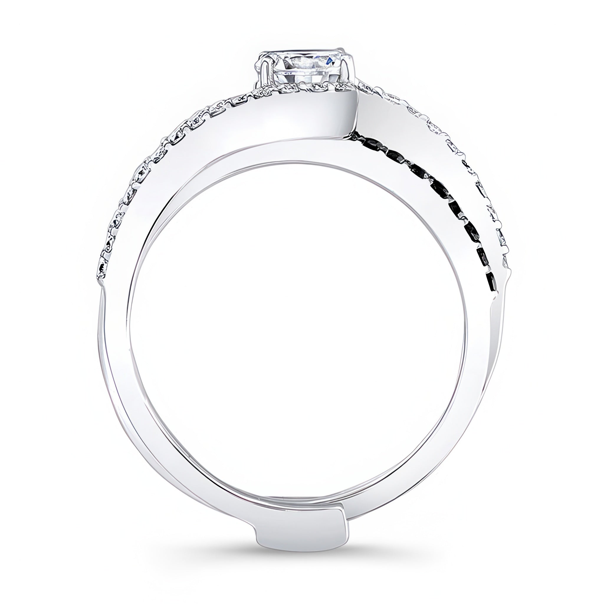 This half carat moissanite black diamond accent bridal set features a prong set round center with pave diamonds and a black diamond wedding band that slips in between the split shank.
