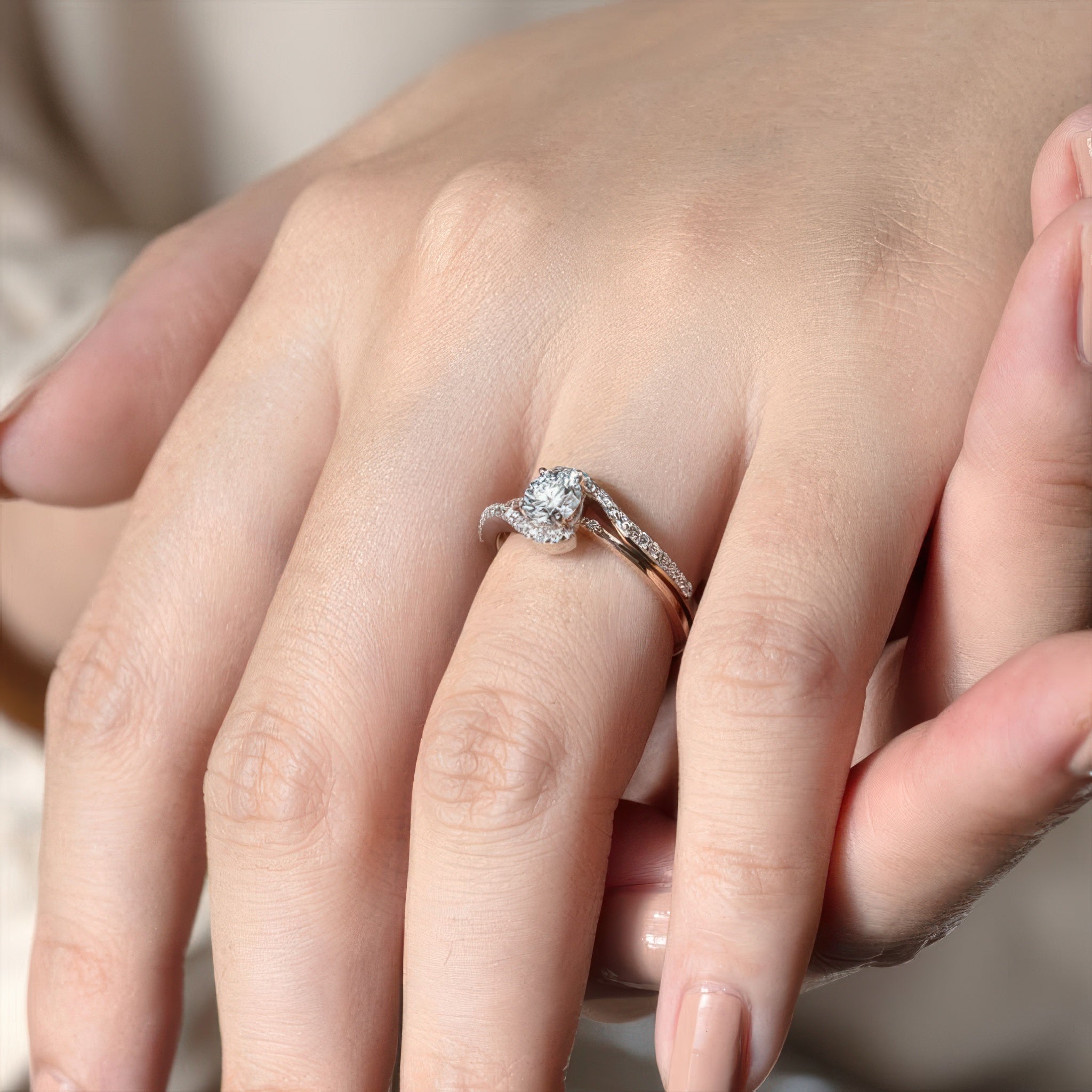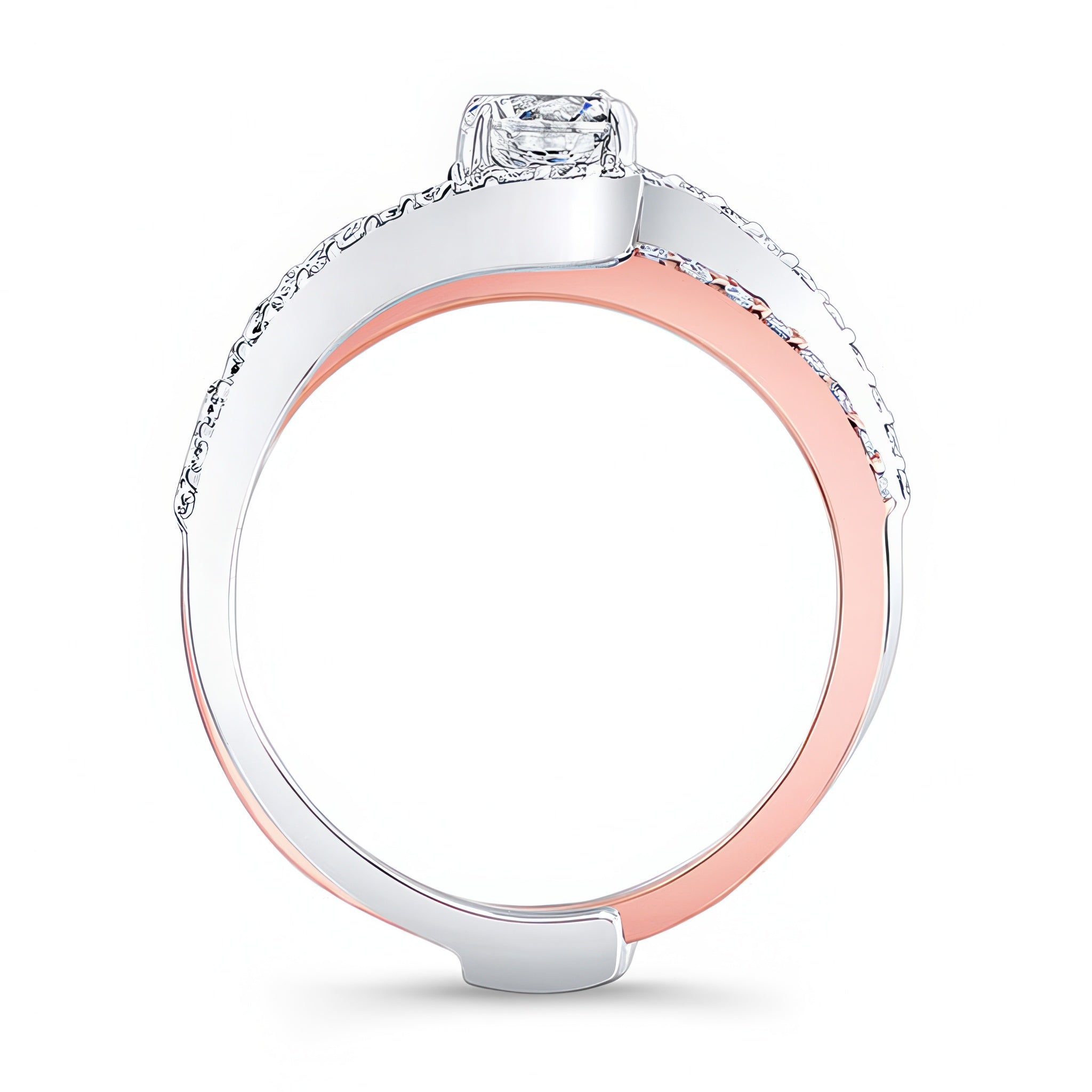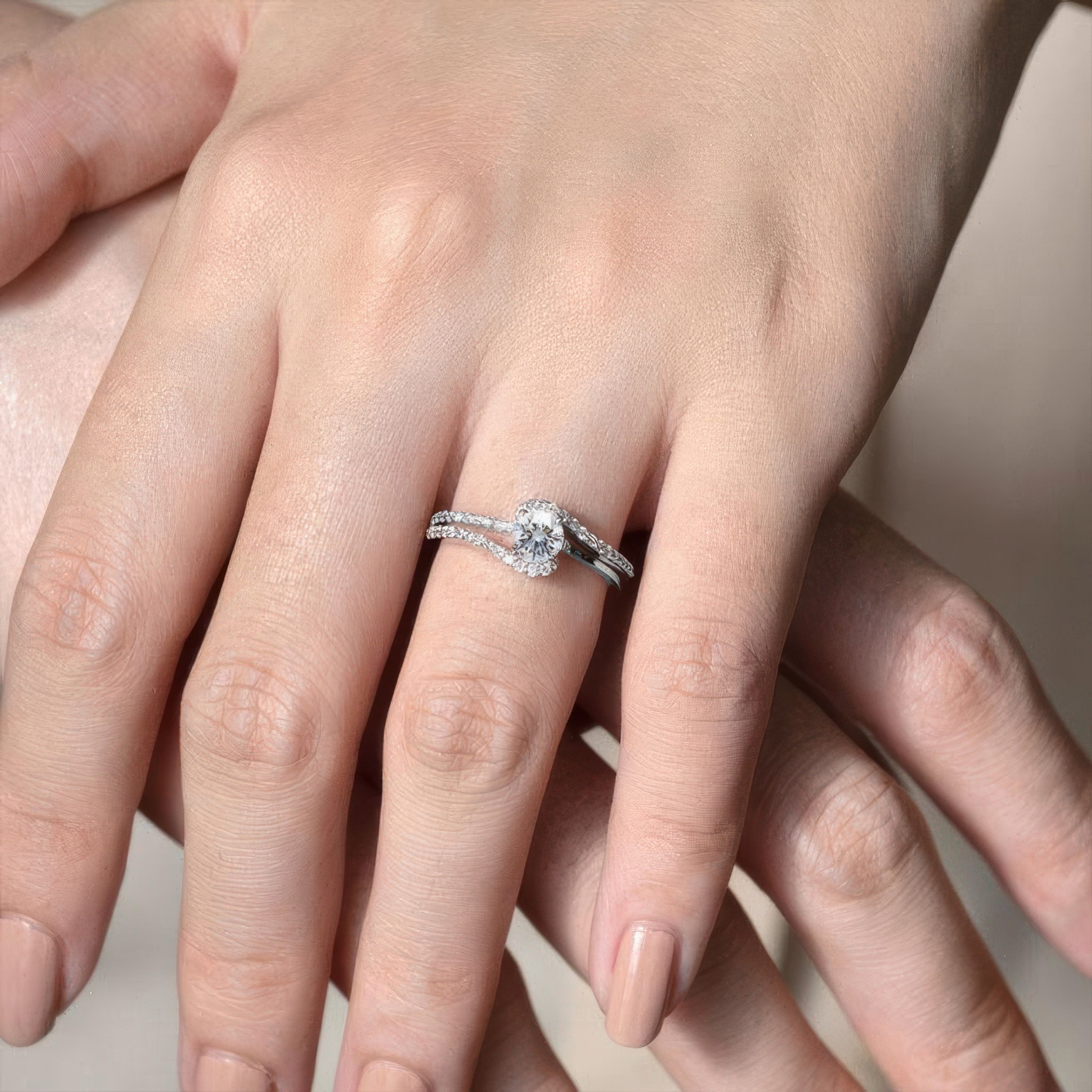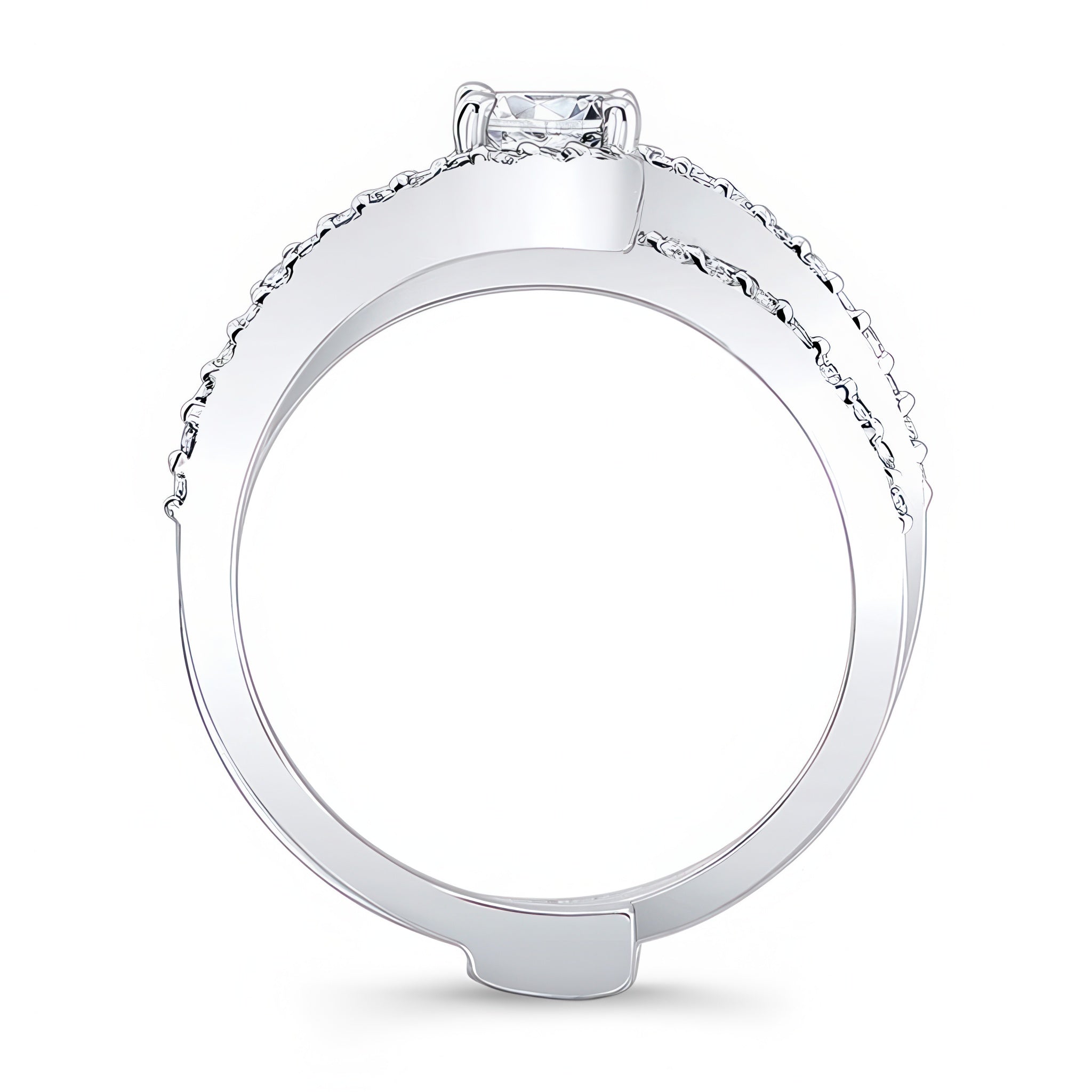 This half carat moissanite bridal set features a prong set round center with pave diamonds and a diamond wedding band that slips in between the split shank.