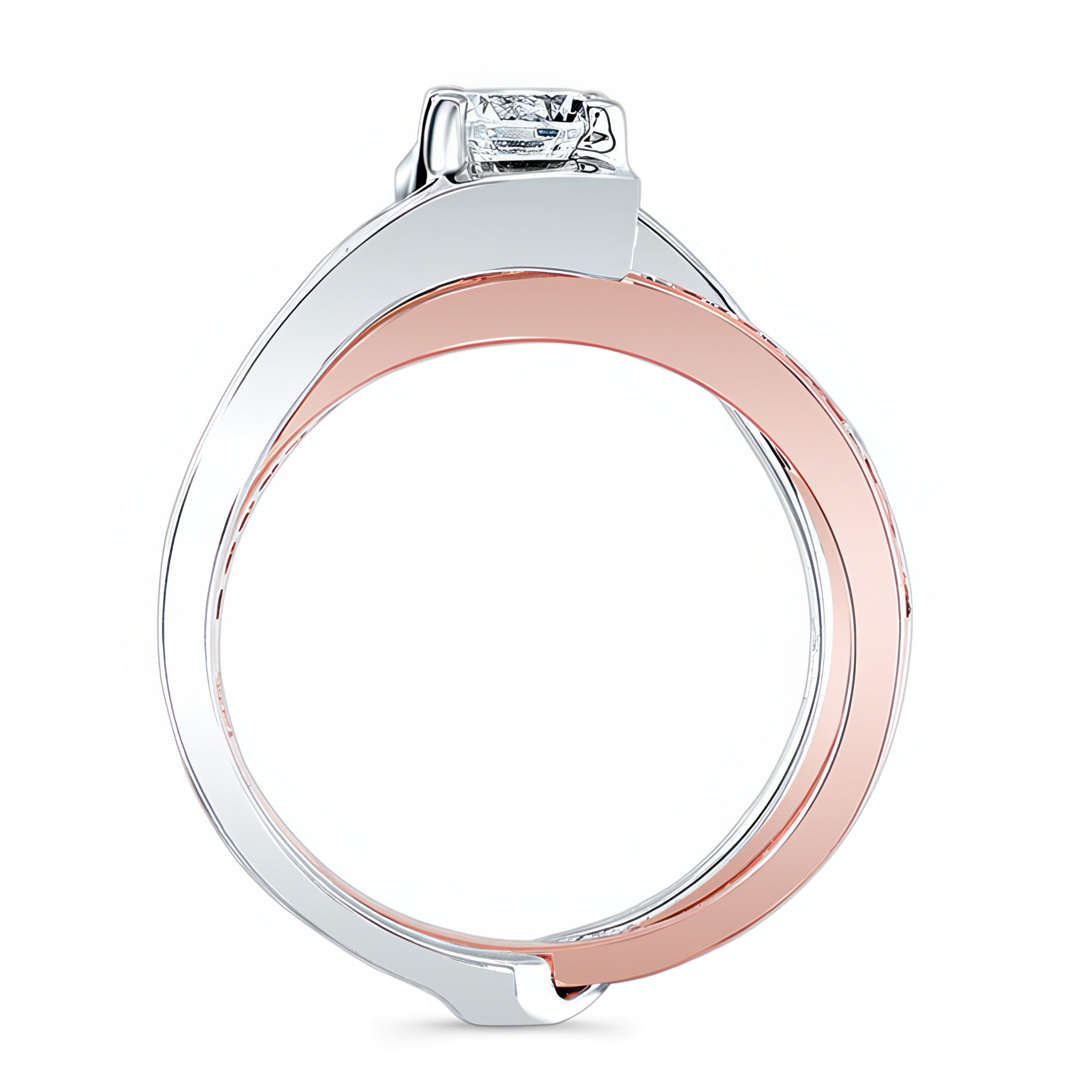 This half carat moissanite solitaire wedding set features a solitaire ring sporting a prong set round center with an interlocking channel set diamond wedding band for a sophisticated look.